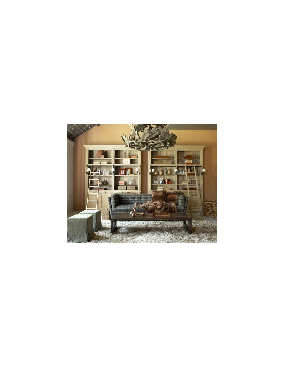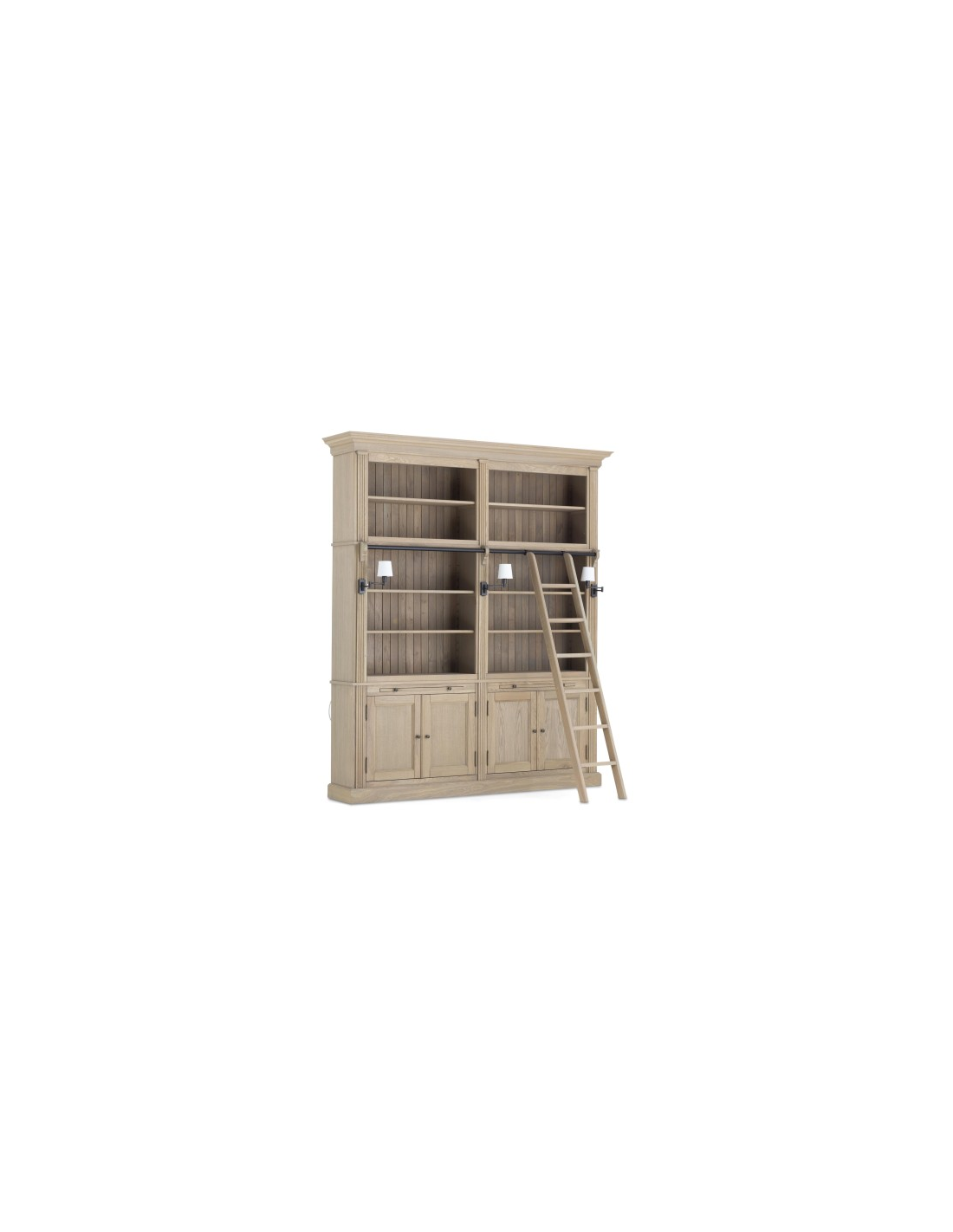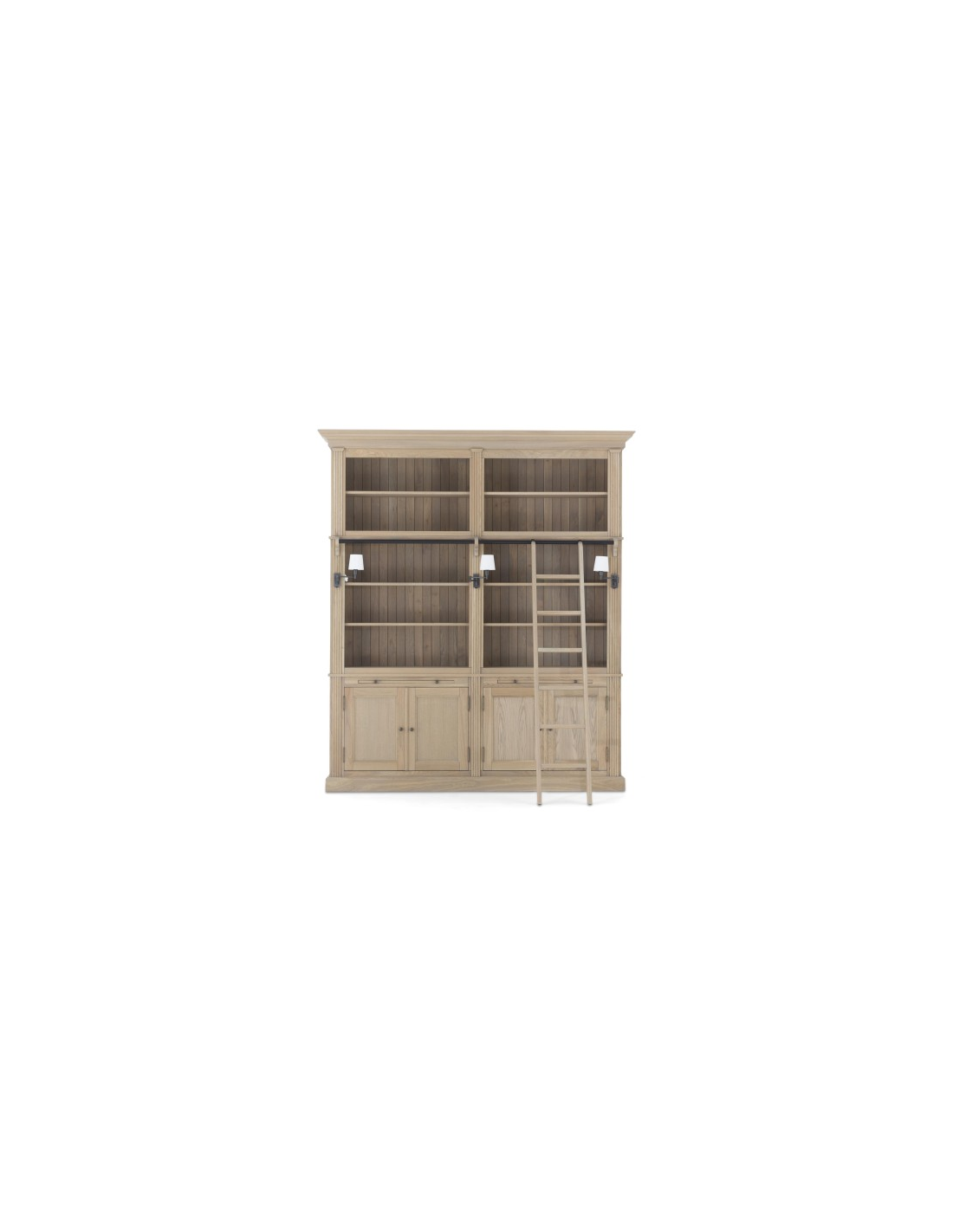 FLAMANT BALMORE Vitrineskab udført i et design fremstillet af antik egetræ og sortlakeret jern. Vitrineskabet kommer med 1 stige samt 3 lamper der sidder på selve vitrineskabet (Ekskl. skærme). Stigen kan flyttes til siderne via den sorte jernstang. I vitrineskabet er der 10 åbne hylderum med justerbare hylder. I bunden forefindes 2 skabslåger, der gemmer på 2 x 2 hylderum. Vitrineskabet måler 248 cm i højden og 218 x 44 cm i bredde og dybde.