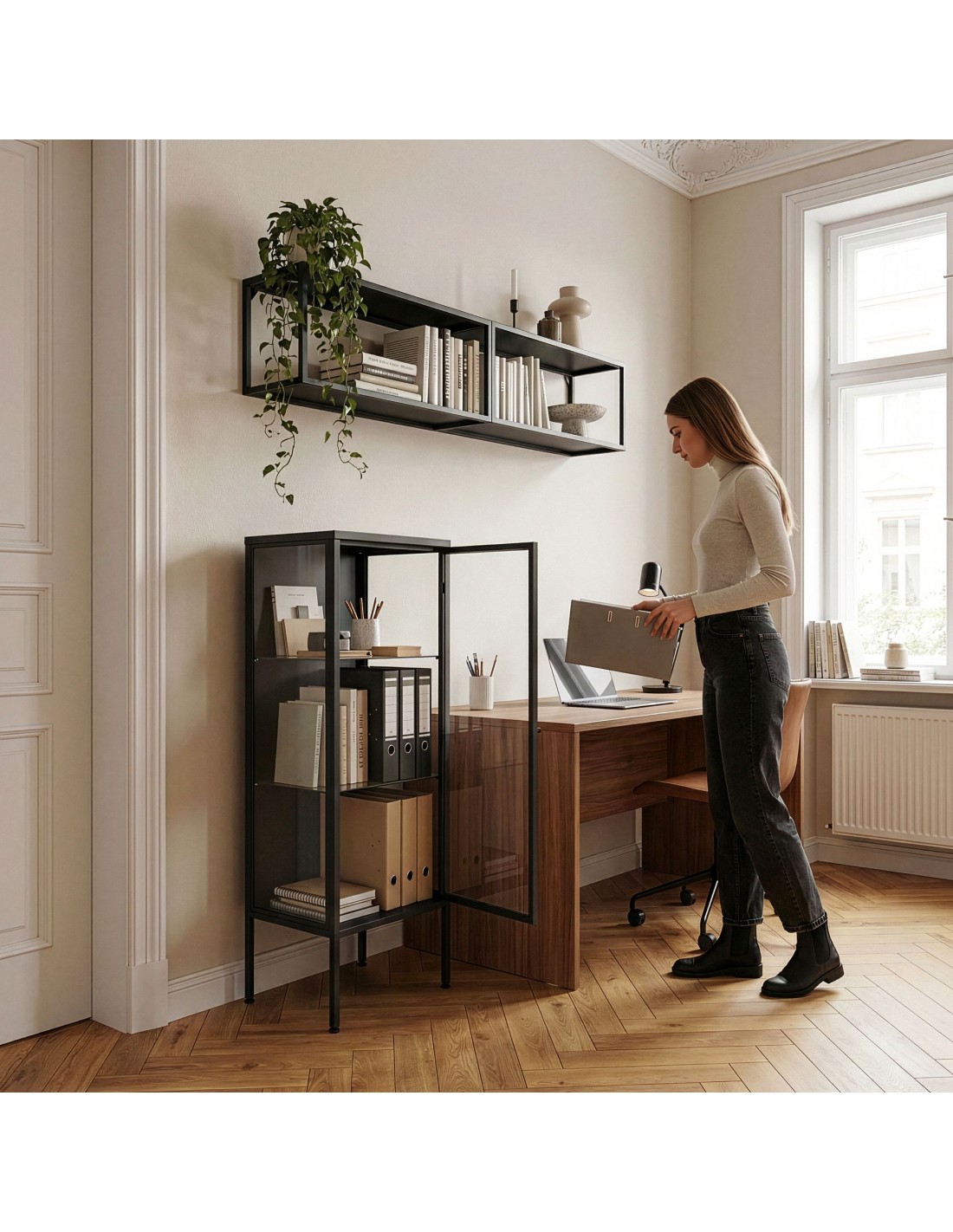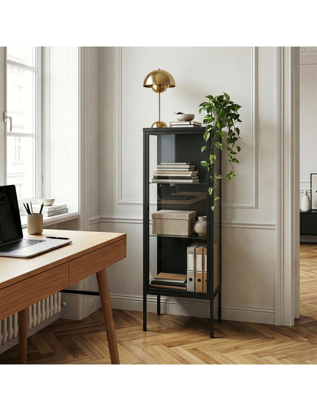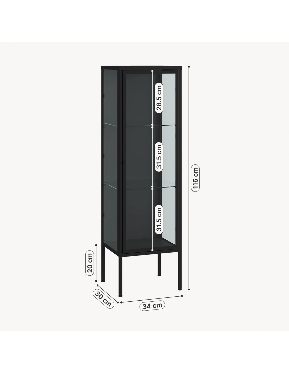 Smalt vitrineskab udført i et design af sortlakeret stål og klart glas. Vitrineskabet indeholder 3 hylderum og måler 116 cm i højden og 34 x 30 cm i bredde og dybde.
