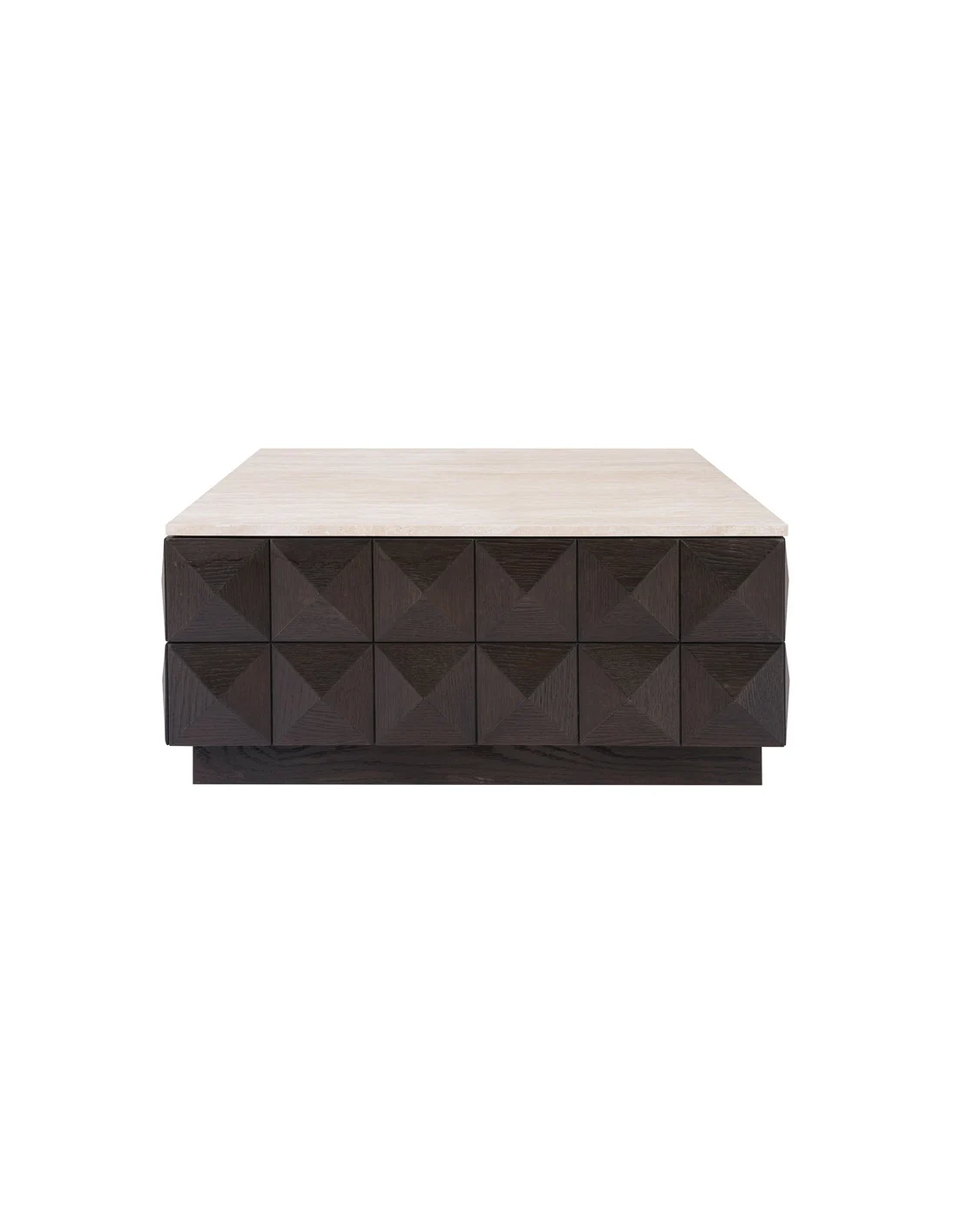 Claremont sofabord fra hollandske Richmond Interiors, udført i et design af brunlakeret egetræsfinér og travertin. Sofabordet måler 40 cm i højden og 90 x 90 cm i bredde og dybde.