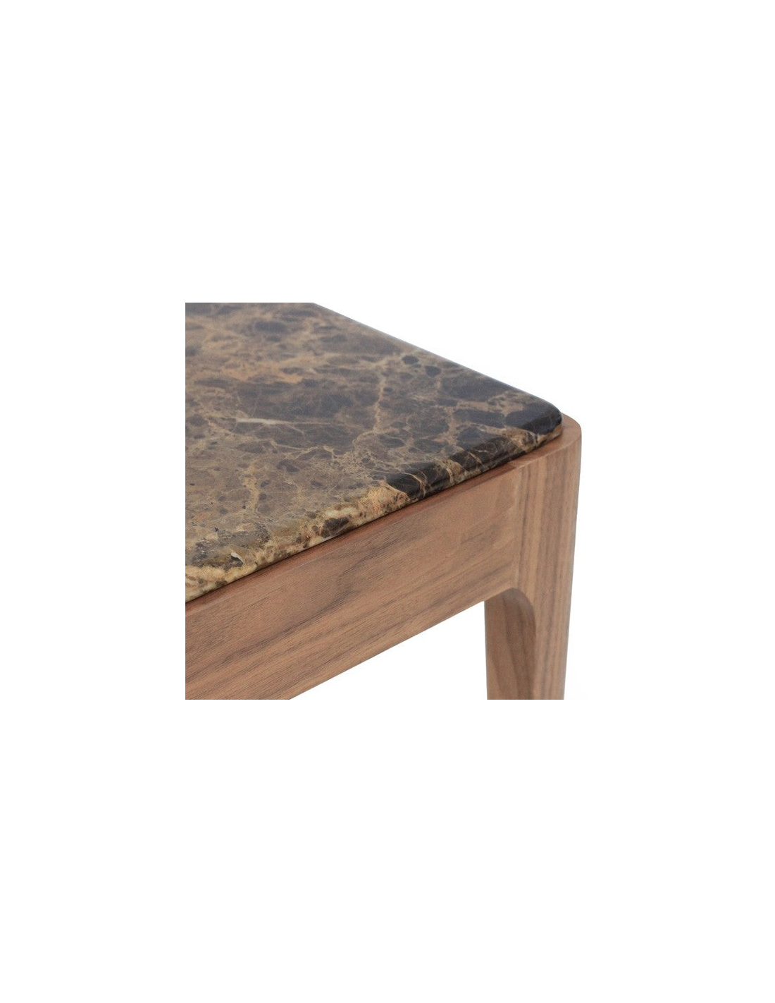 AZTECA Sofabord udført i et moderne design, fremstillet i et design af valnøddefinér og brun marmor. Sofabordet måler 40 cm i højden og 120 x 75 cm i bredde og dybde.
