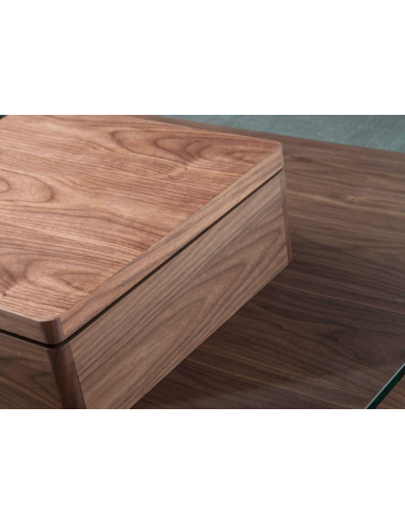 Firkantet sofabord udført i et moderne design fra Angel Cerdá. Sofabordet er fremstillet af valnøddefinér og klart hærdet glas og måler 35 cm i højden og 100 x 100 cm i bredde og dybde.
