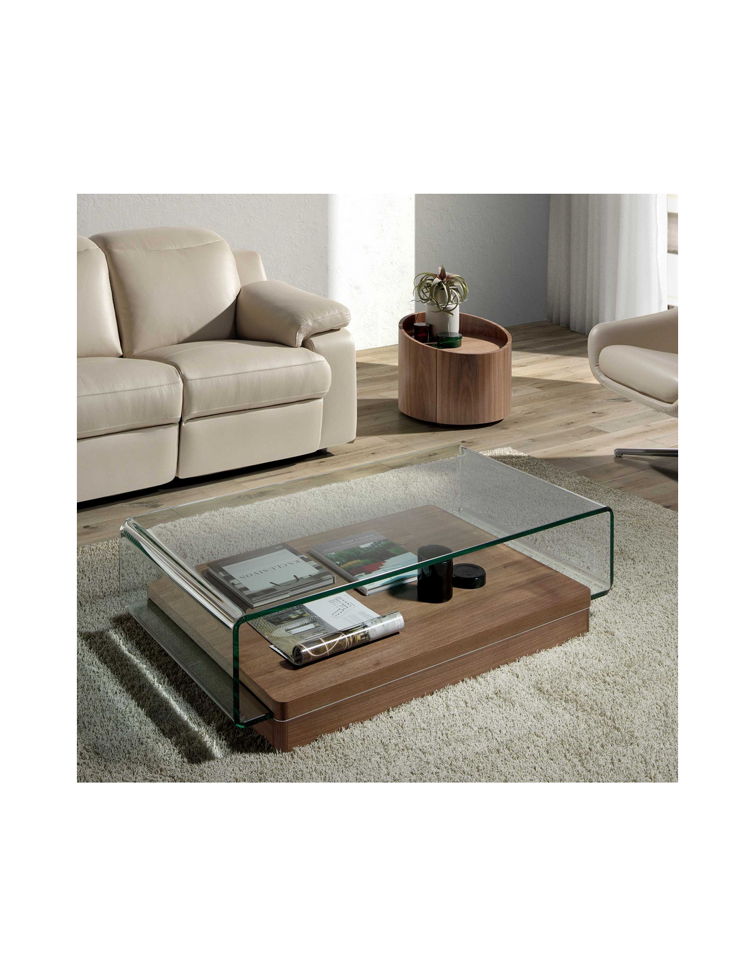 Sofabord i valnøddefinér og glas H33 x B120 x D70 cm - Valnød/Klar
