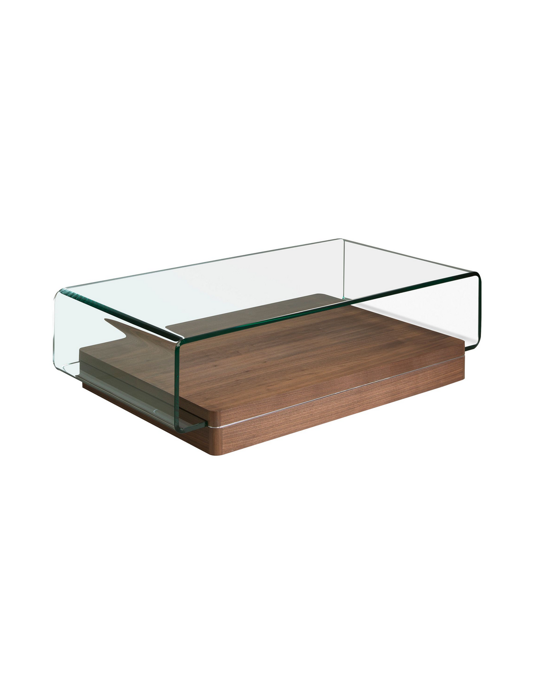 Sofabord udført i et moderne design fra Angel Cerdá. Sofabordet er fremstillet af valnøddefinér og klart hærdet glas. Bordet måler 33 cm i højden og 120 x 70 cm i bredde og dybde.