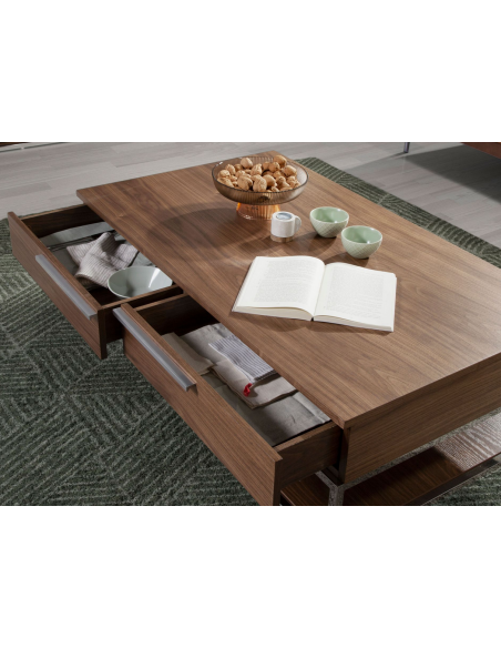 Sofabord med 2 x skuffer, udført i et moderne design fra Angel Cerdá. Sofabordet er fremstillet af valnøddefinér og kromlakeret stål. Bordet måler 37 cm i højden og 120 x 70 cm i bredde og dybde.