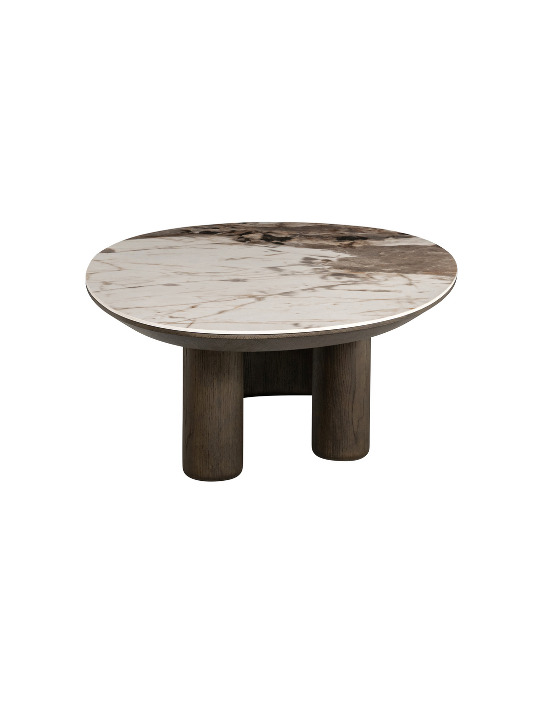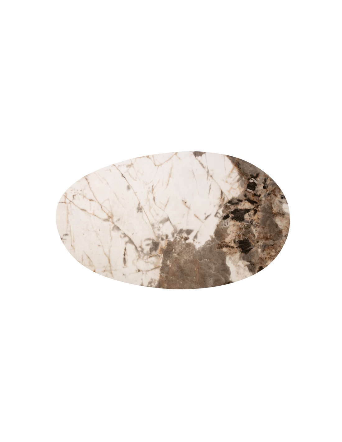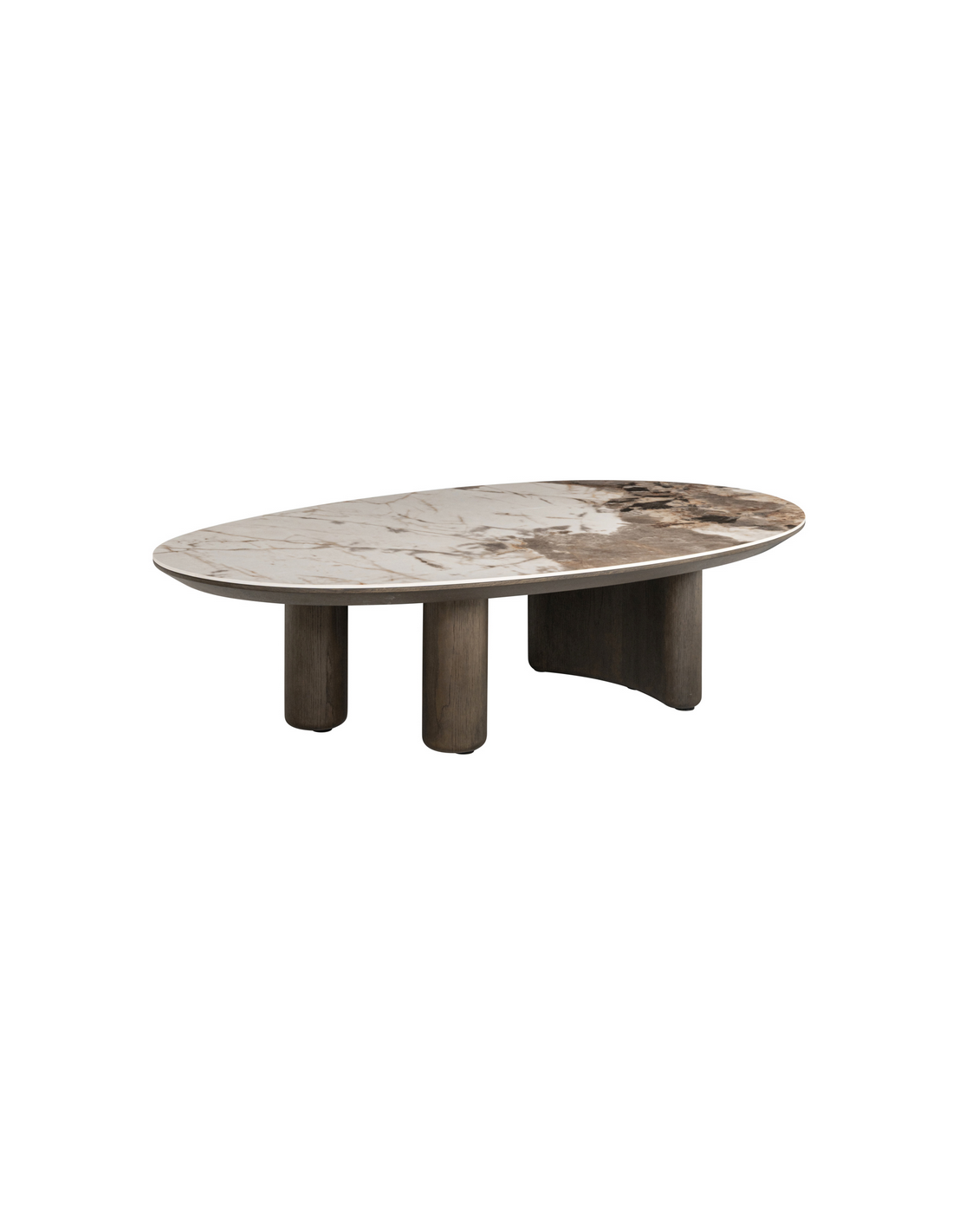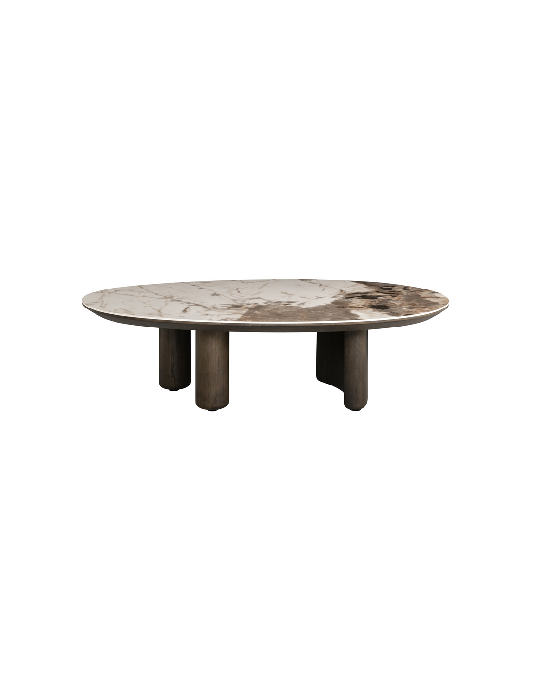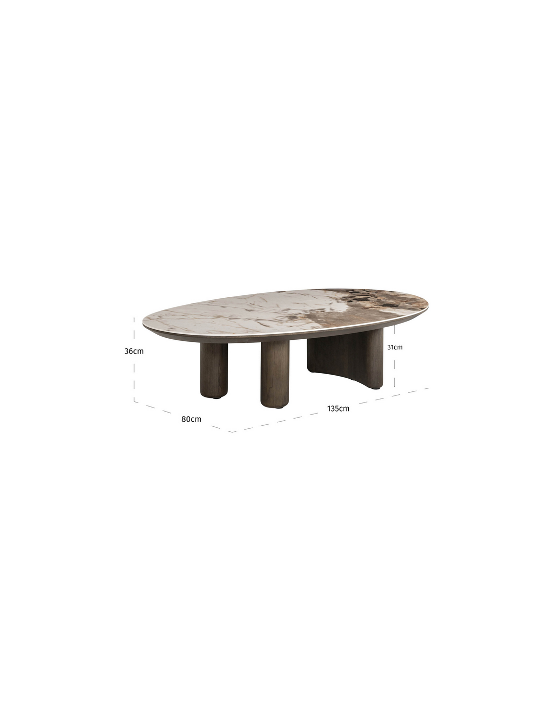 LANGFORD Ovalt sofabord fra hollandske Richmond Interiors, udført i et design af brunlakeret MDF og egetræsfinér med bordplade i brun marmoriseret keramik. Sofabordet måler 36 cm i højden og 135 x 80 cm i bredde og dybde.