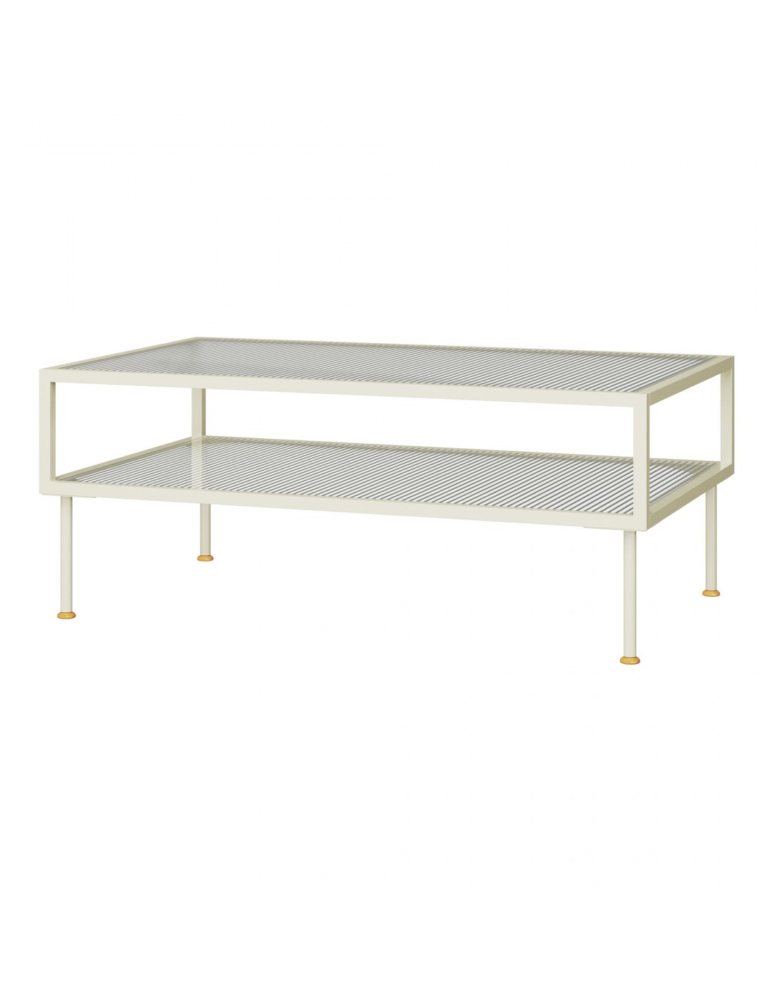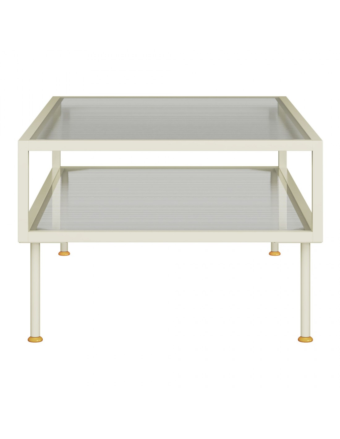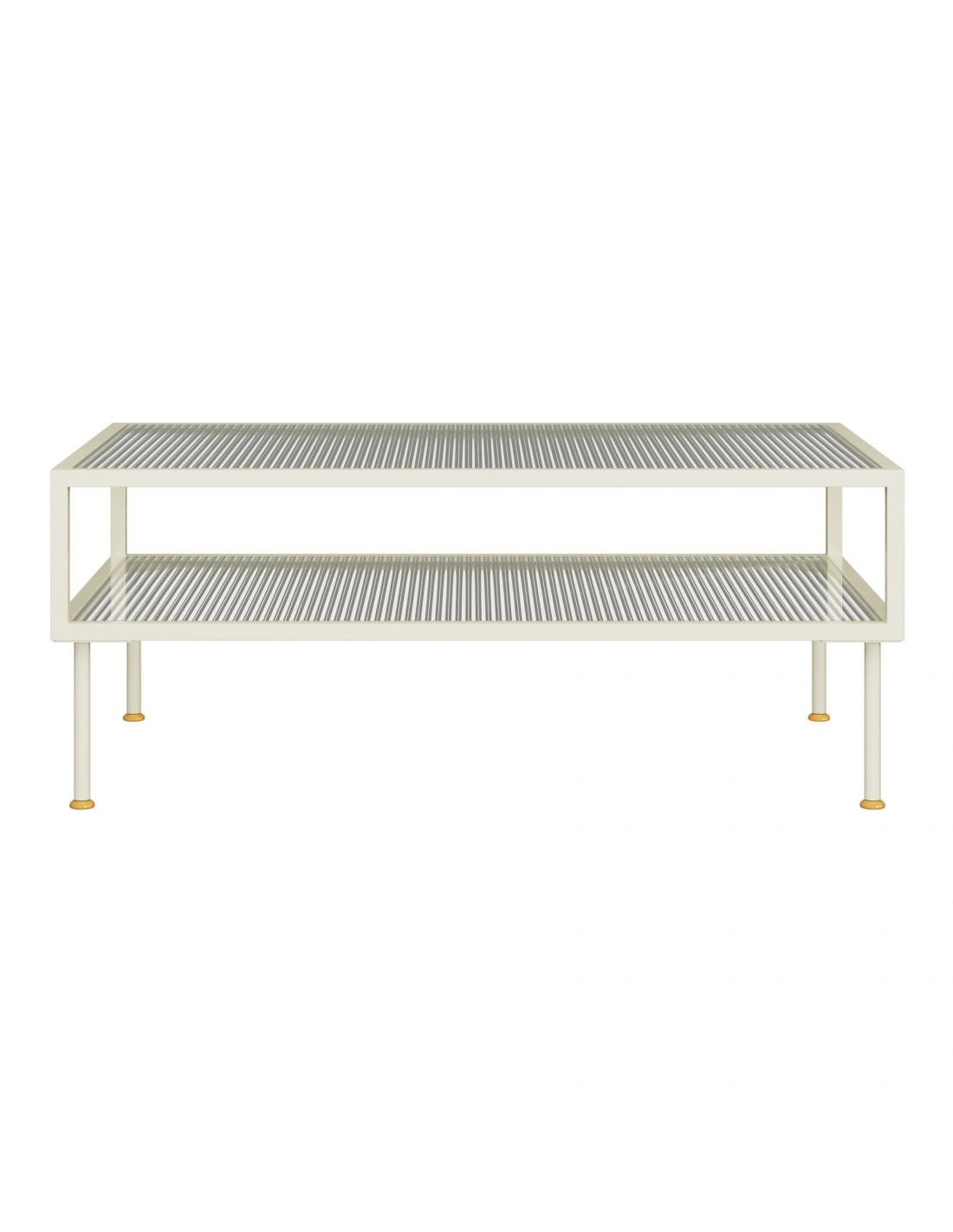 Sofabord med hylde til opbevaring, udført i et design af cremehvid lakeret stål og bordplade og hylde i klart rillet glas. Sofabordet måler 46 cm i højden og 100 x 50 cm i bredde og dybde.