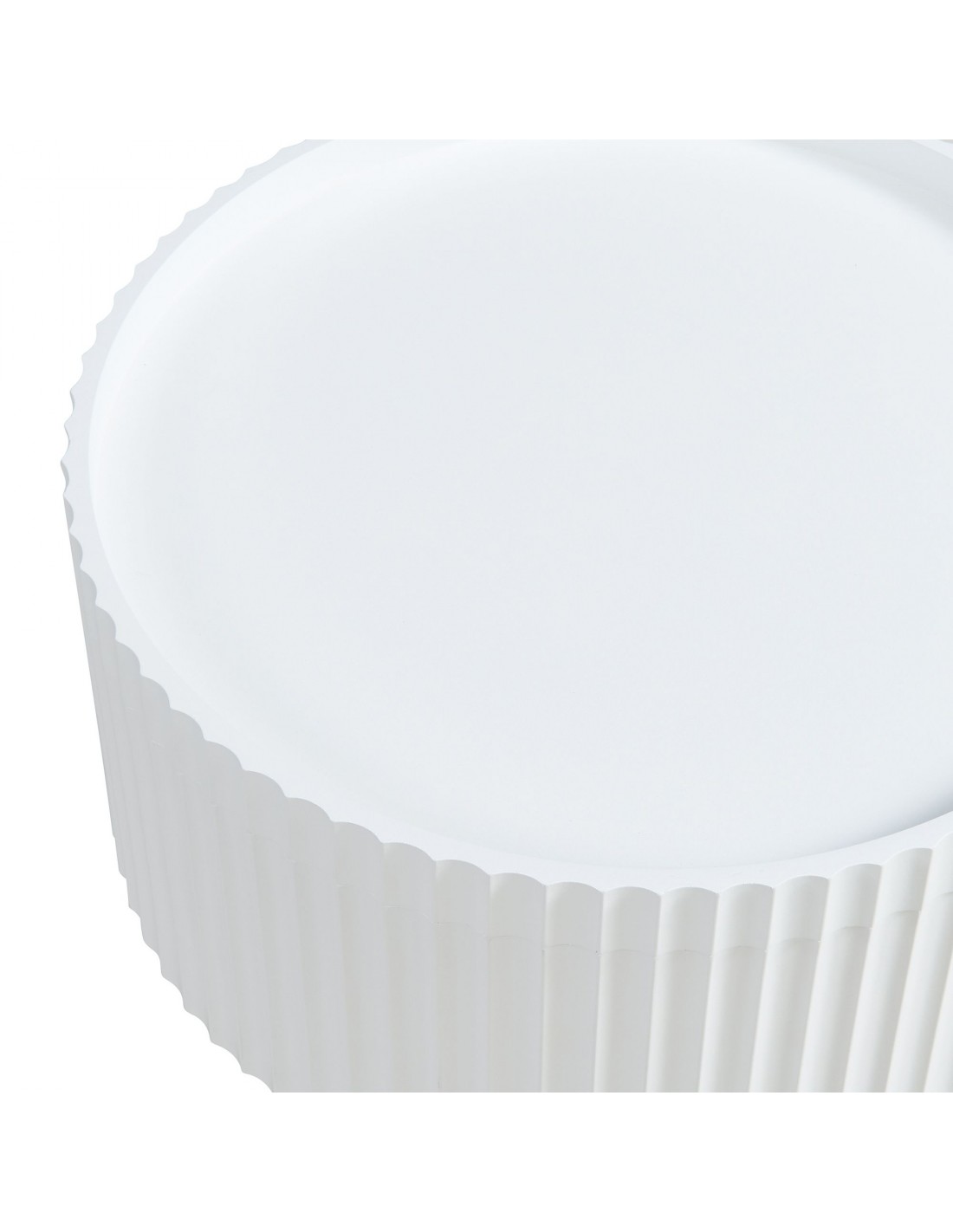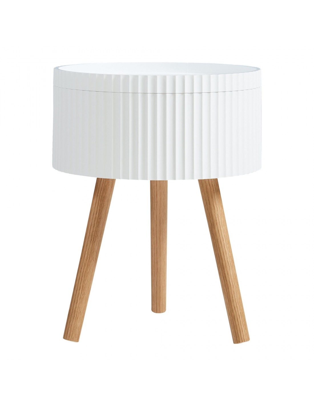Rundt sofabord med opbevaring, udført i et design af hvidlakeret MDF og naturfarvet bambus. Sofabordet måler 48 cm i højden og 38 cm i diameter.