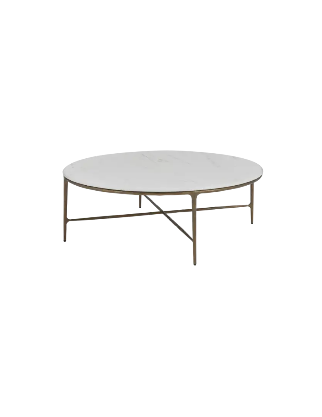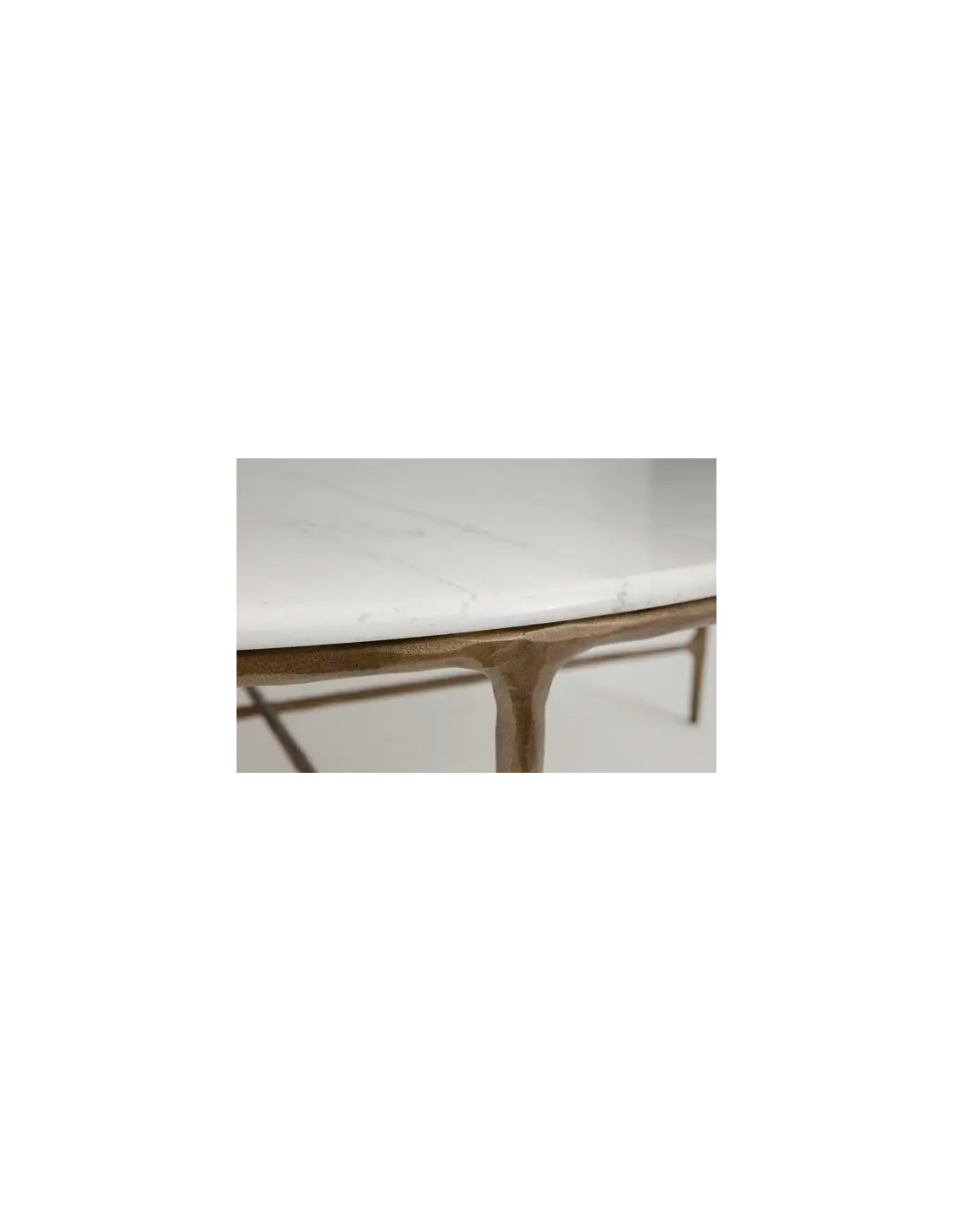 FLAMANT MARABELLE Rundt sofabord udført i et design af hamret antik messinglakeret jern og hvid marmor. Sofabordet måler 38 cm i højden og 120 cm i diameter.