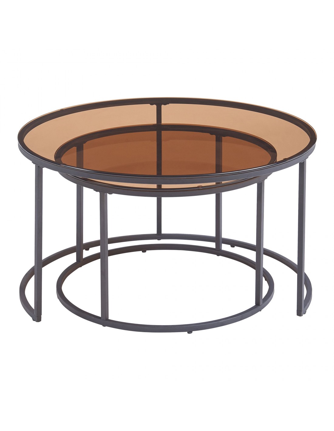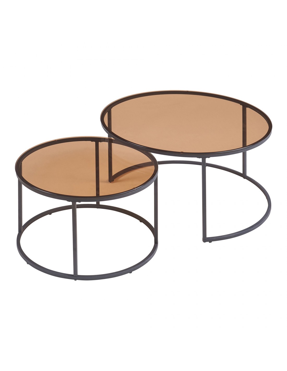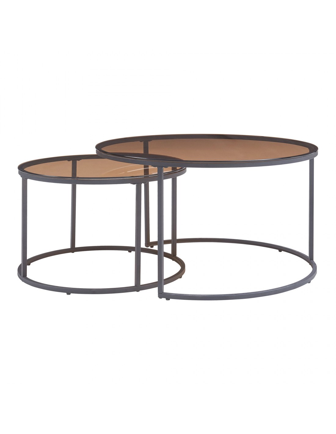 Indskudsborde sofabordssæt udført i et design af sortlakeret metal og røget glas. Sofabordene måler 39 + 45 cm i højden og 60 + 80 cm i diameter.