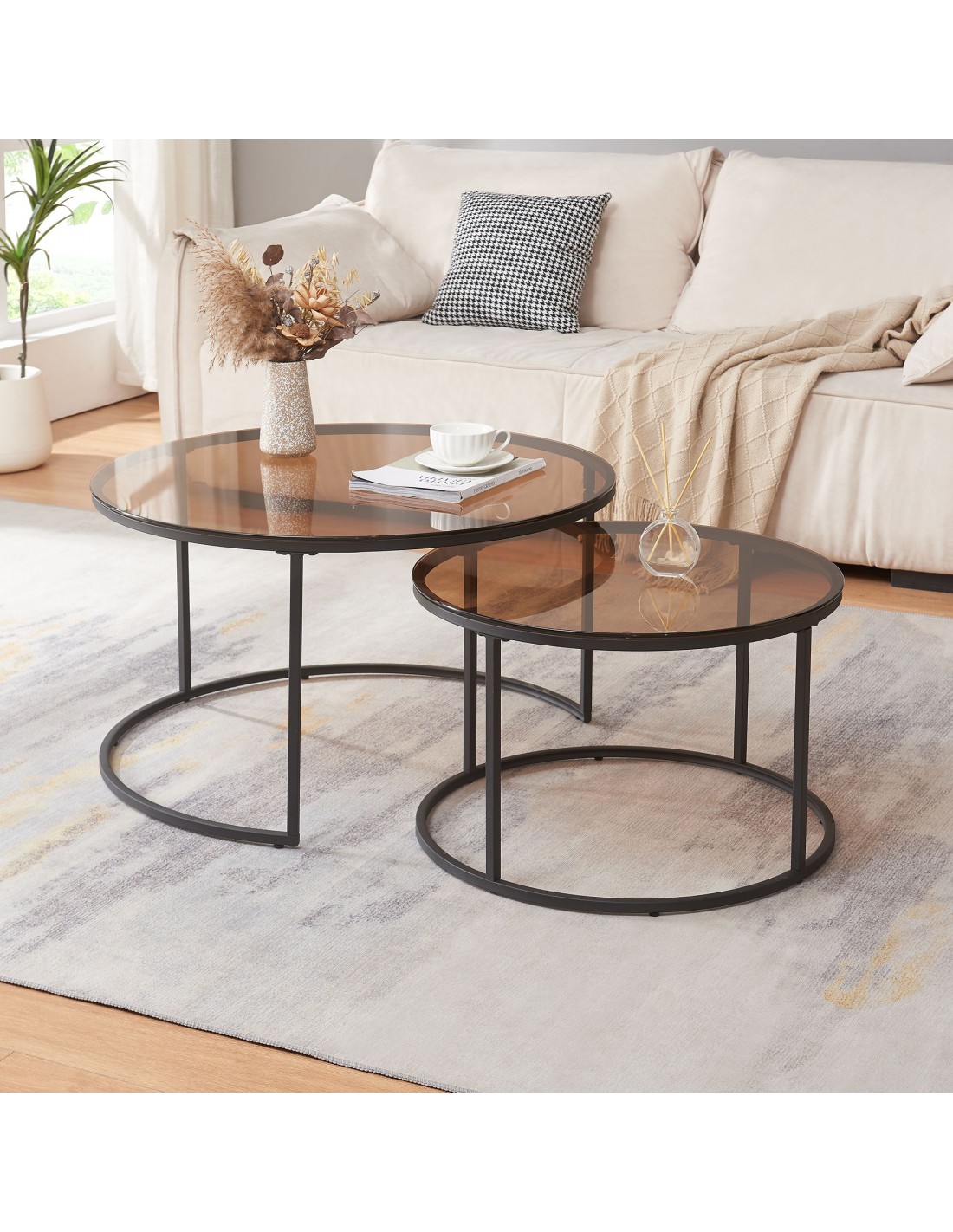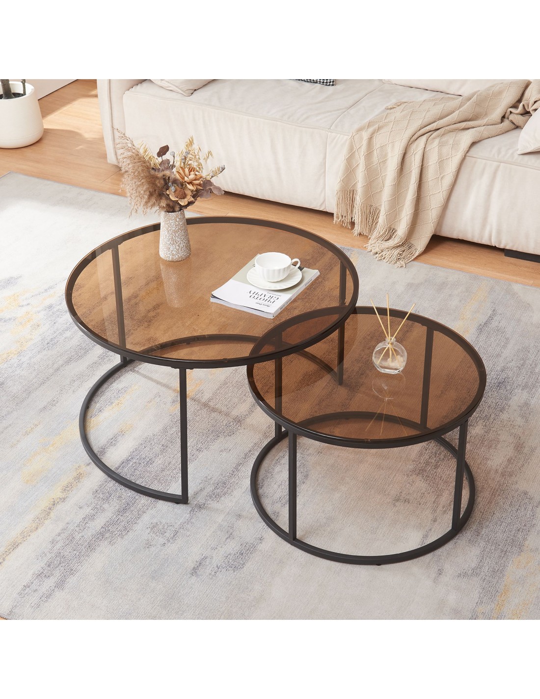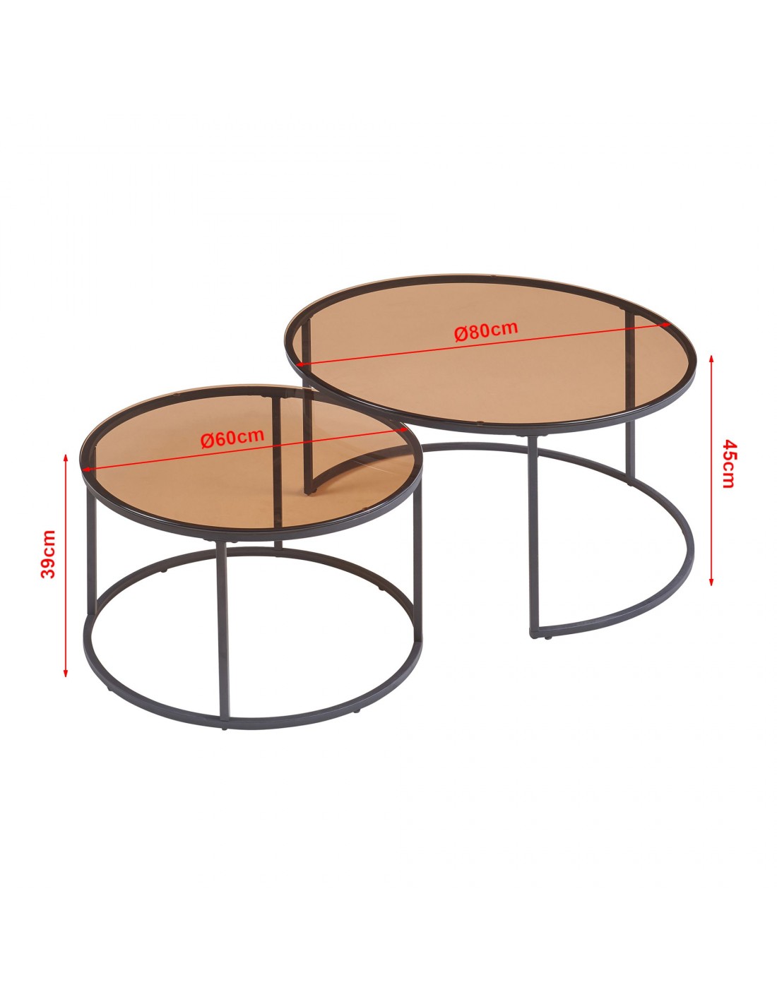 Indskudsborde sofabordssæt udført i et design af sortlakeret metal og røget glas. Sofabordene måler 39 + 45 cm i højden og 60 + 80 cm i diameter.