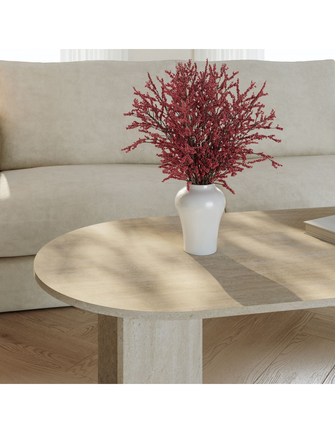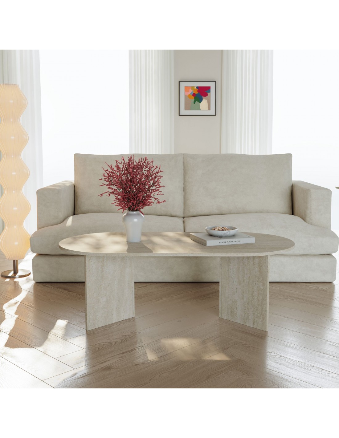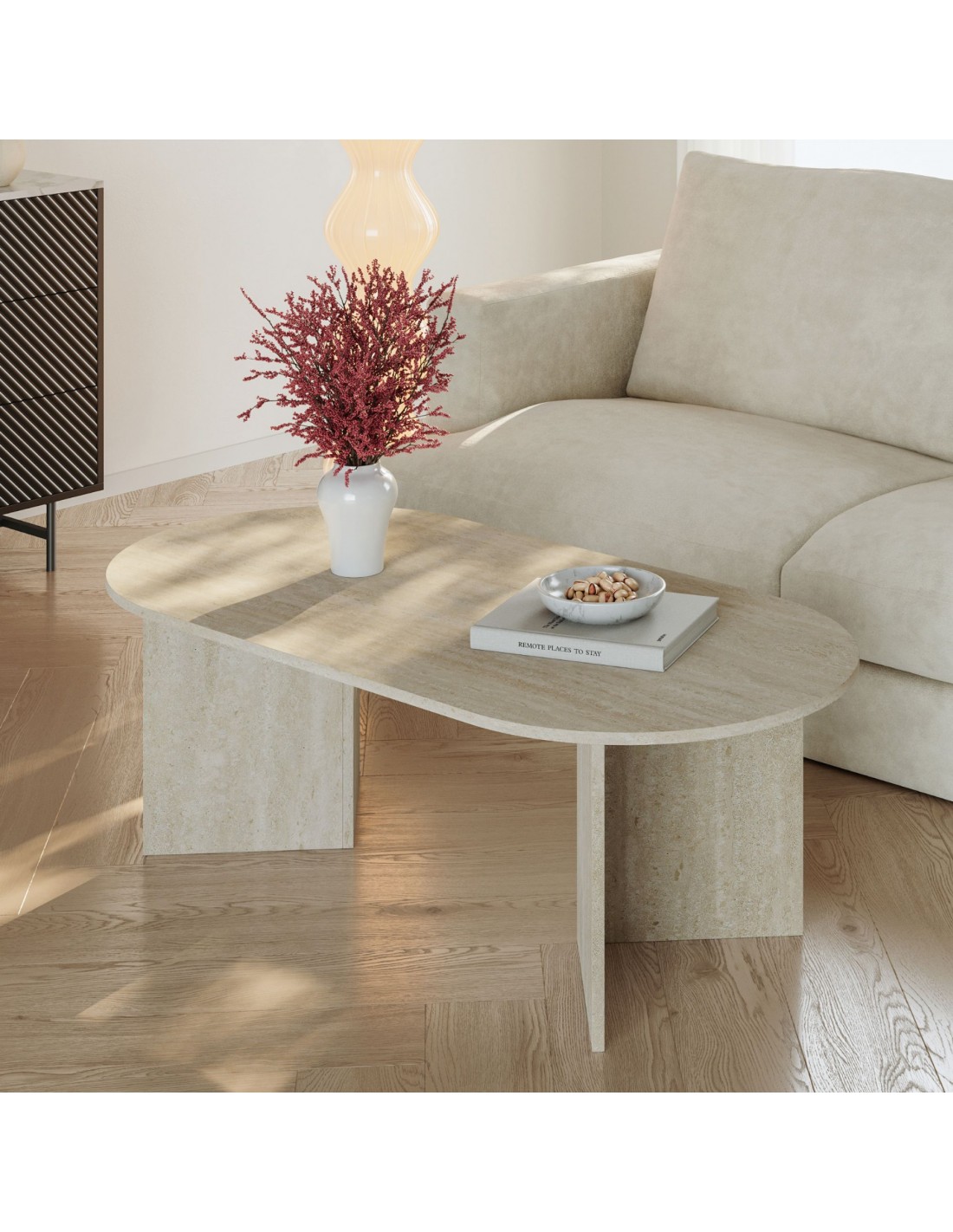 Ovalt sofabord i møbelplade H40 x B119 x D60 cm - Travertin