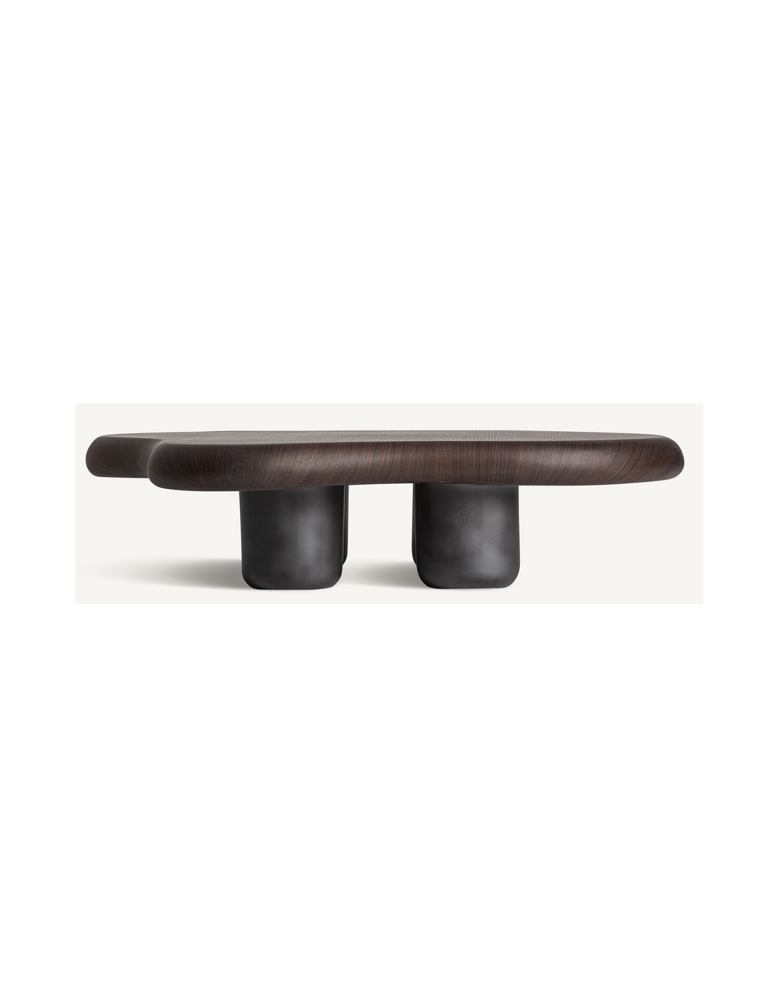 UNBEK Organisk sofabord udført i et design fremstillet af gråsort fiberglas og valnøddefarvet egetræsfinér. Sofabordet måler 29 cm i højden og 122 x 88 cm i bredde og dybde.