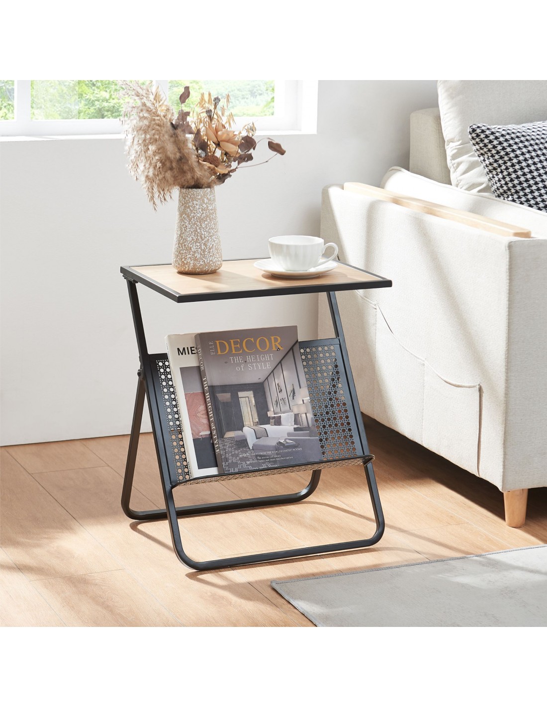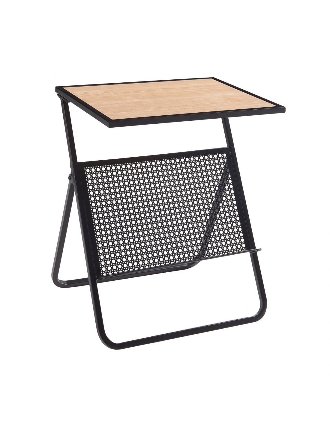 Sidebord udført i et moderne design af sortlakeret metal og egetræsfarvet møbelplade. Sidebordet måler 48 cm i højden og 40 x 30 cm i bredde og dybde. Bordet kan klappes sammen for lettere opbevaring.