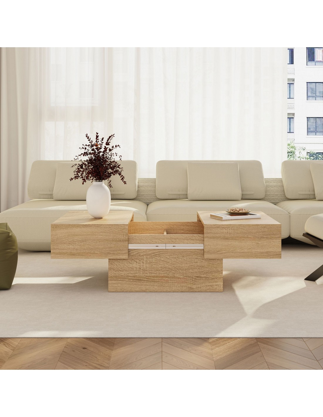 Sofabord med opbevaring, fremstillet i et design af naturfarvet møbelplade. Sofabordet måler 36 cm i højden og 80 x 60 cm i bredde og dybde.