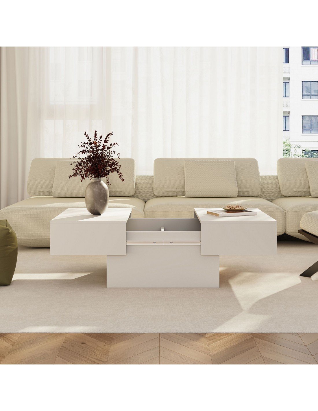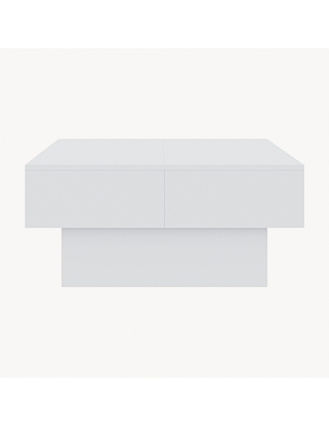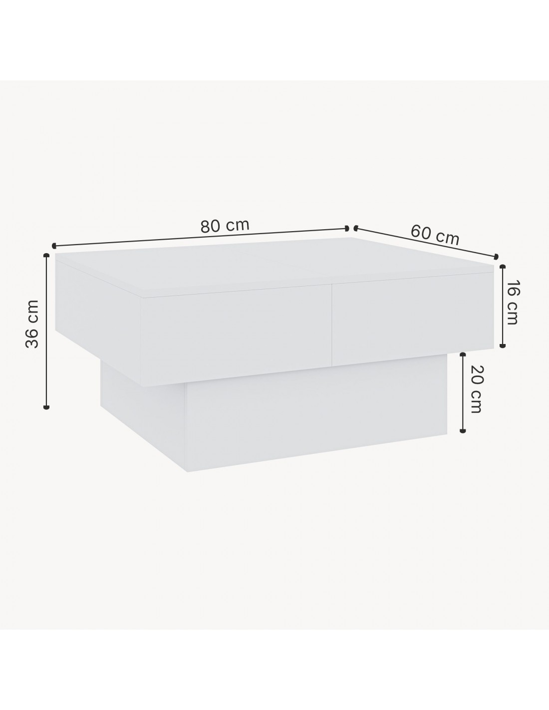 Sofabord med opbevaring, fremstillet i et design af hvid møbelplade. Sofabordet måler 36 cm i højden og 80 x 60 cm i bredde og dybde.