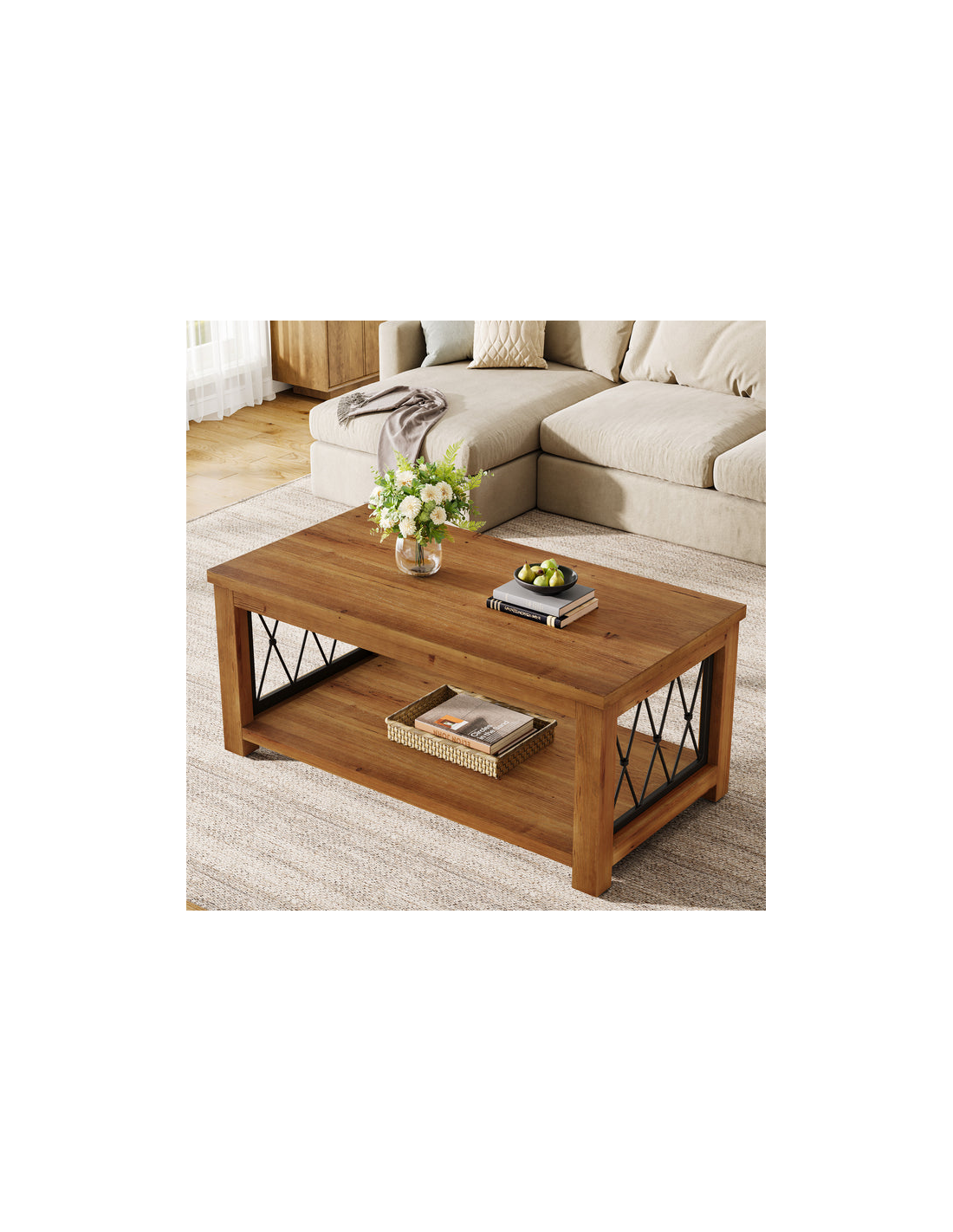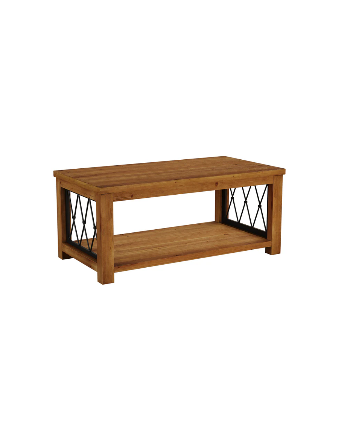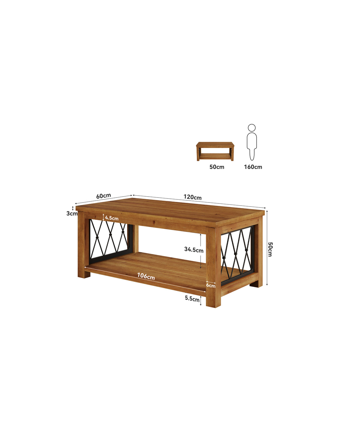 Sofabord udført i et design af naturbrun fyrretræ og antik sortlakeret metal. Sofabordet måler 50 cm i højden og 120 x 60 cm i bredde og dybde.
