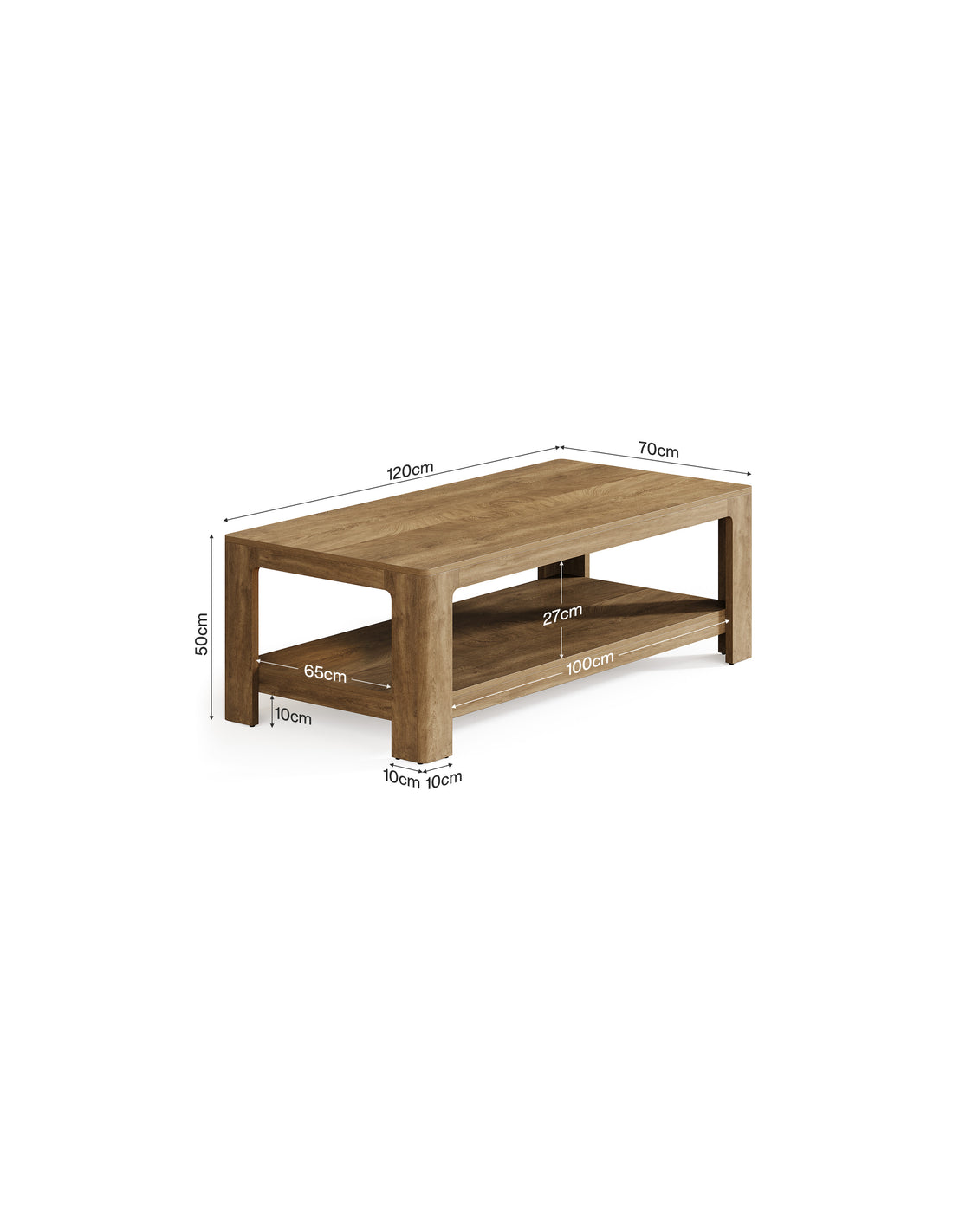 Sofabord udført i et design af naturbrun MDF og møbelplade. Sofabordet måler 50 cm i højden og 120 x 70 cm i bredde og dybde.
