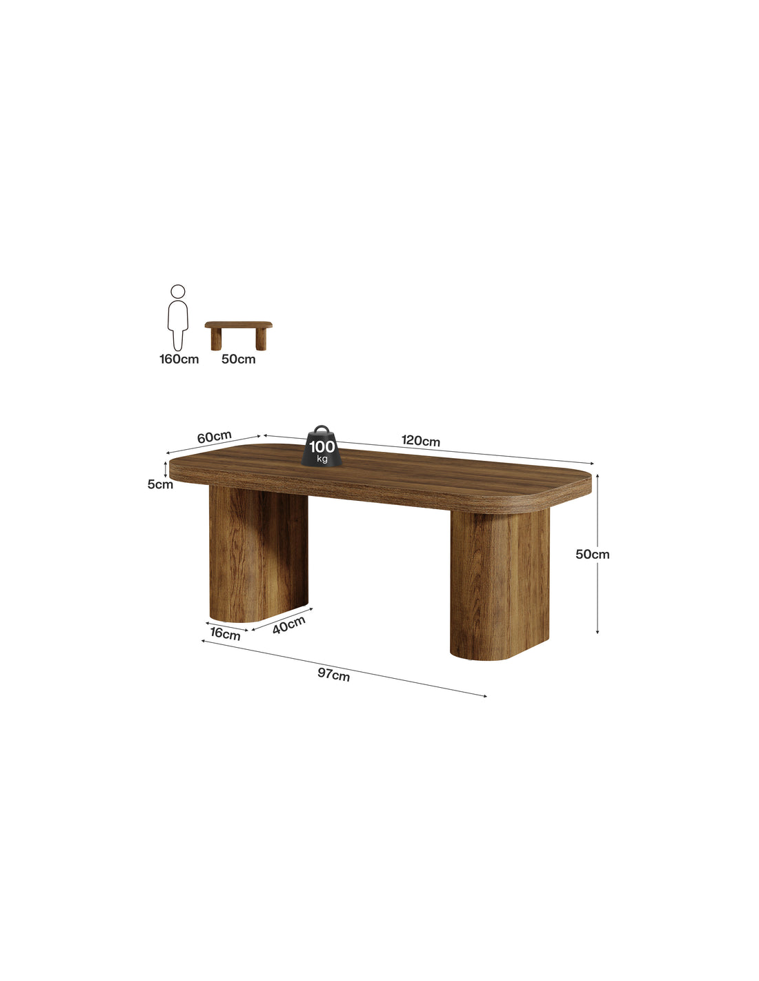 Sofabord udført i et design af brun møbelplade. Sofabordet måler 50 cm i højden og 120 x 60 cm i bredde og dybde.