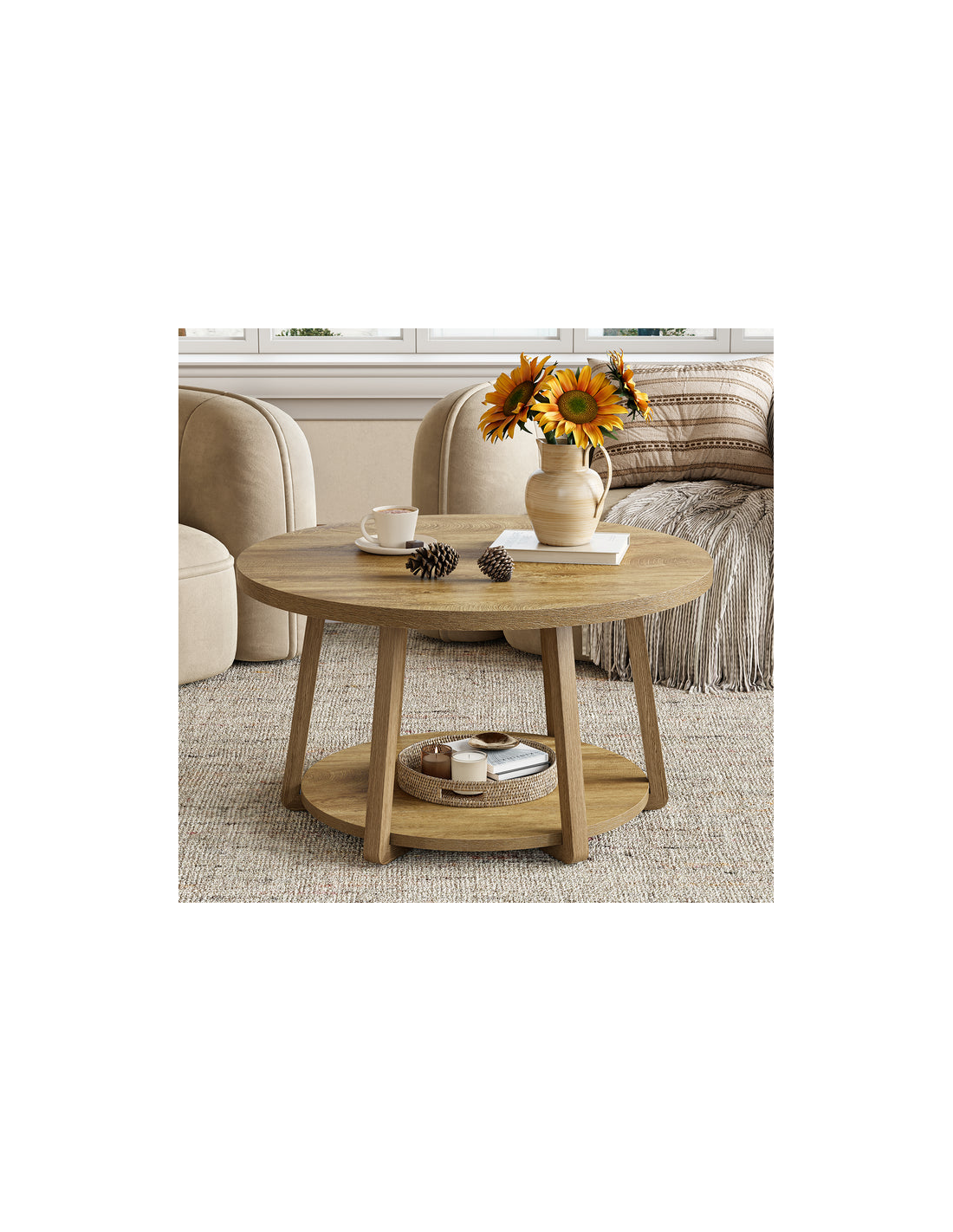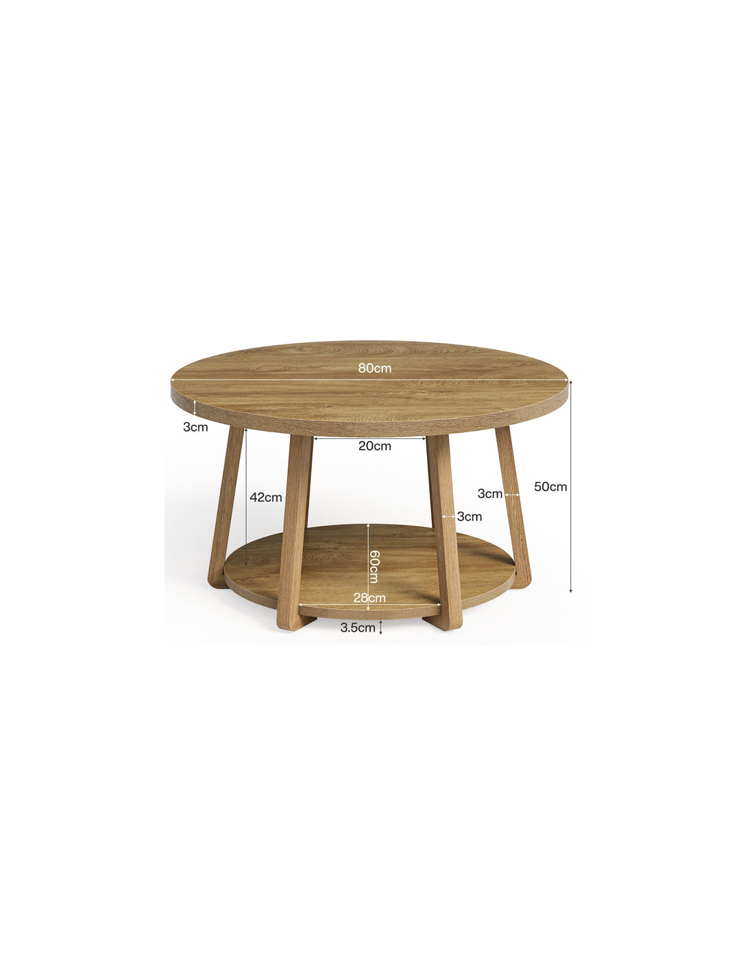 Rundt sofabord udført i et design af naturbrun MDF og møbelplade. Sofabordet måler 50 cm i højden og 80 cm i diameter.
