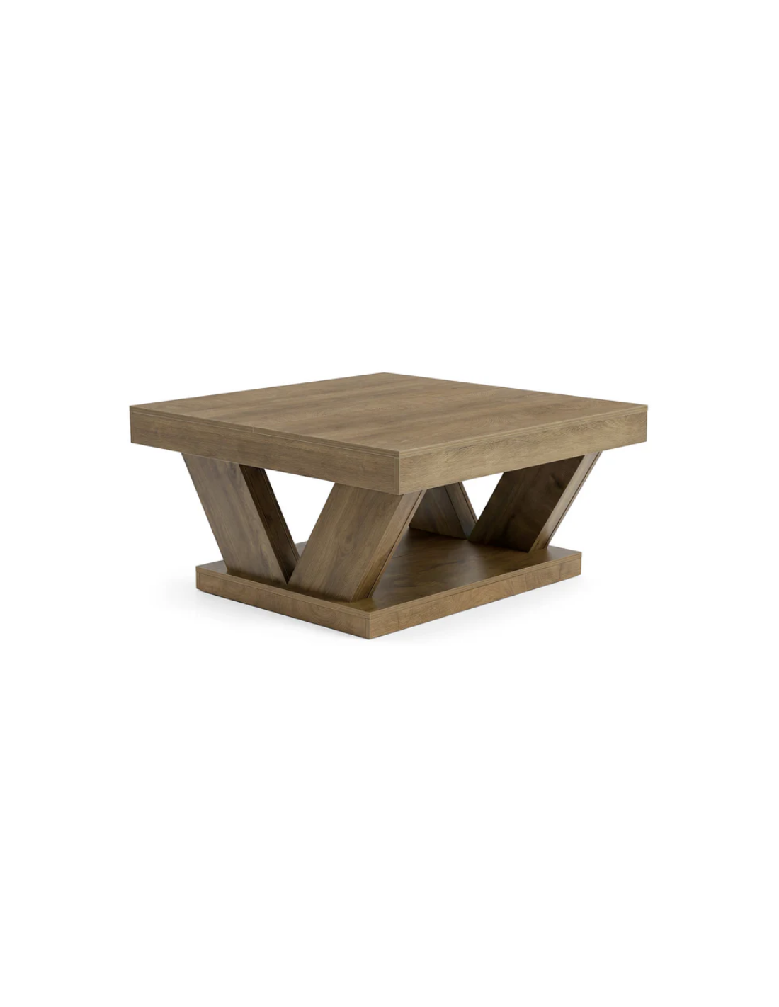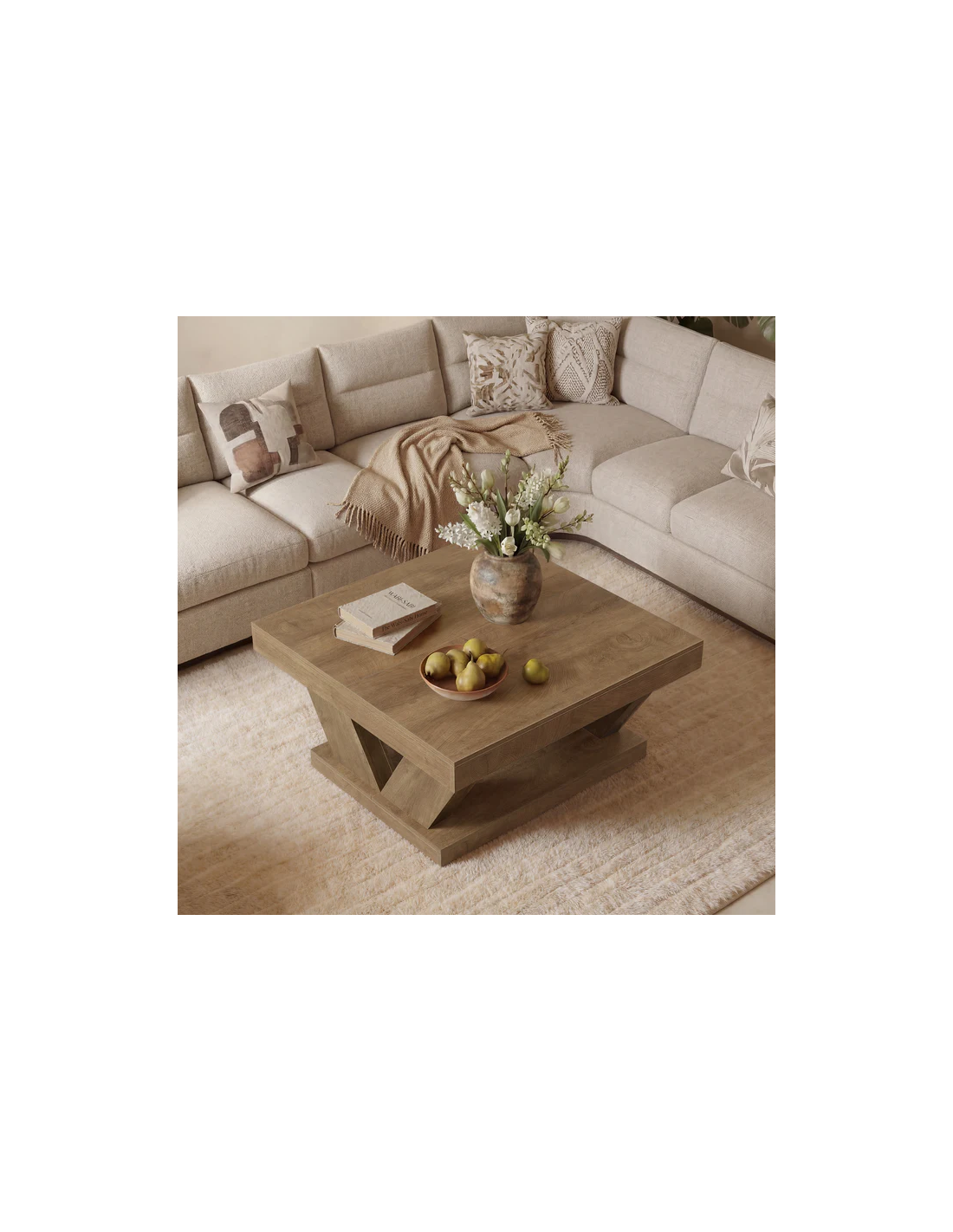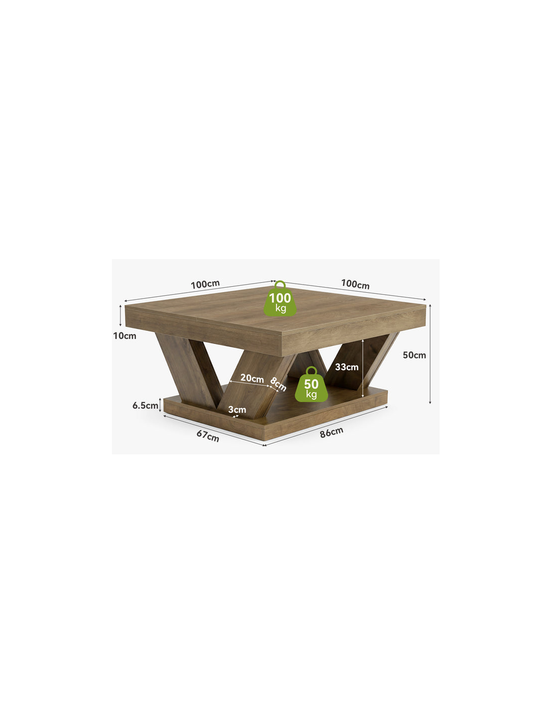 Sofabord udført i et moderne design af naturbrun møbelplade. Sofabordet måler 50 cm i højden og 100 x 100 cm i bredde og dybde.