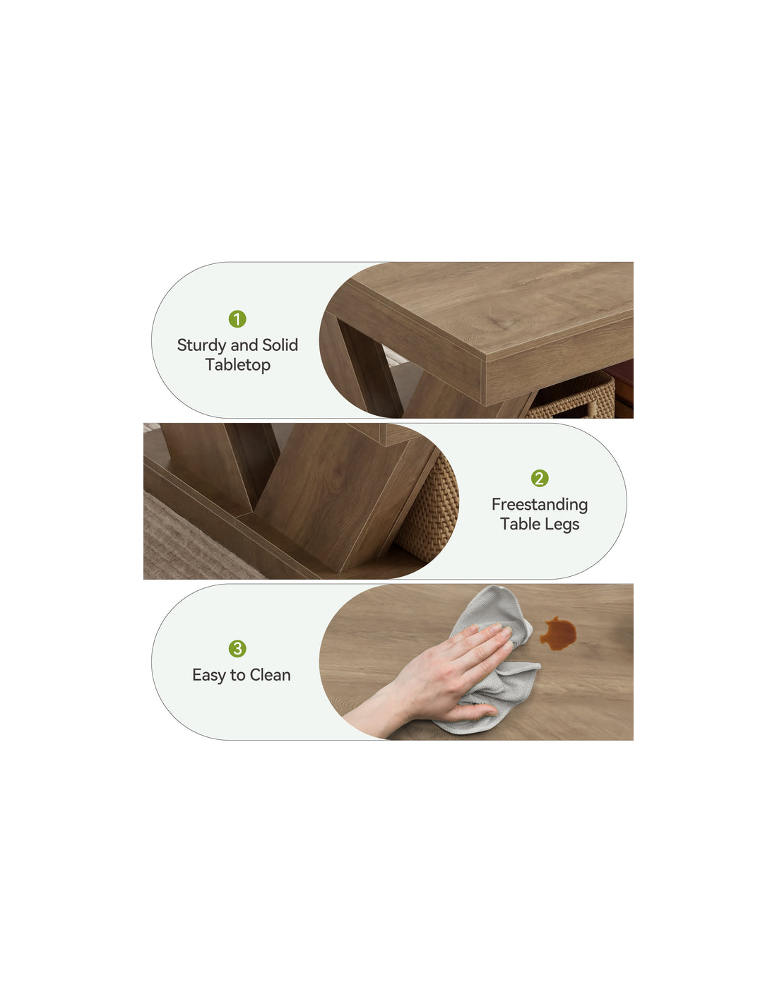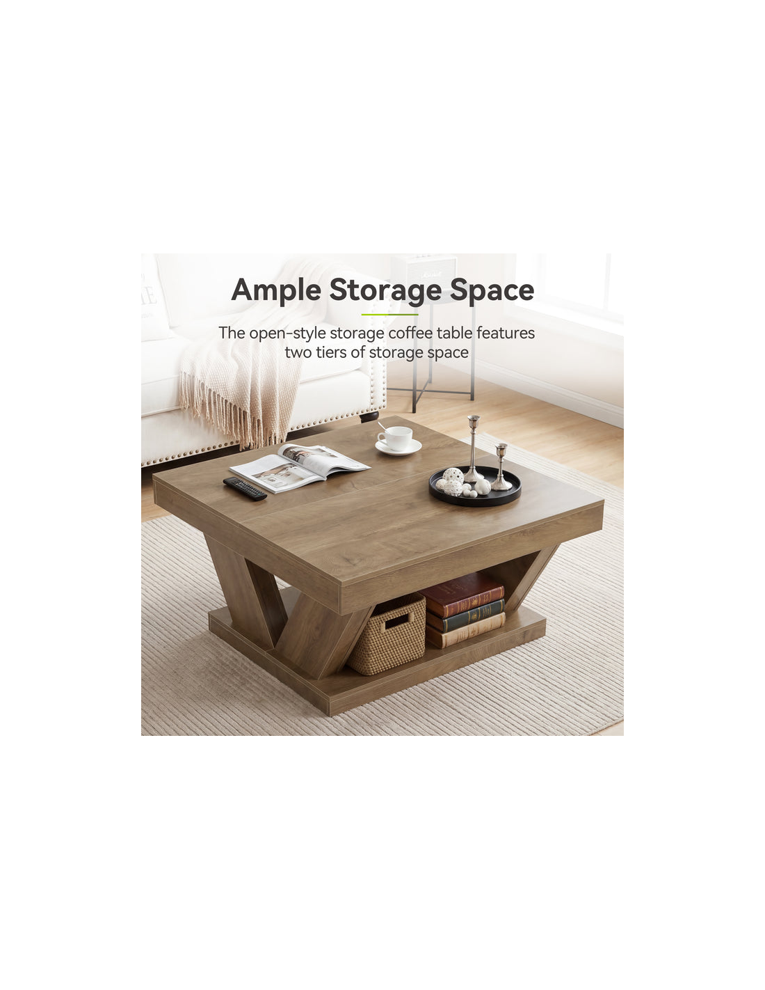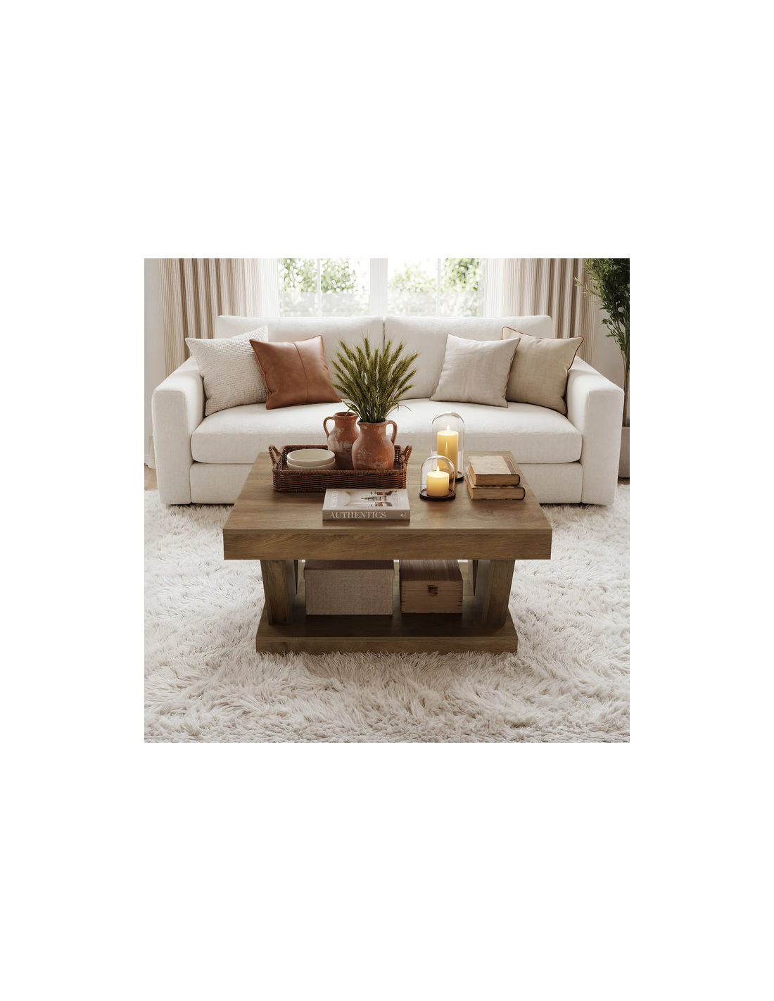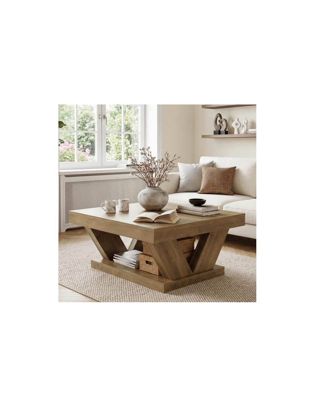 Sofabord udført i et moderne design af naturbrun møbelplade. Sofabordet måler 50 cm i højden og 100 x 100 cm i bredde og dybde.