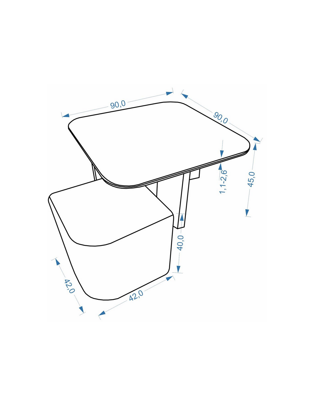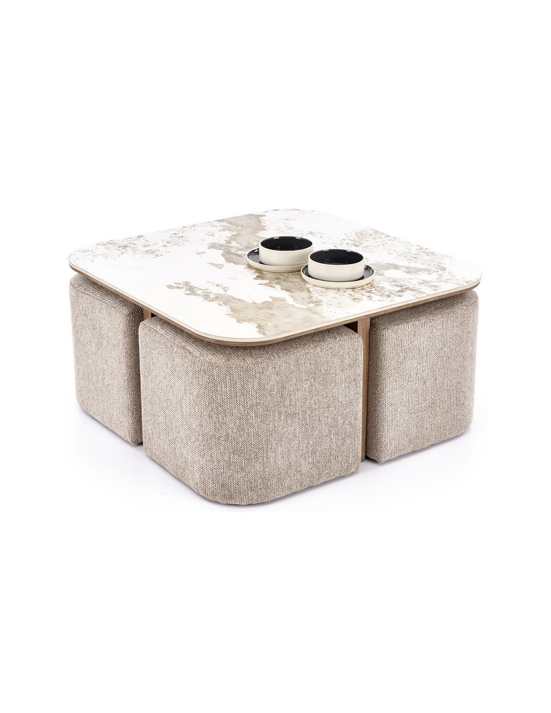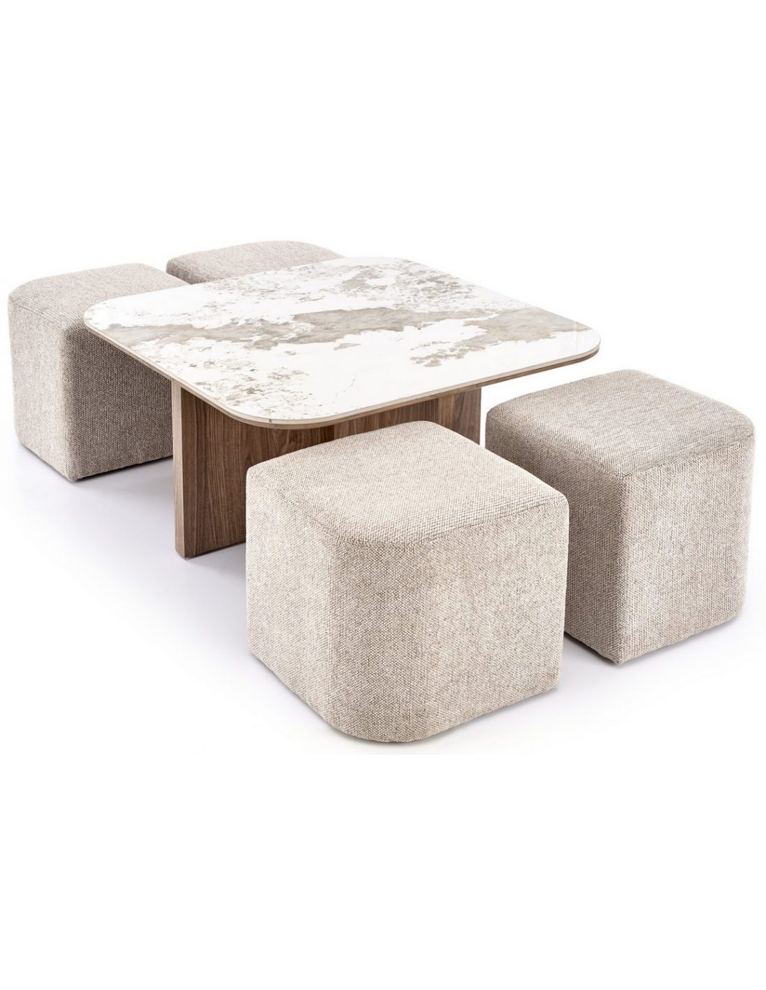 Sofabord med 4 skamler, udført i et moderne design af valnøddebrun MDF og bordplade i beige keramisk sten. Skamlerne er i naturfarvet polyester og giver 4 komfortable siddepladser rundt om bordet. Sofabordet måler 45 cm i højden og 90 x 90 cm i bredde og dybde. Skamlerne måler 40 cm i siddehøjde og 42 x 42 cm i bredde og dybde.