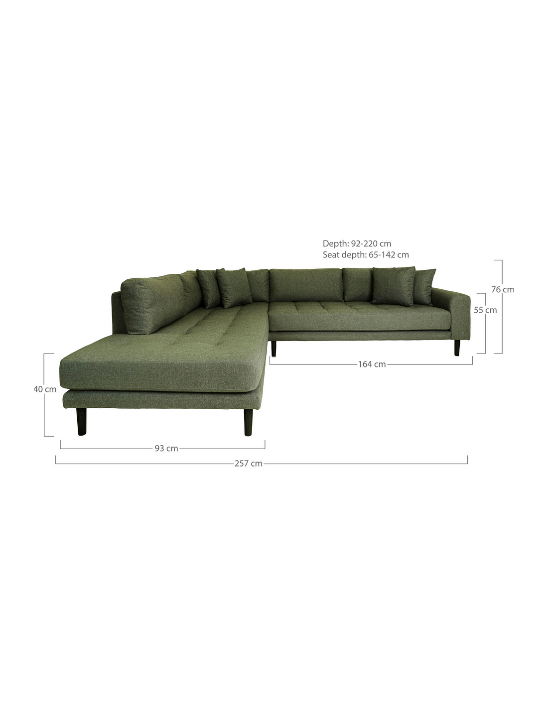 LIDE Hjørnesofa med chaiselong udført i et stilrent og komfortabelt design af olivengrøn polyester med ben i sortlakeret bøgetræ. Sofaen måler 257 x 92/220 cm i bredde og dybde. Sofaen er polstret med højkvalitets skum. Denne model er venstrevendt. Sofaen kommer med 4 pyntepuder.