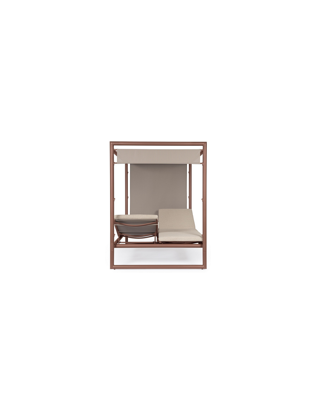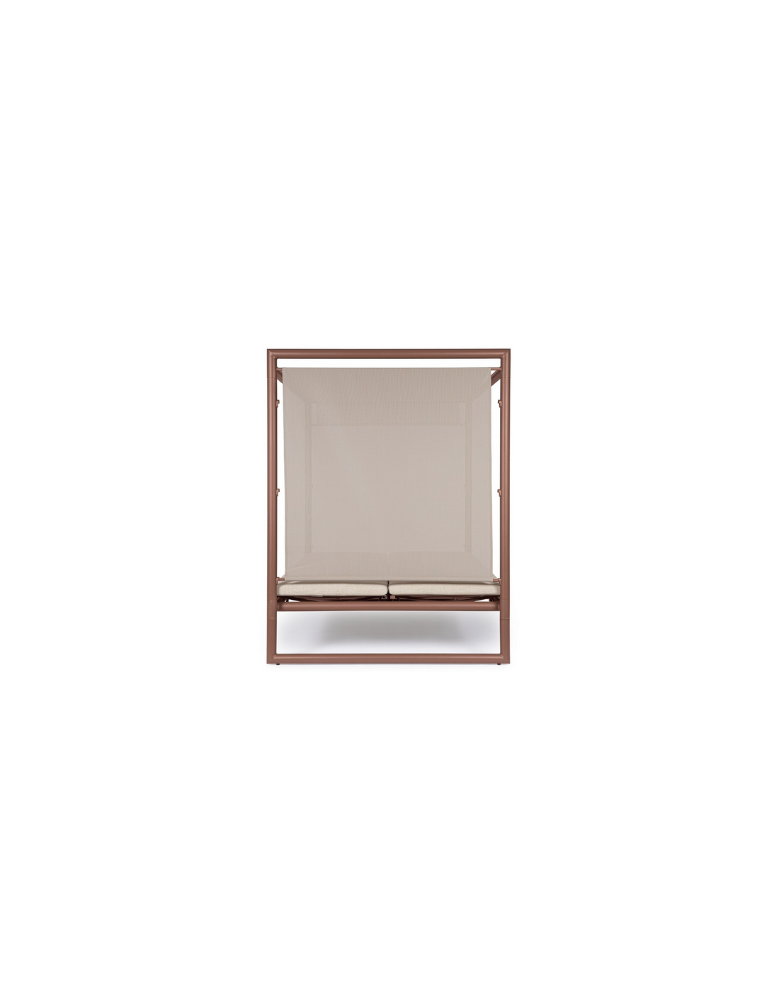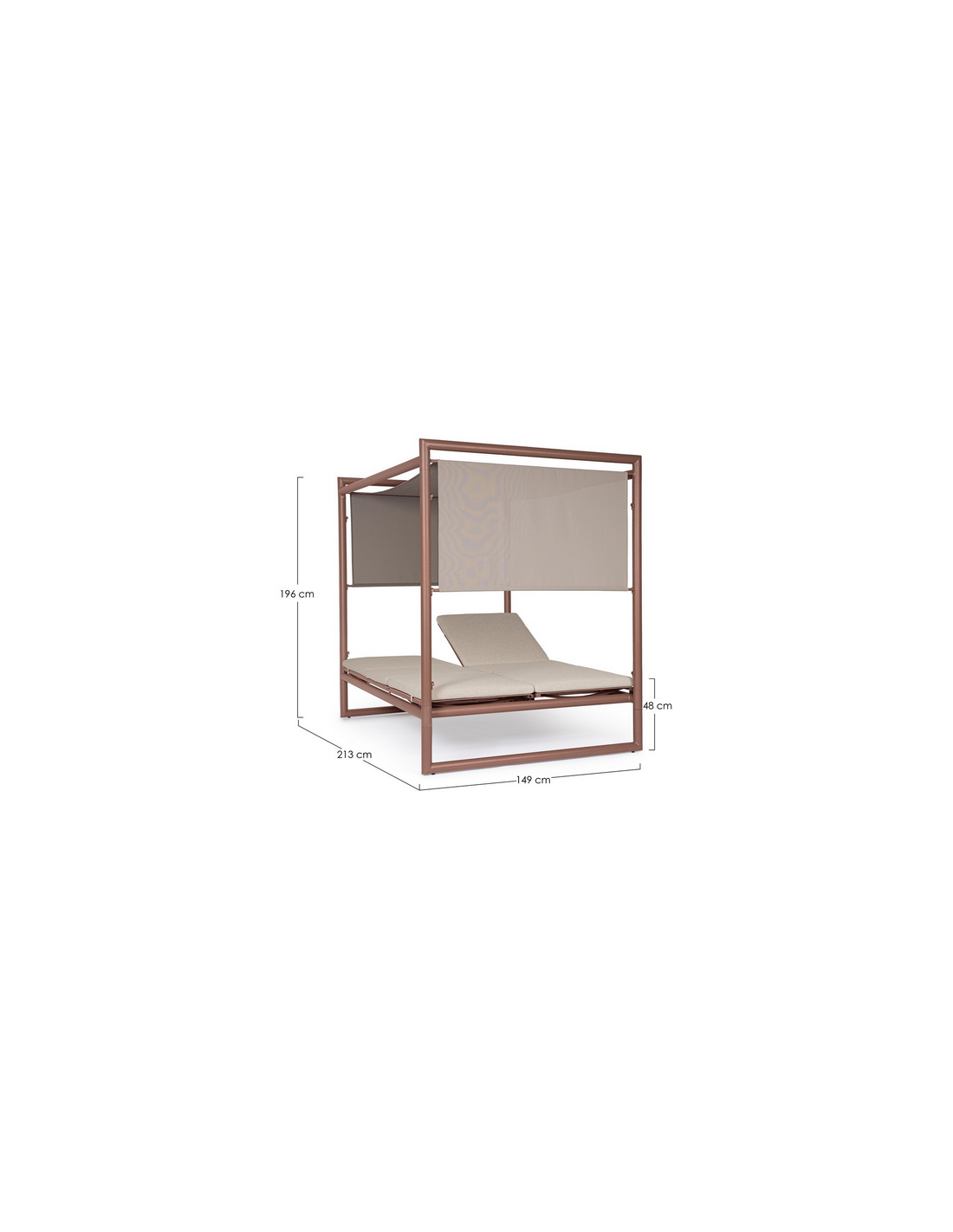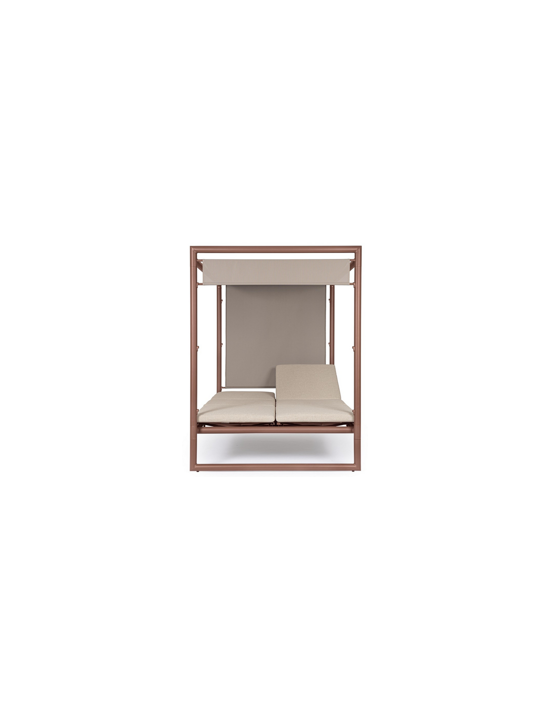 Dobbelt solseng daybed udført i et design af rødbrun pulverlakeret aluminium og beige vandafvisende olefin med quick dry skum. Solsengen måler 48 - 196 cm i højden og 213 x 149 cm i bredde og dybde. Solsengen tåler at stå ude i regnvejr.