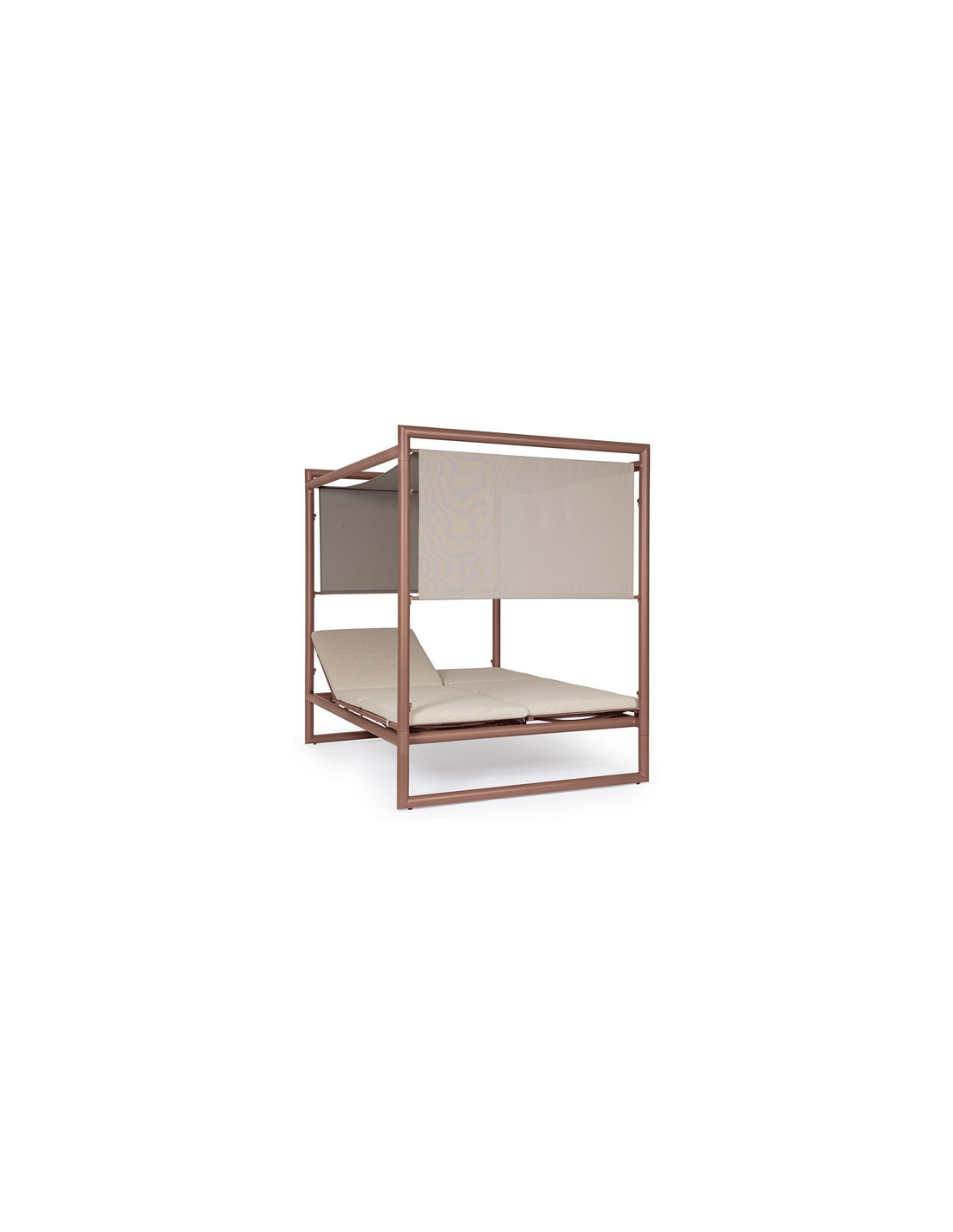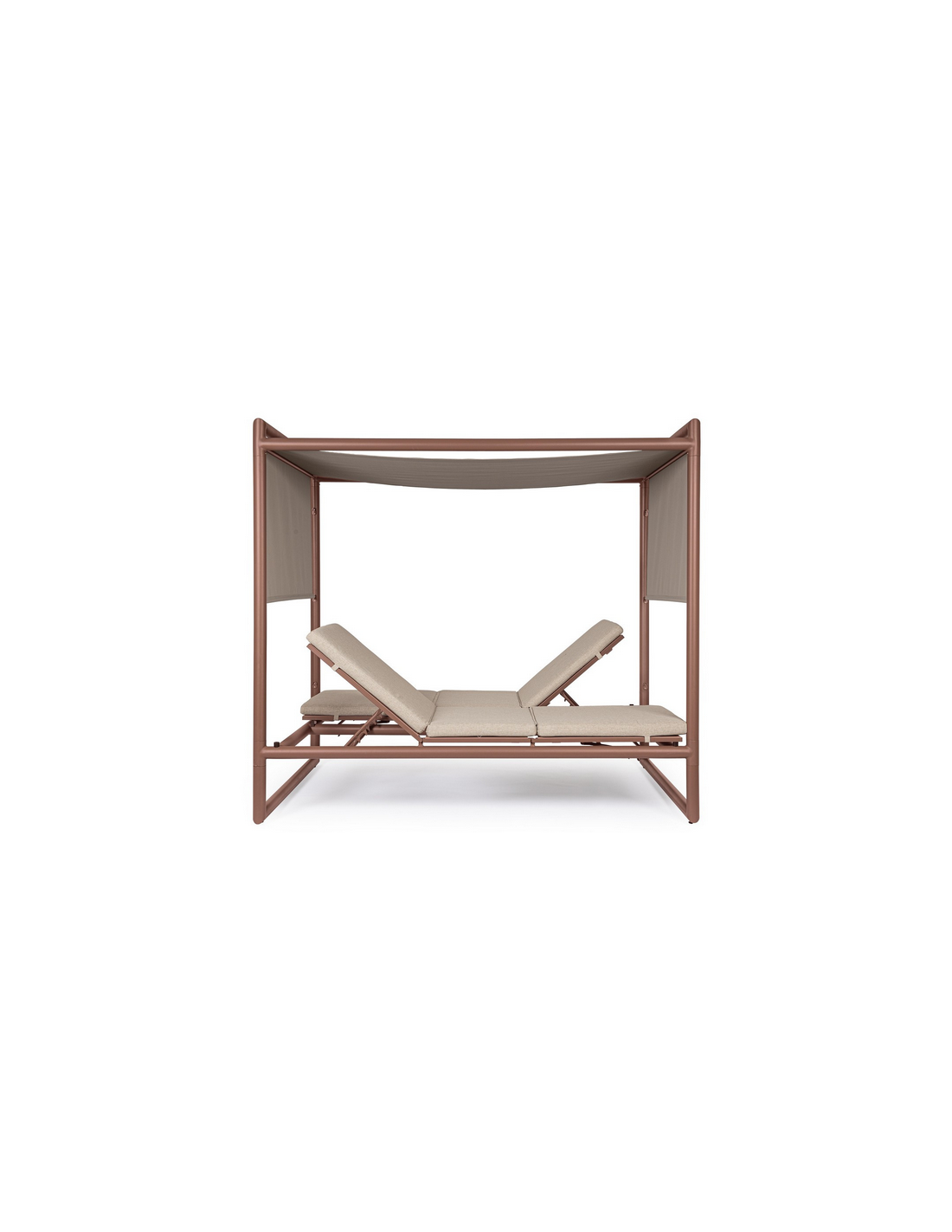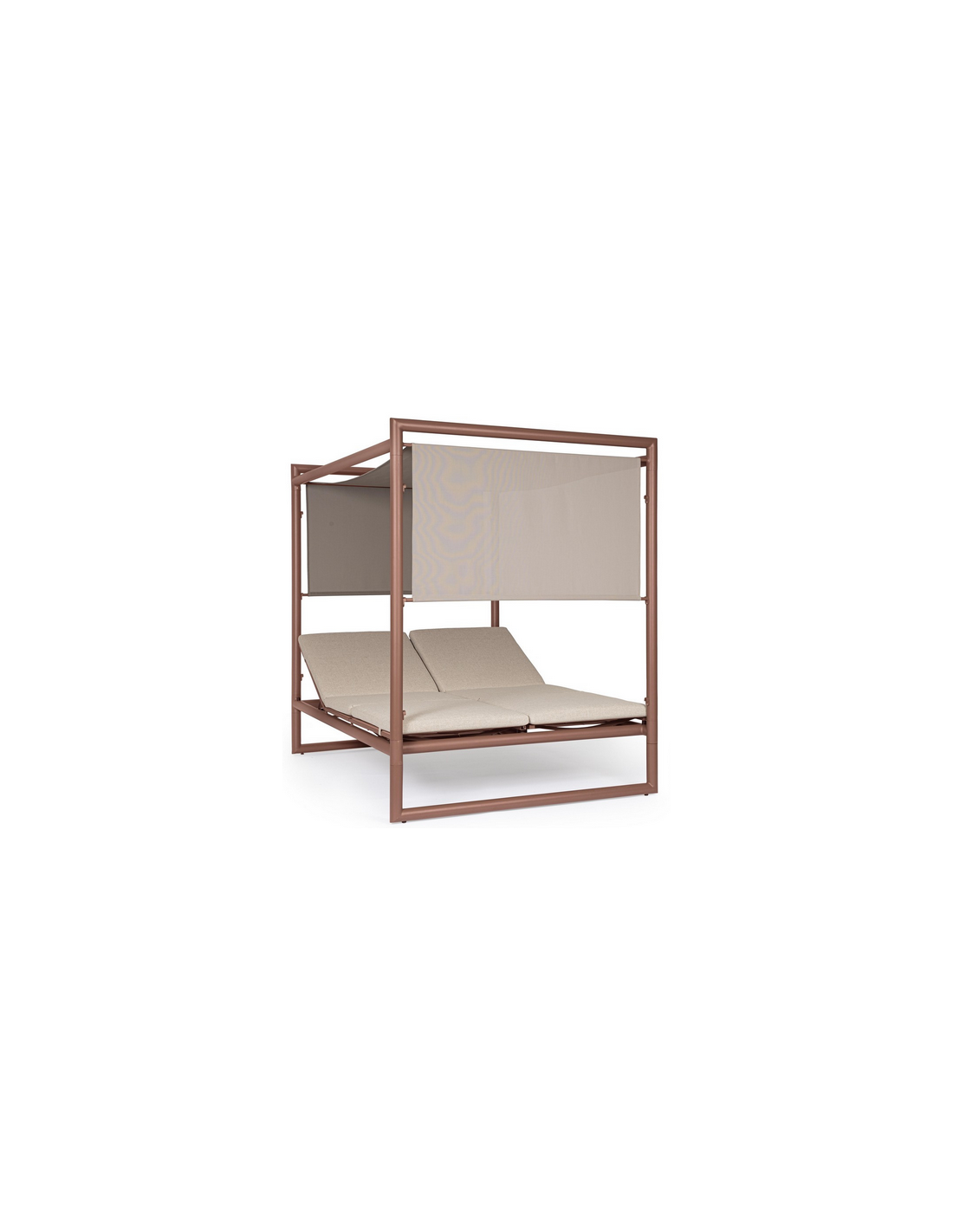 Dobbelt solseng daybed udført i et design af rødbrun pulverlakeret aluminium og beige vandafvisende olefin med quick dry skum. Solsengen måler 48 - 196 cm i højden og 213 x 149 cm i bredde og dybde. Solsengen tåler at stå ude i regnvejr.