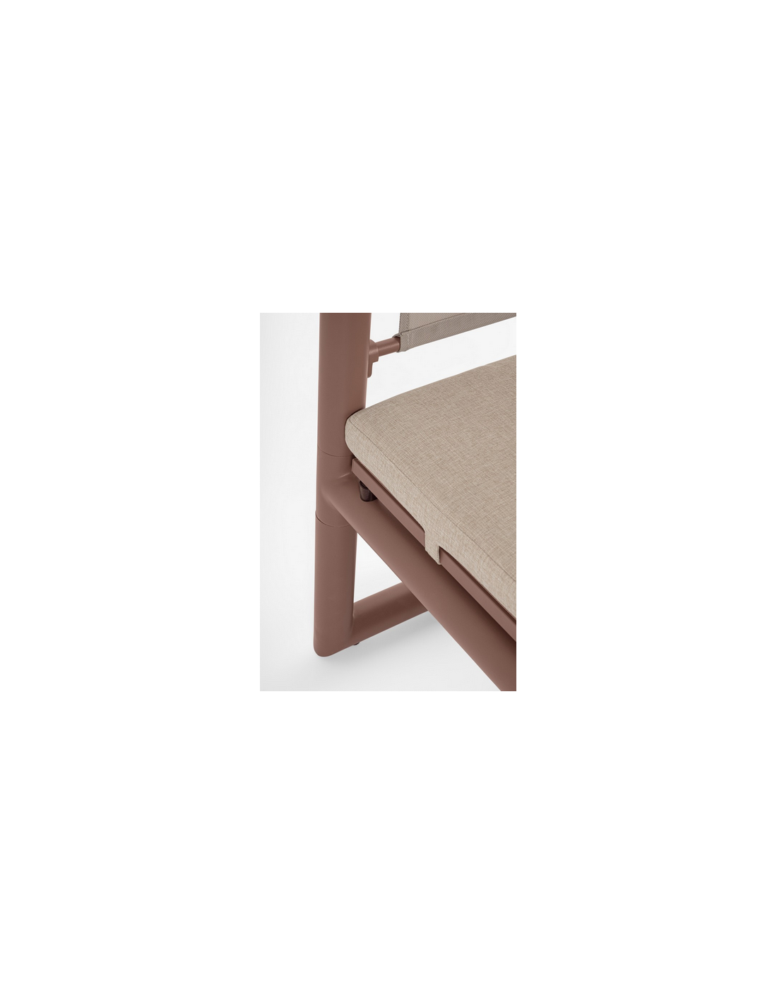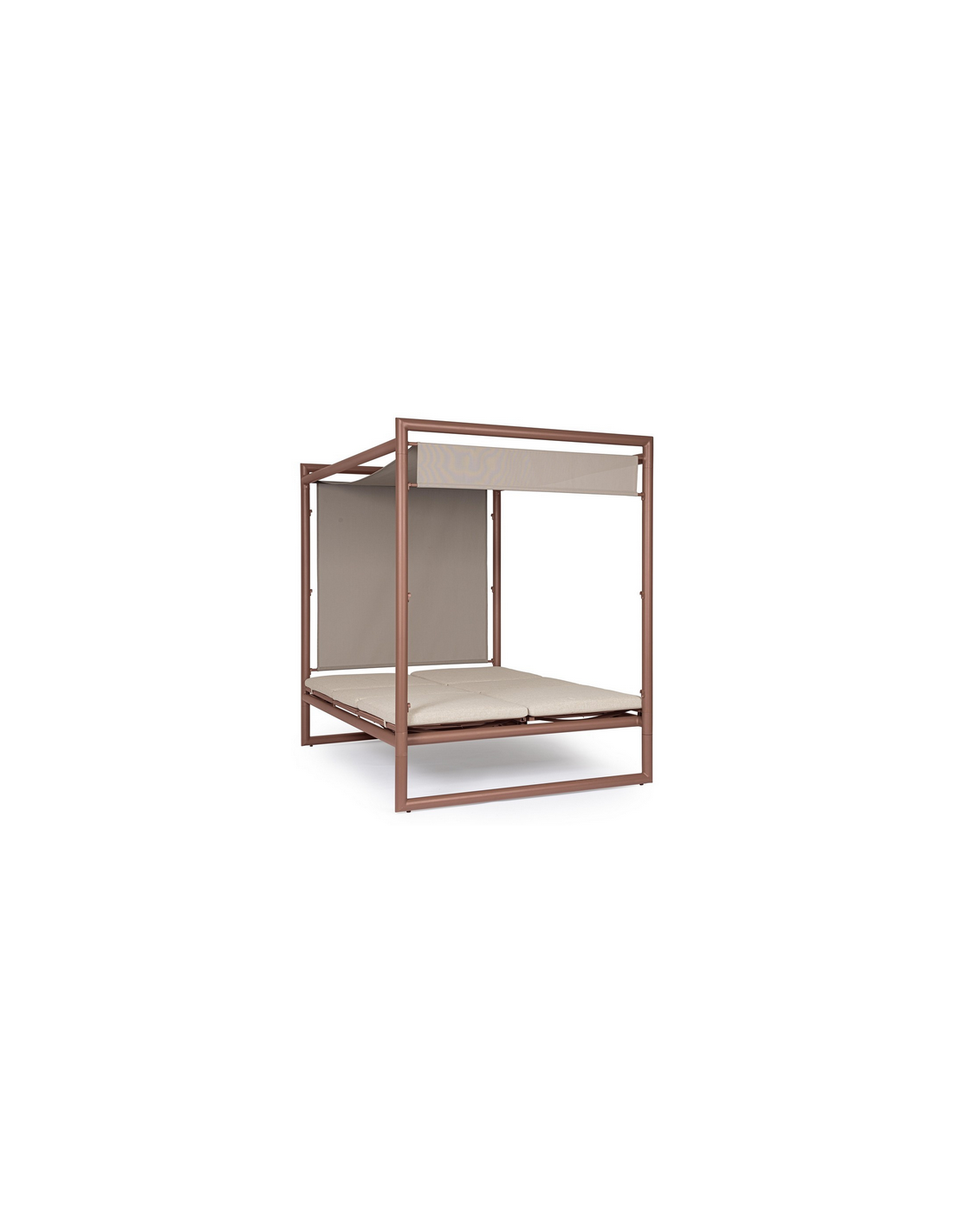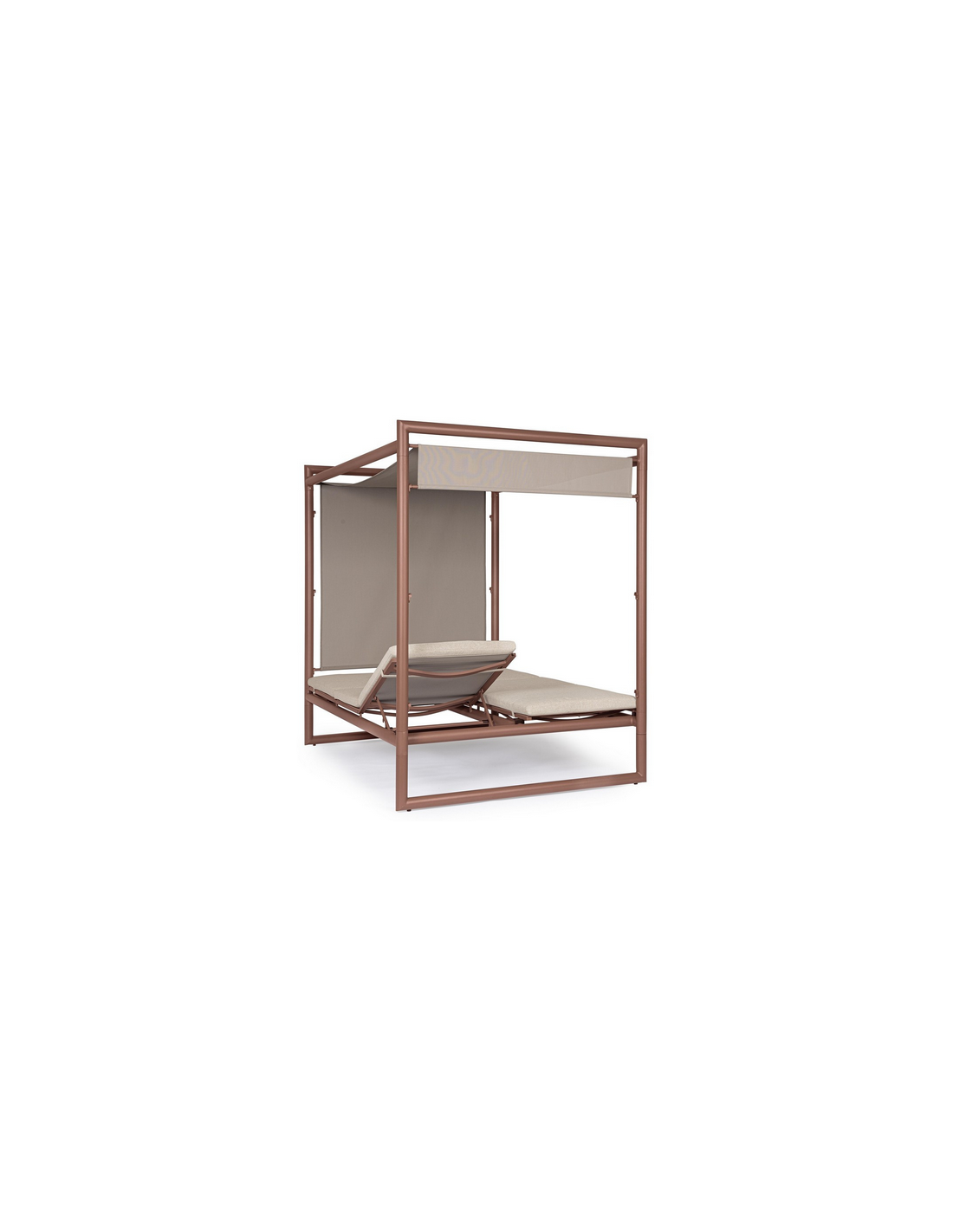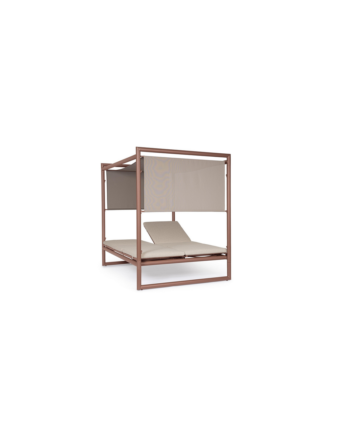 Dobbelt solseng daybed udført i et design af rødbrun pulverlakeret aluminium og beige vandafvisende olefin med quick dry skum. Solsengen måler 48 - 196 cm i højden og 213 x 149 cm i bredde og dybde. Solsengen tåler at stå ude i regnvejr.