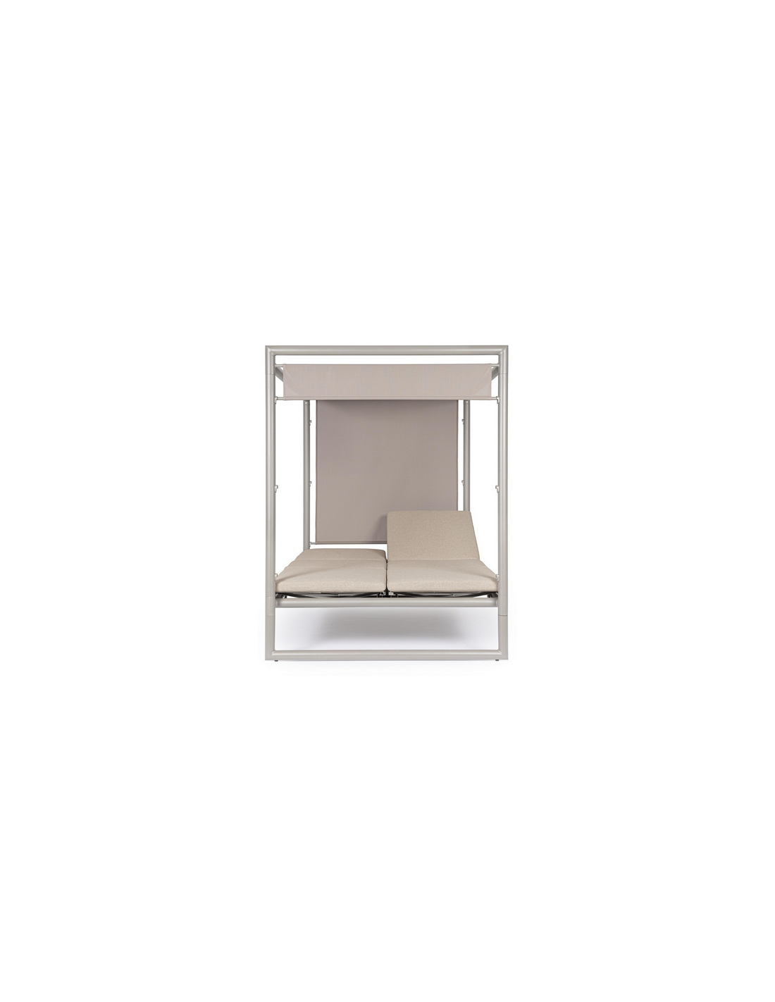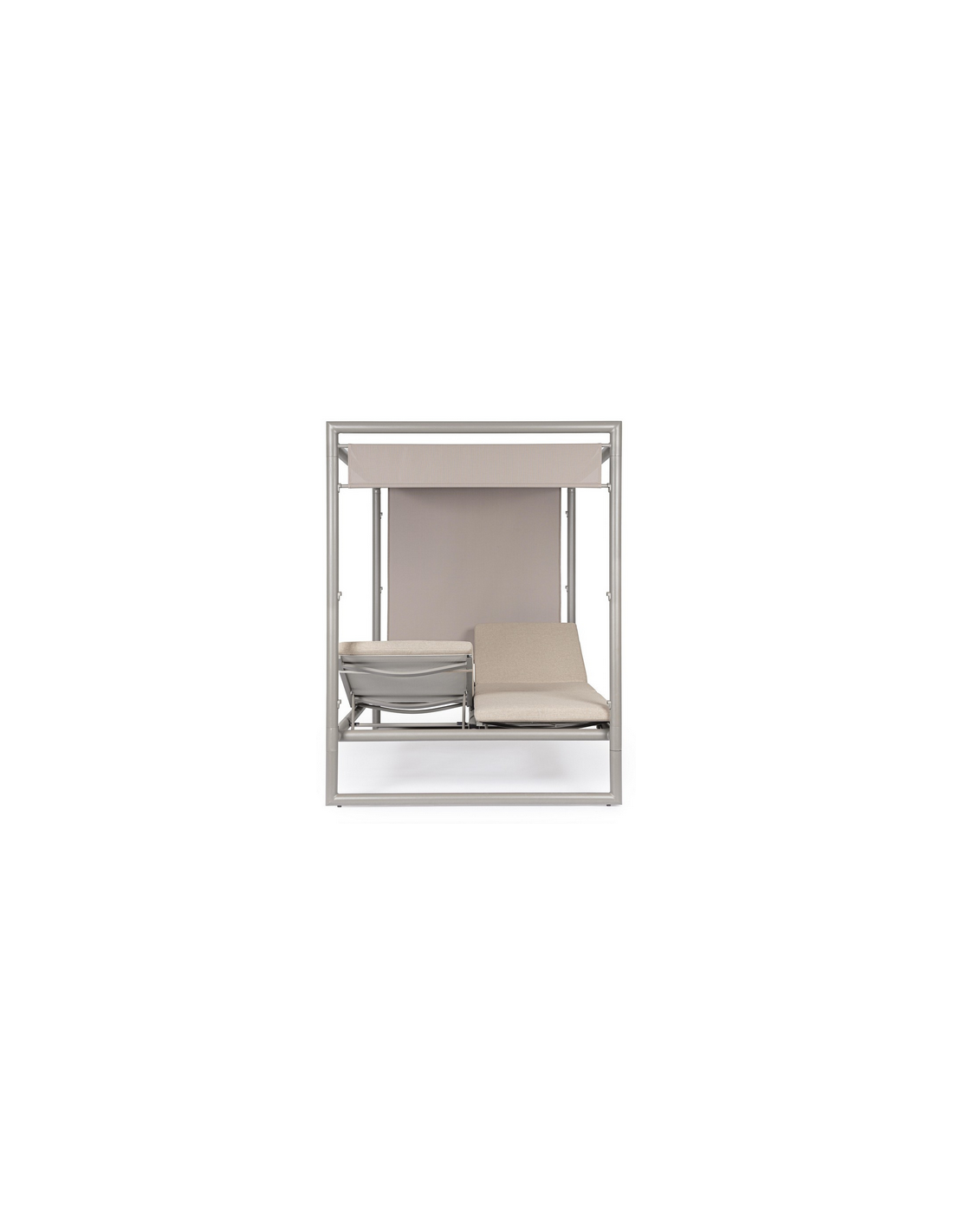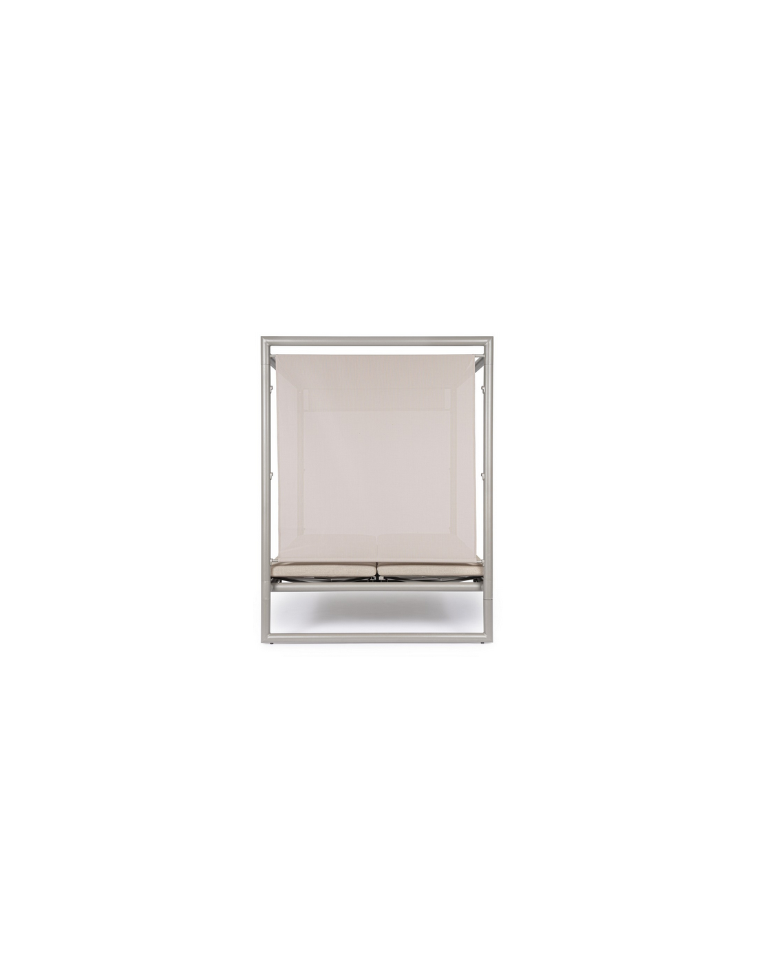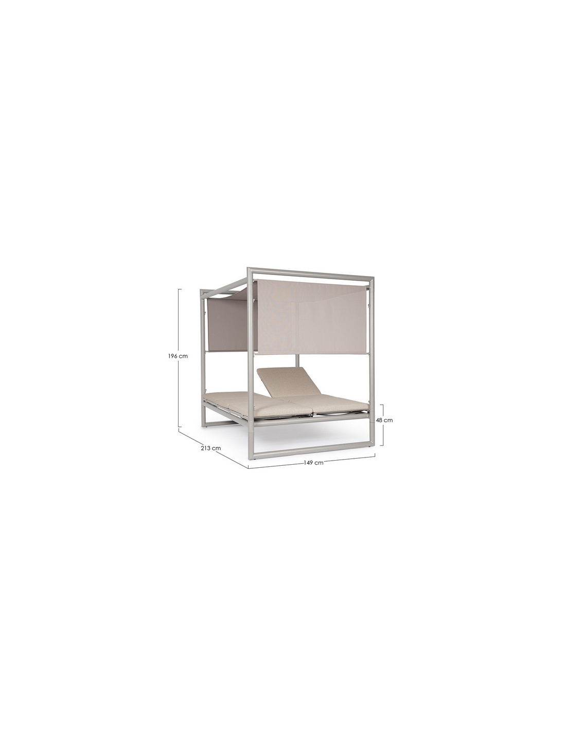 Dobbelt solseng daybed udført i et design af sandgrå pulverlakeret aluminium og beige vandafvisende olefin med quick dry skum. Solsengen måler 48 - 196 cm i højden og 213 x 149 cm i bredde og dybde. Solsengen tåler at stå ude i regnvejr.