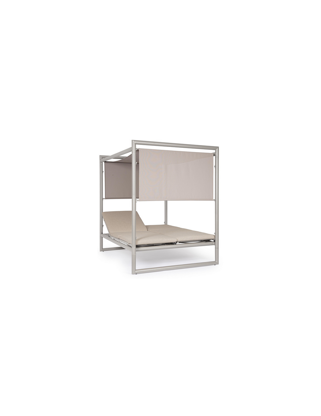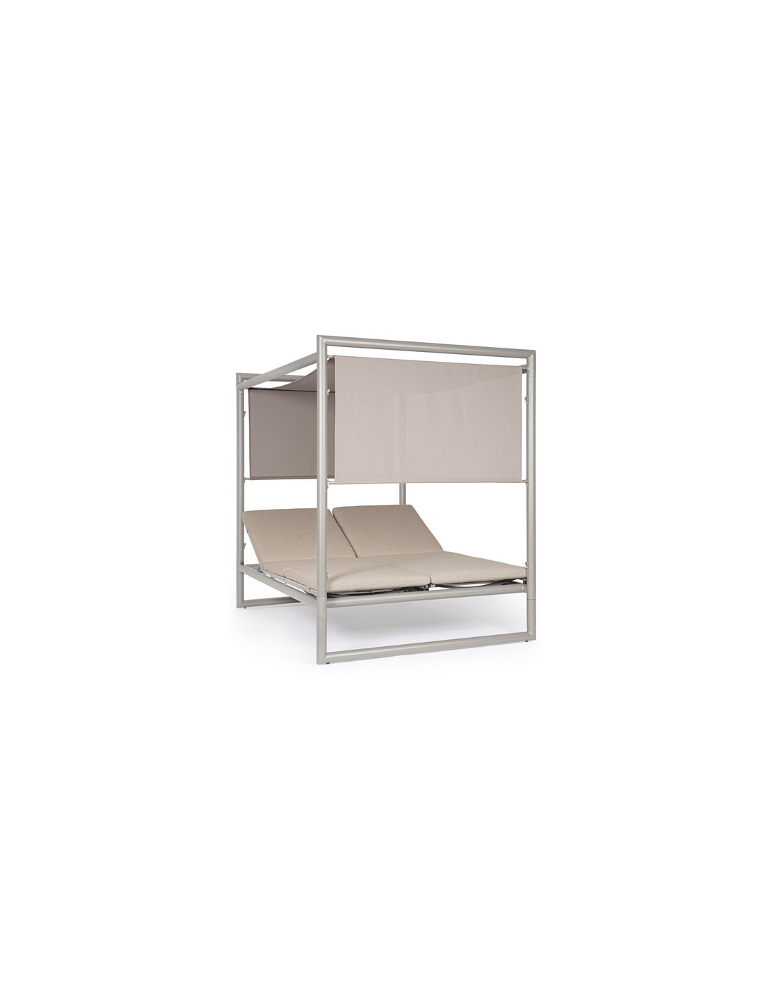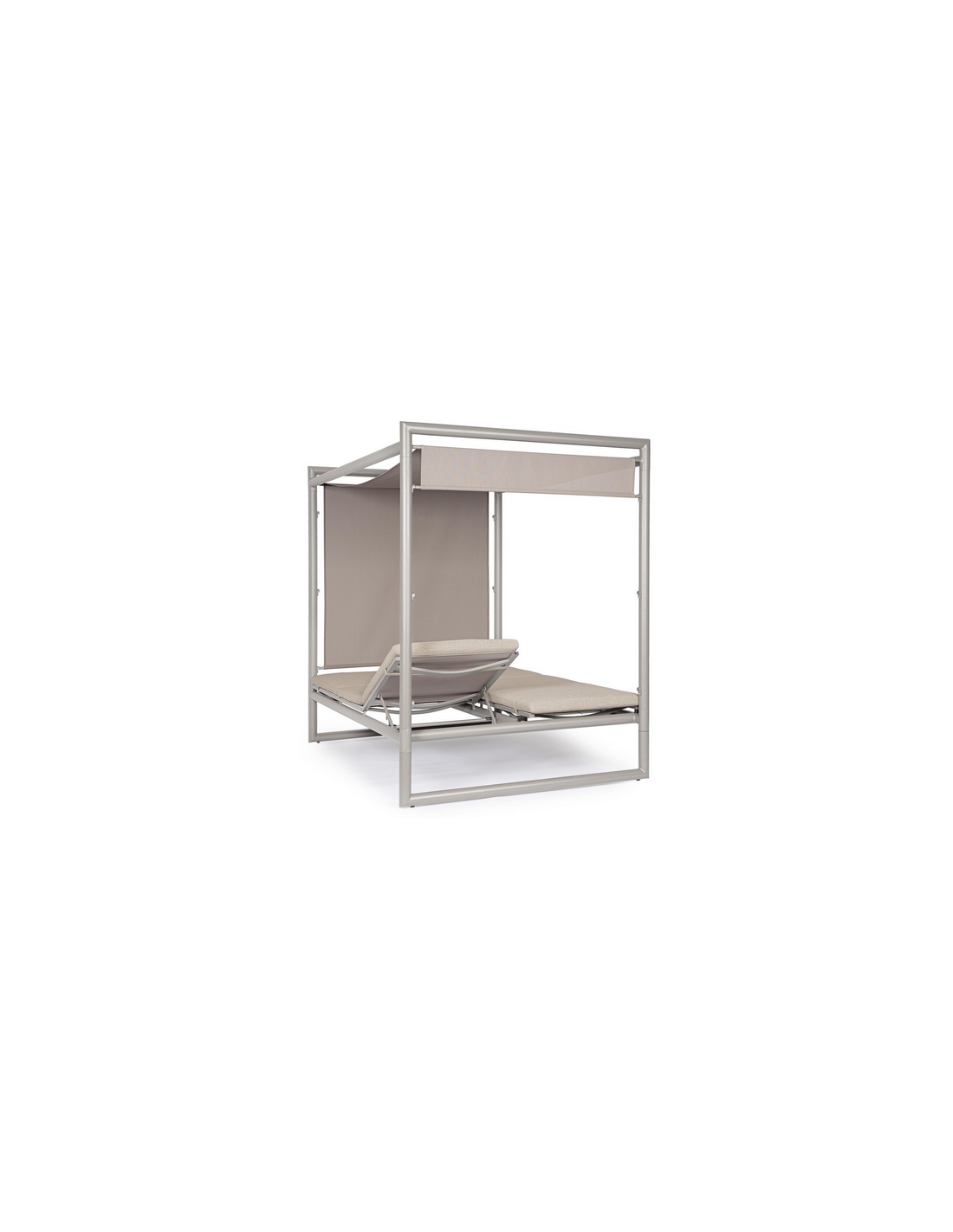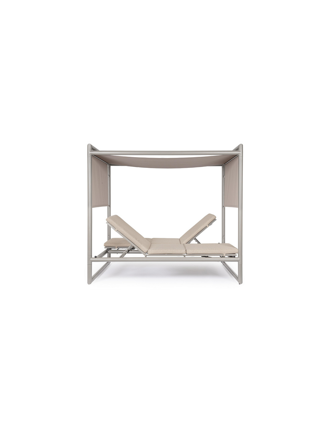 Dobbelt solseng daybed udført i et design af sandgrå pulverlakeret aluminium og beige vandafvisende olefin med quick dry skum. Solsengen måler 48 - 196 cm i højden og 213 x 149 cm i bredde og dybde. Solsengen tåler at stå ude i regnvejr.