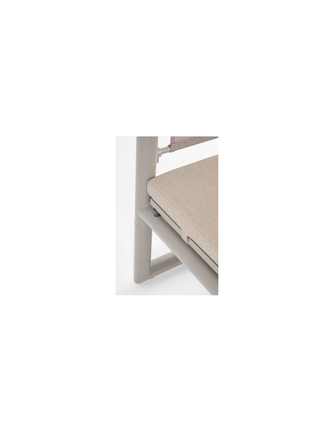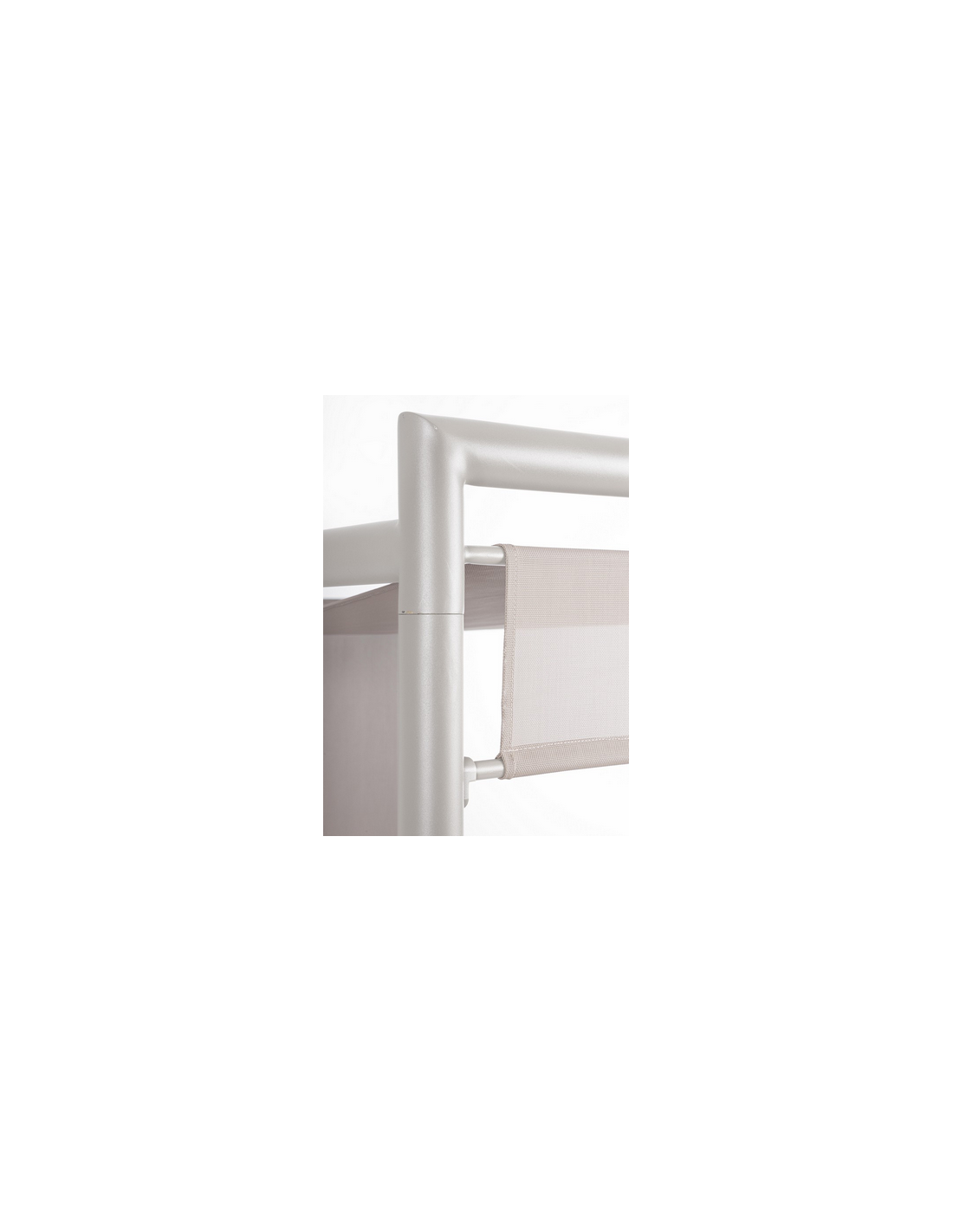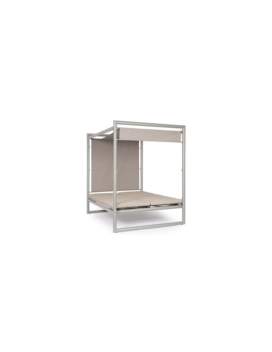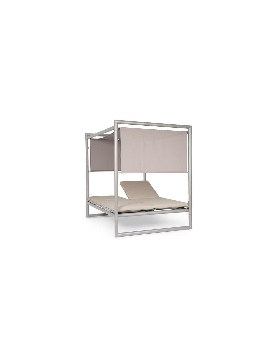 Dobbelt solseng daybed udført i et design af sandgrå pulverlakeret aluminium og beige vandafvisende olefin med quick dry skum. Solsengen måler 48 - 196 cm i højden og 213 x 149 cm i bredde og dybde. Solsengen tåler at stå ude i regnvejr.
