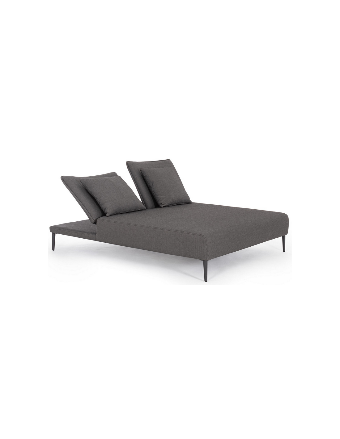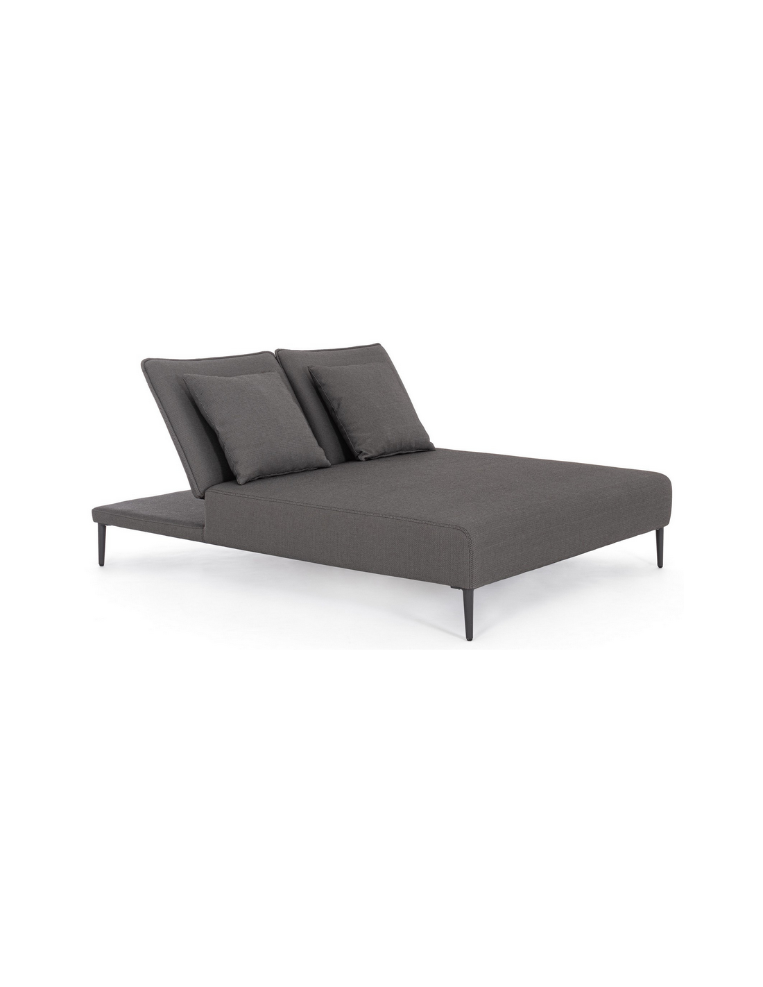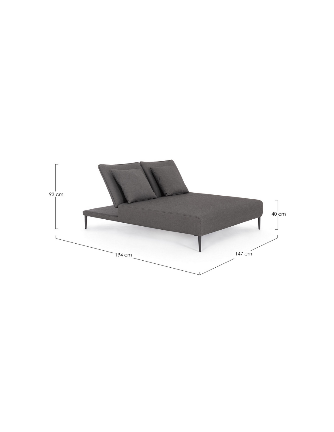 Dobbelt solseng udført i et design af charcoal pulverlakeret aluminium og mørkegrå vandafvisende olefin med quick dry skum. Solsengen måler 40 - 93 cm i højden og 194 x 147 cm i bredde og dybde. Solsengen tåler at stå ude i regnvejr.