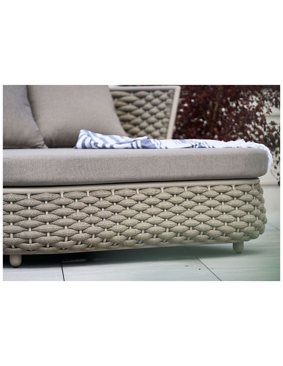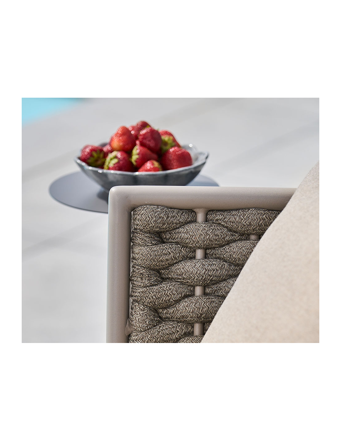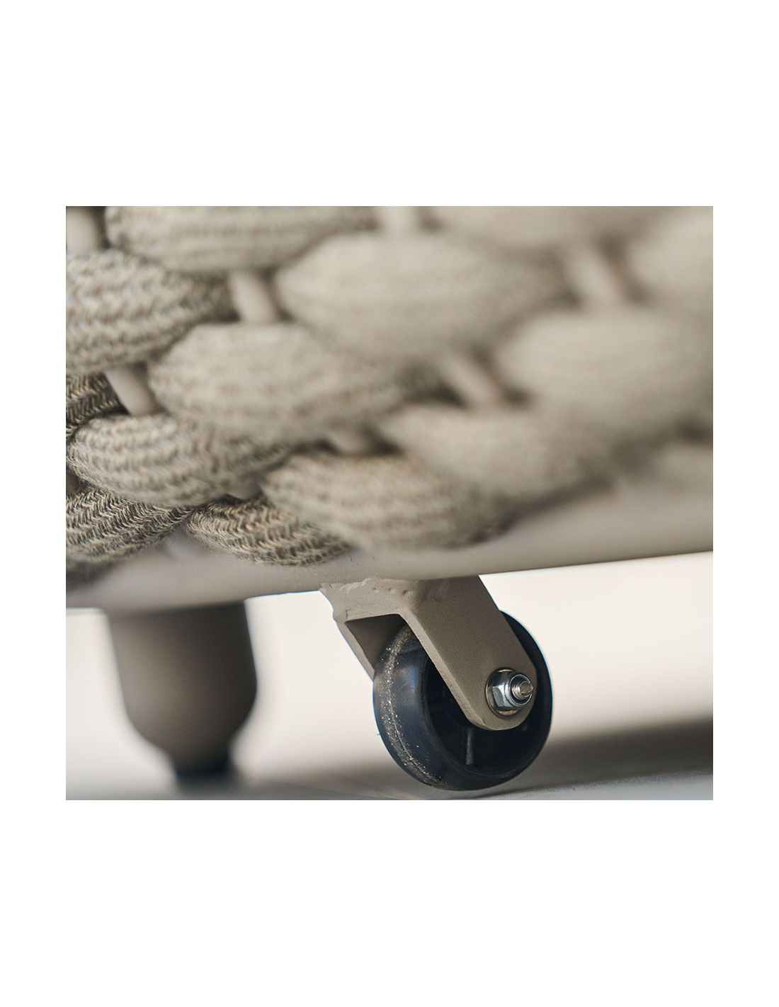 Moderne solseng fra Svenske Hillerstorp, udført i et stilrent design af taupefarvet lakeret aluminium og med hynder i vandafvisende og UV resistent taupefarvet akryl tekstil. Solsengen måler 173 x 171 cm i bredde og dybde og flyttes let via hjulene. Sidde-/liggehøjden er 34 cm.
