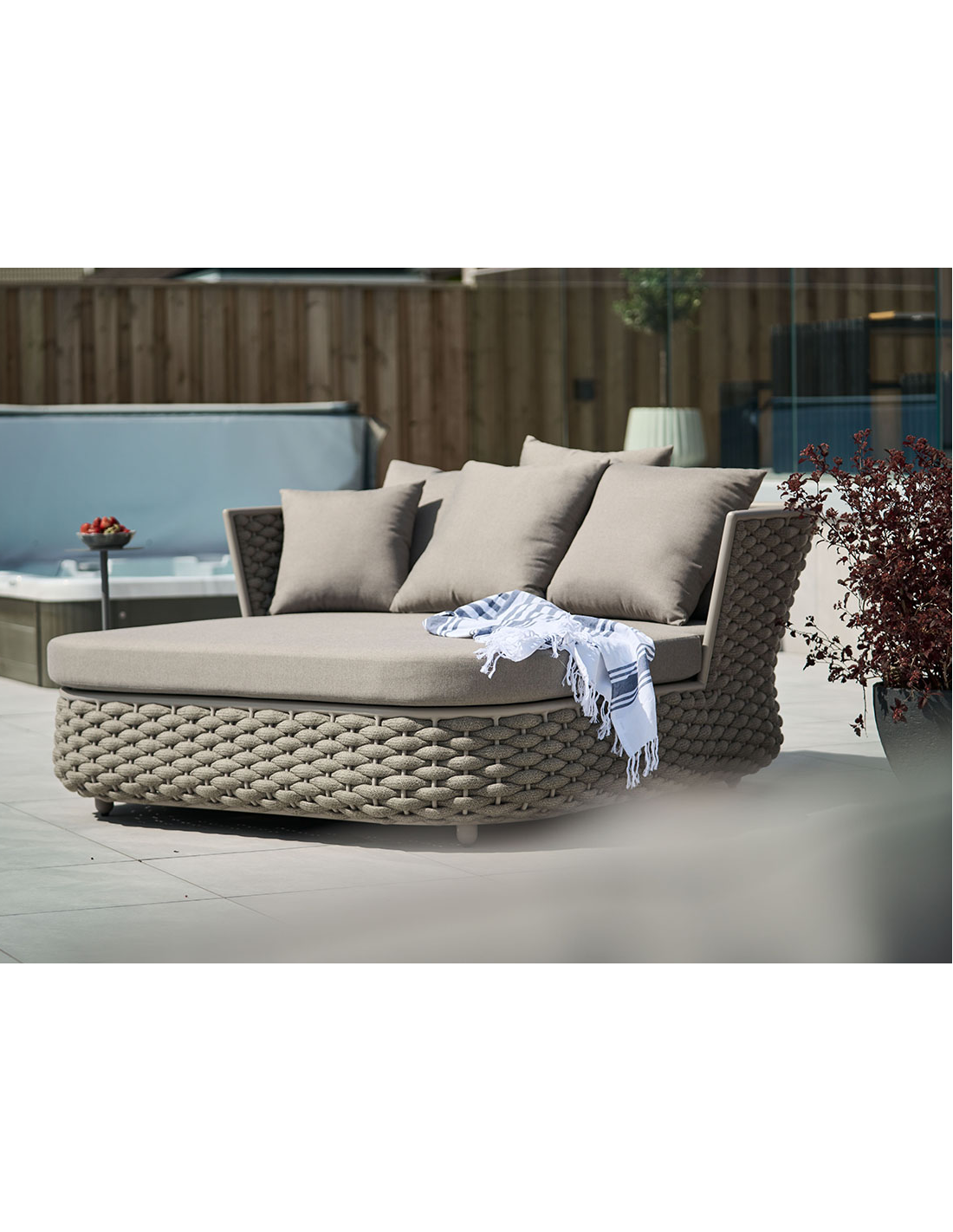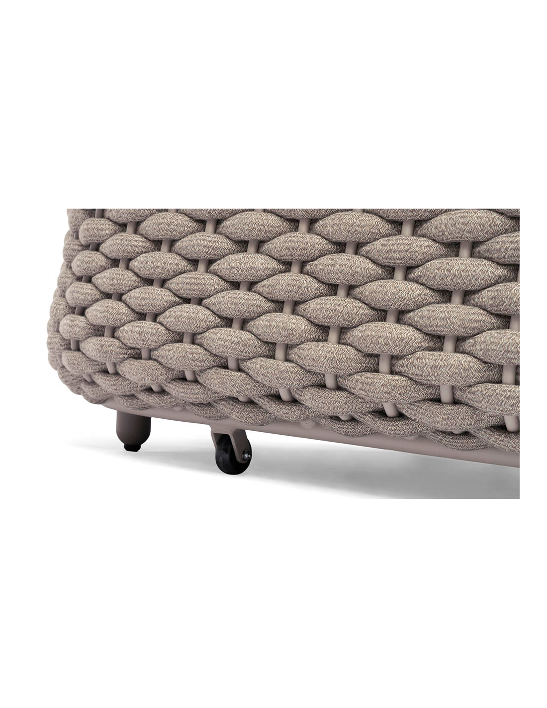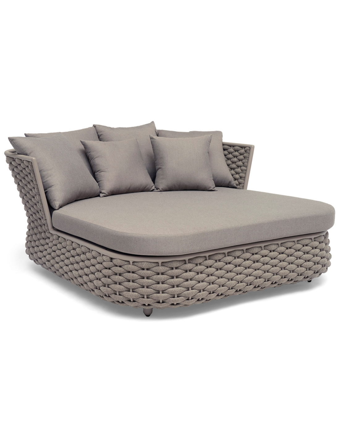 Moderne solseng fra Svenske Hillerstorp, udført i et stilrent design af taupefarvet lakeret aluminium og med hynder i vandafvisende og UV resistent taupefarvet akryl tekstil. Solsengen måler 173 x 171 cm i bredde og dybde og flyttes let via hjulene. Sidde-/liggehøjden er 34 cm.