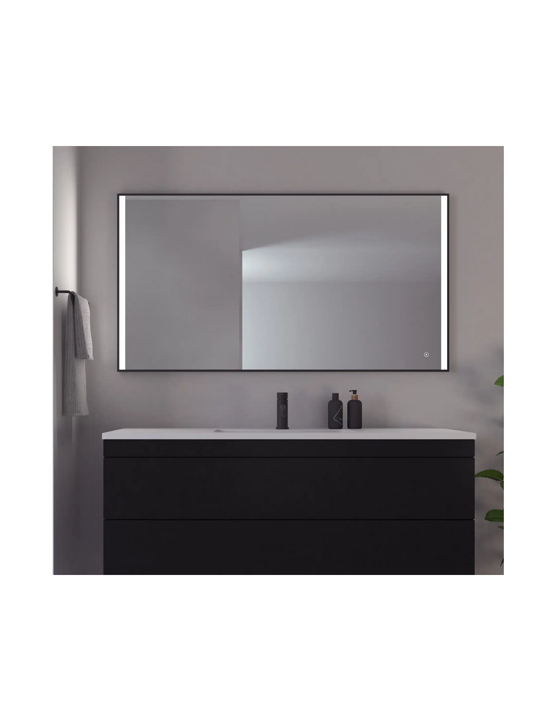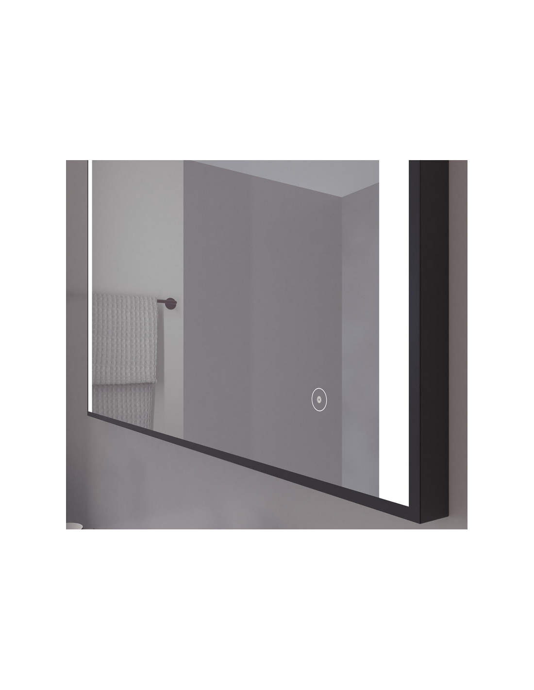 Nyborg badeværelsesspejl med sortlakeret ramme i aluminium, og med touchfunktion, der kan tænde og slukke samt justere lysstyrken på den indbyggede 19W LED belysning. Spejlet måler 75 x 140 cm i højde og bredde.