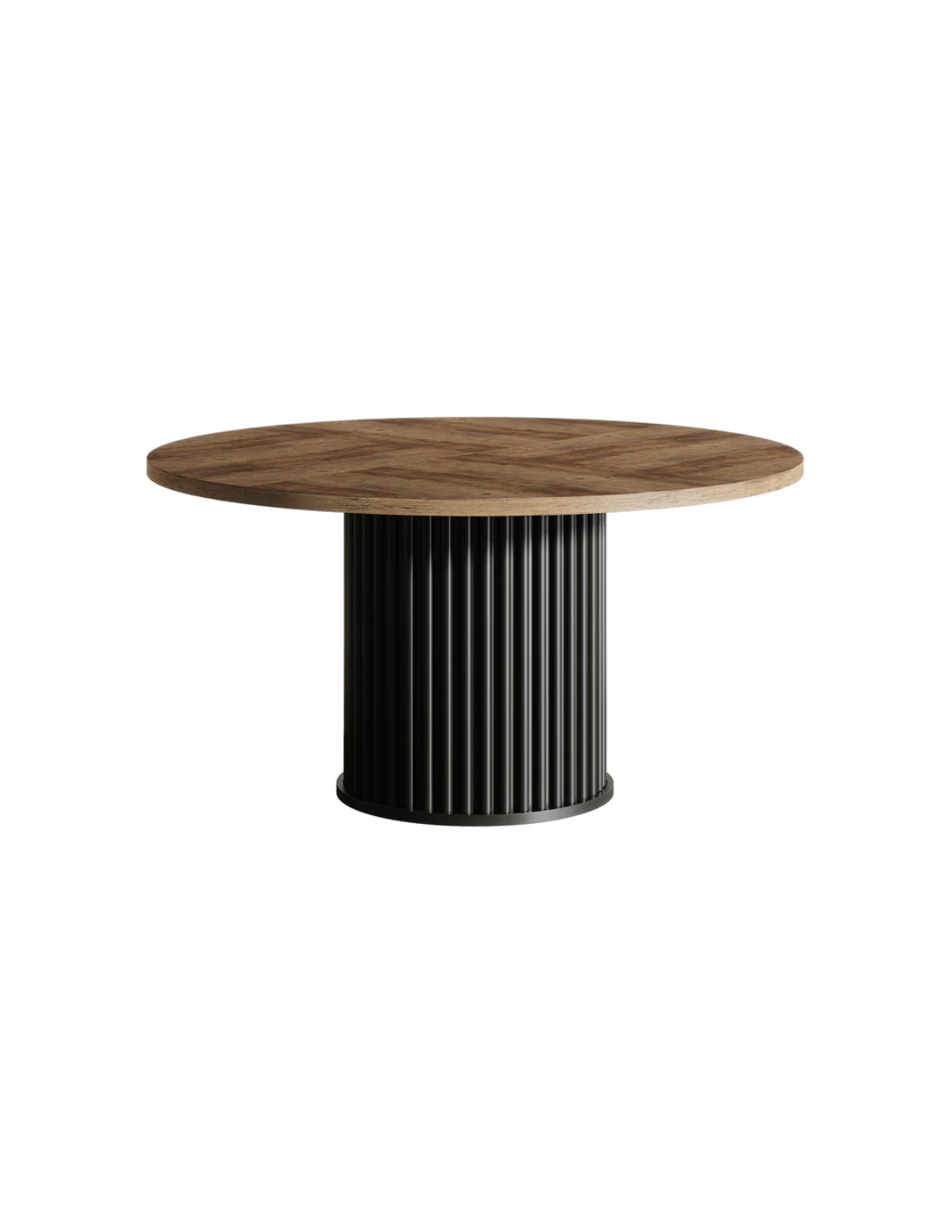 Rundt spisebord udført i et design af sortlakeret metal og sort og vild naturfarvet møbelplade. Bordet måler 76 cm i højden og 120 cm i diameter. Søjlefoden måler 57 cm i diameter.