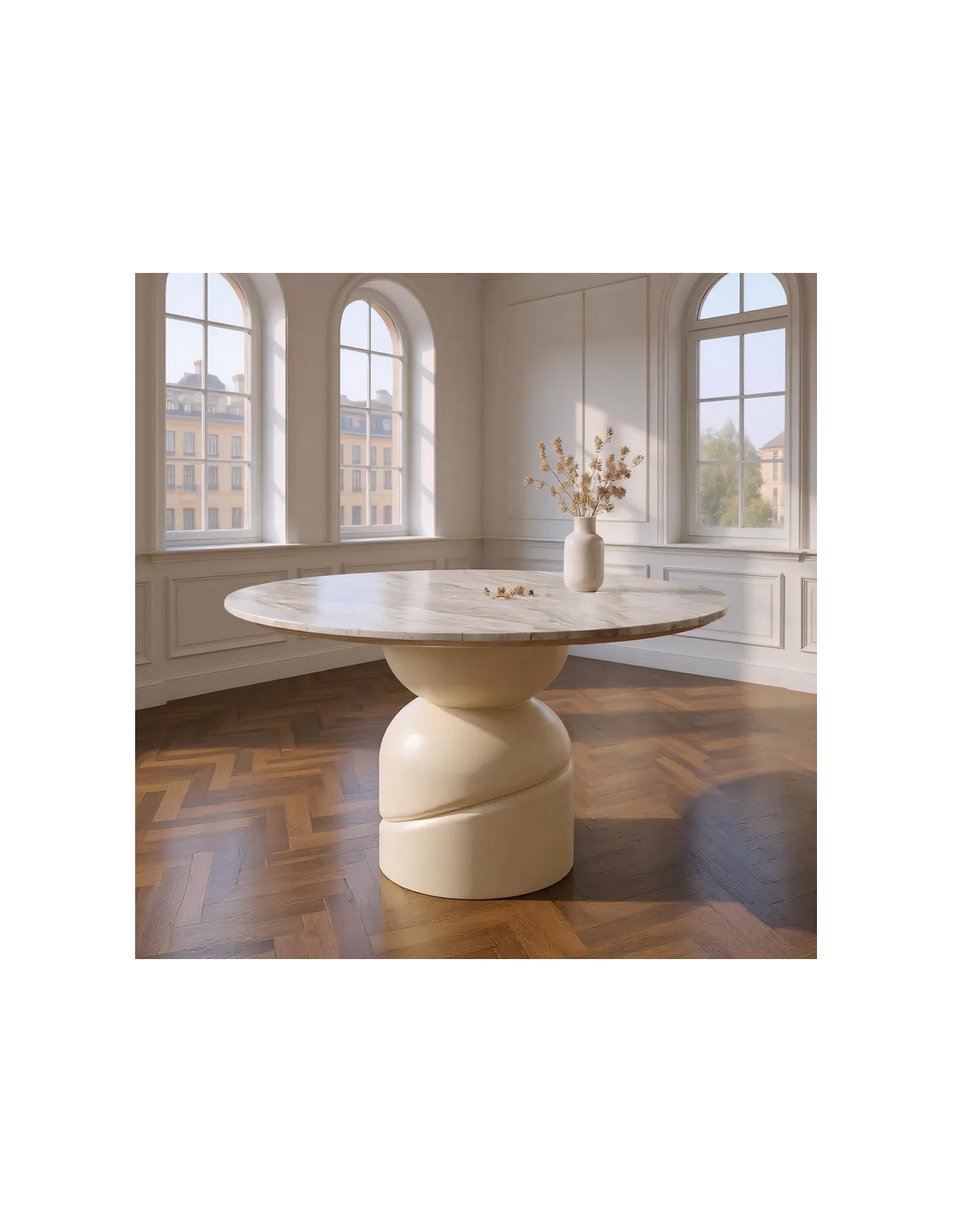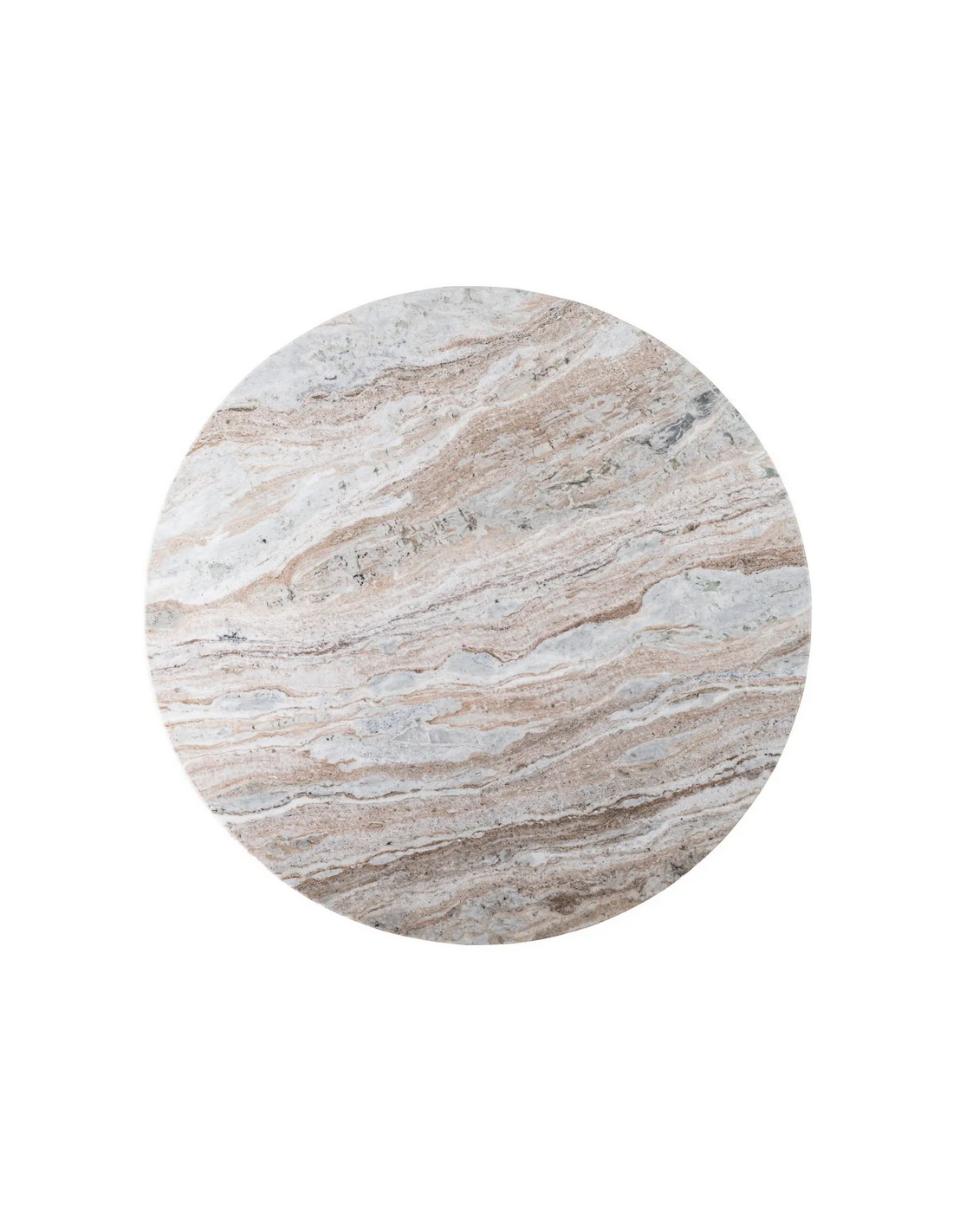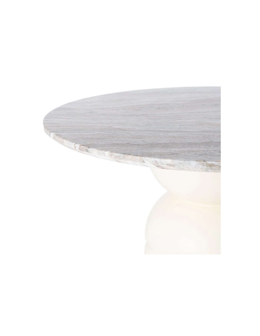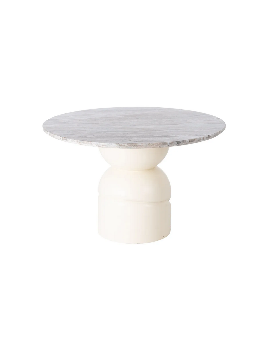 Rundt spisebord udført i et nordisk design af beigelakeret mangotræ og med bordplade i en smuk gråbeige marmor. Spisebordet måler 76 cm i højden og 120 cm i diameter.