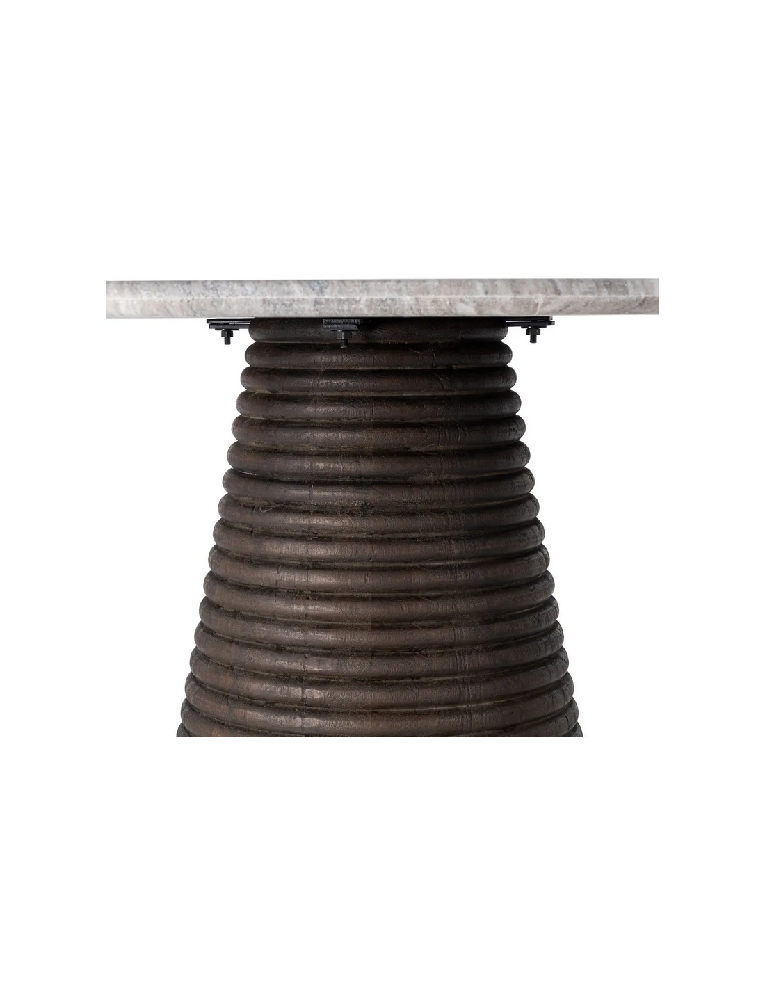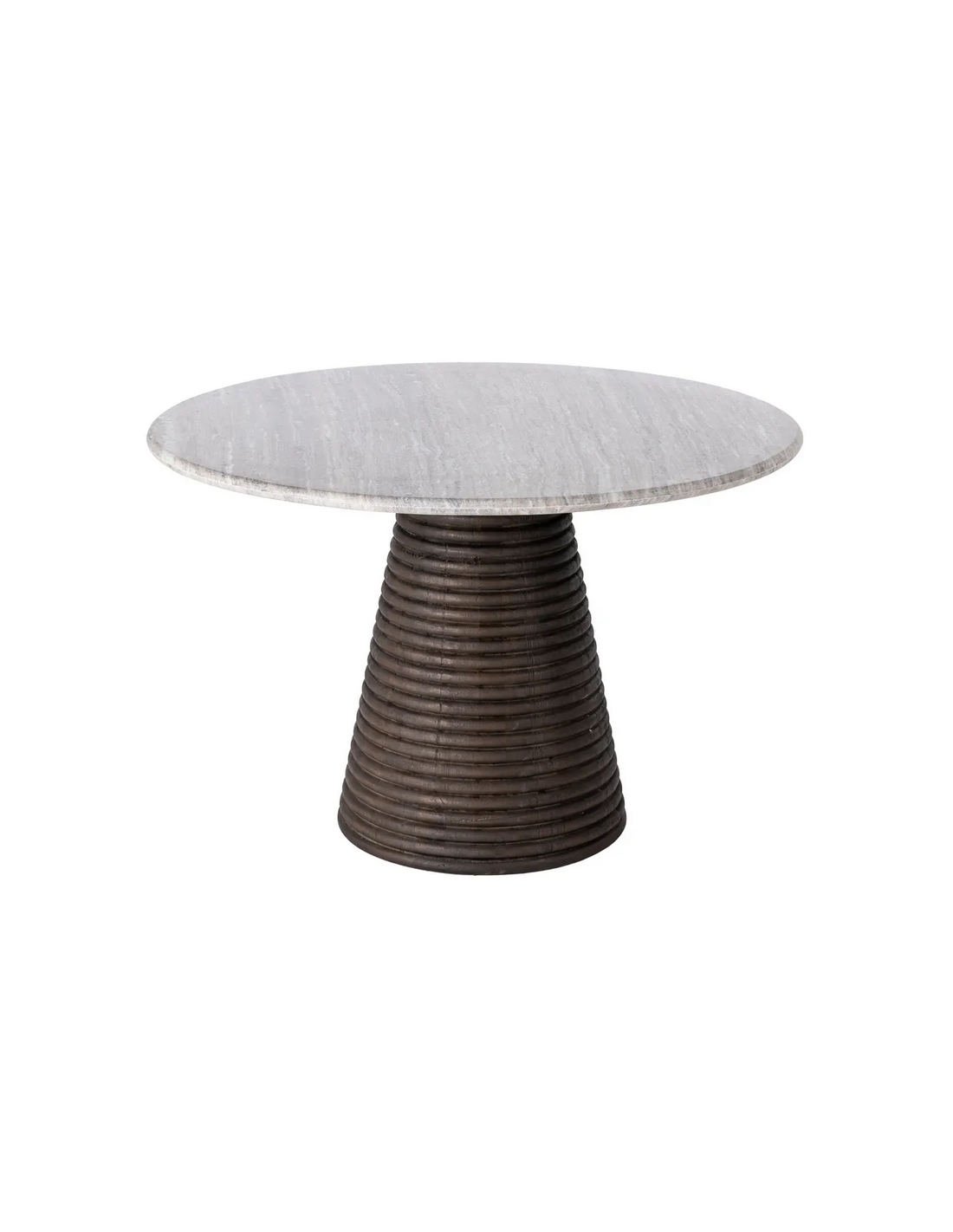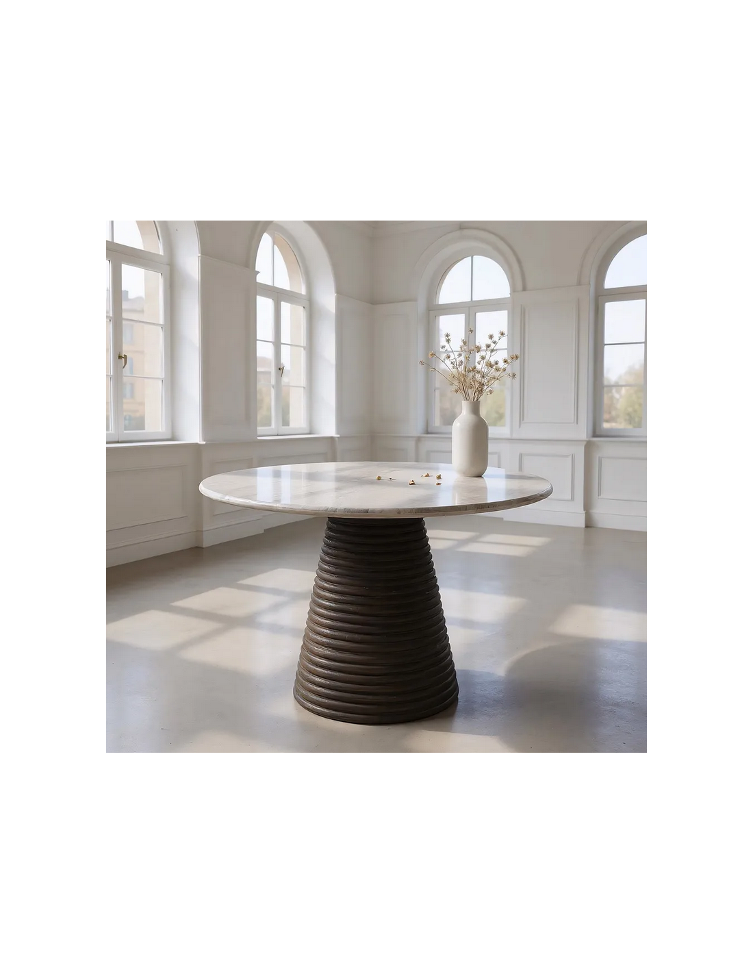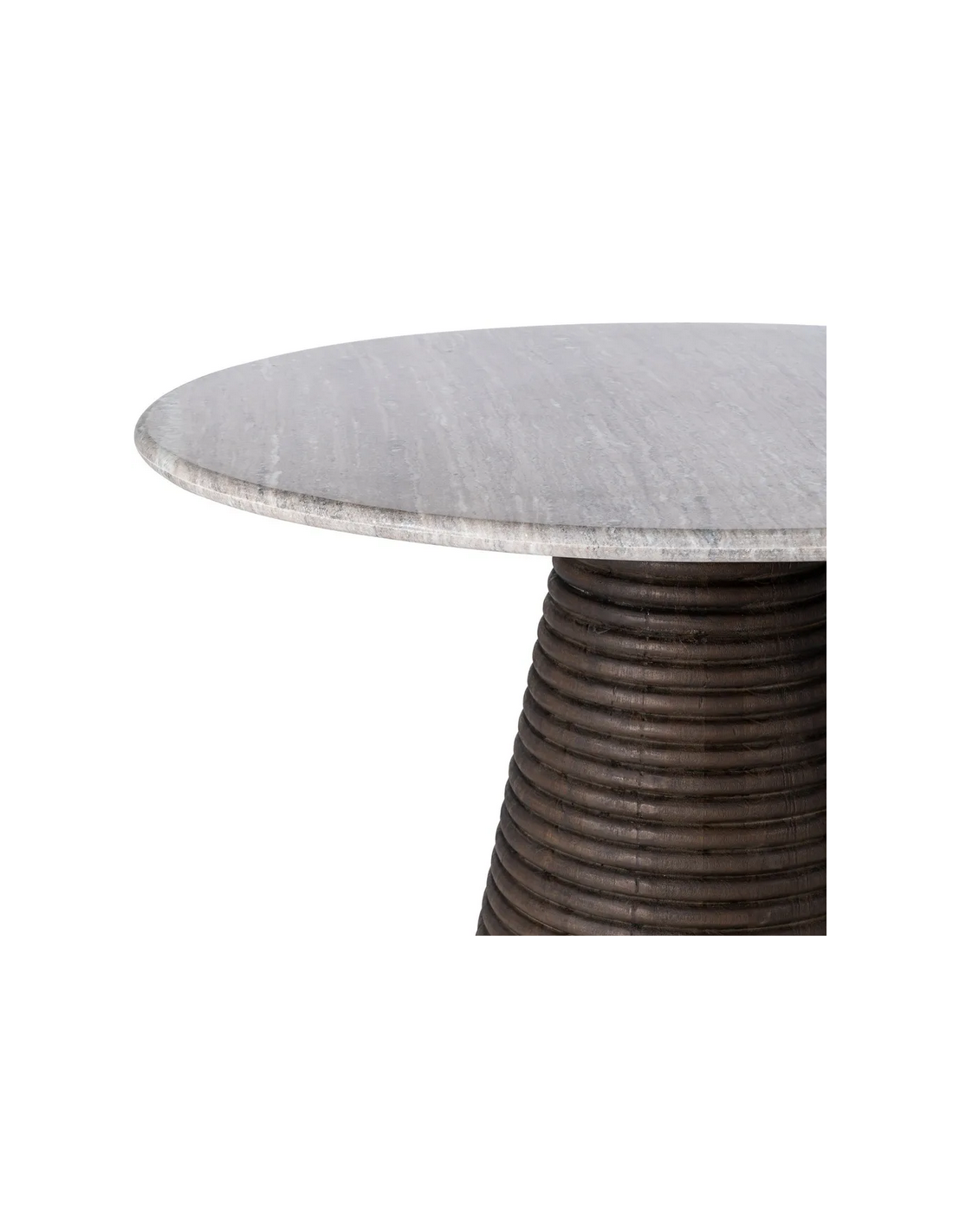 Rundt spisebord udført i et nordisk design af mørkebrun lakeret mangotræ og med bordplade i en smuk grå marmor. Spisebordet måler 76 cm i højden og 115 cm i diameter.