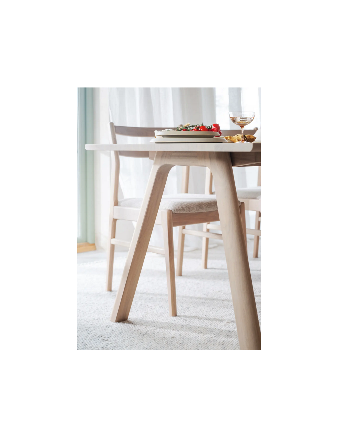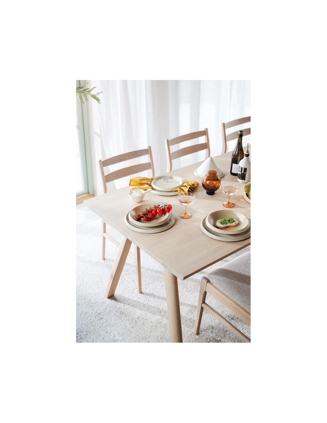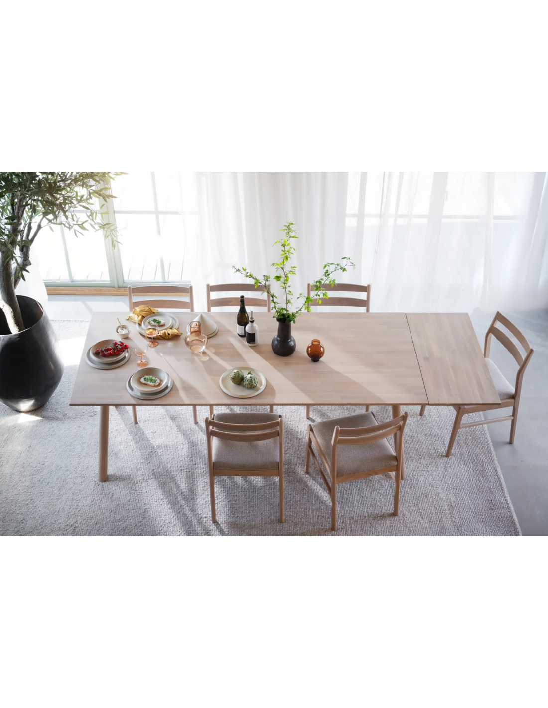Clapperton spisebord fra Svenske Rowico Home, udført i et moderne og Skandinavisk design af white wash egetræ. Spisebordet måler 74 cm i højden og 220 x 95 cm i bredde og dybde. Der kan fås tillægsplader til spisebordet.