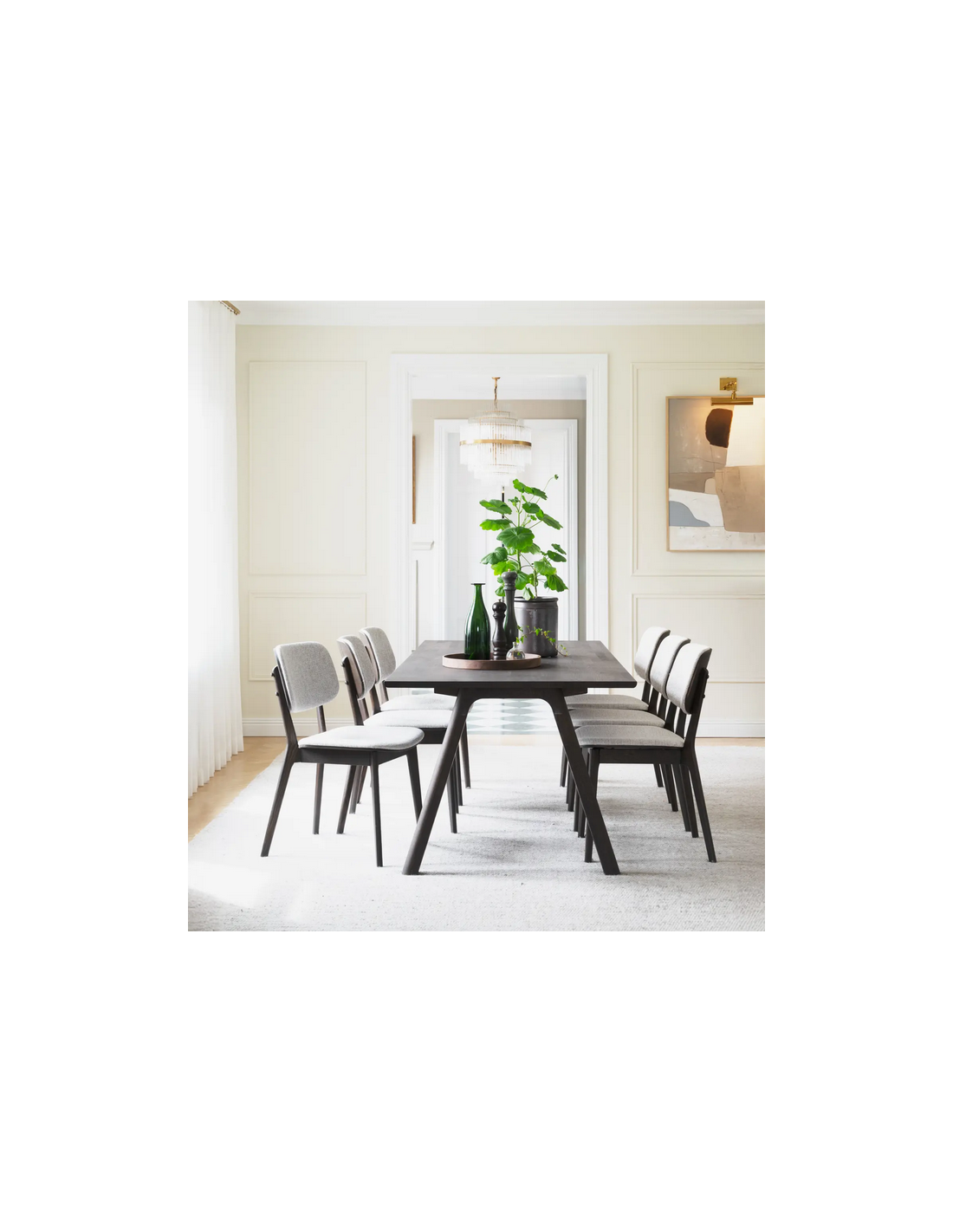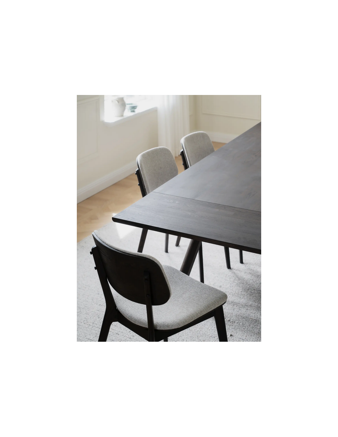 Clapperton spisebord fra Svenske Rowico Home, udført i et moderne og Skandinavisk design af brunolieret egetræ. Spisebordet måler 74 cm i højden og 220 x 95 cm i bredde og dybde. Der kan fås tillægsplader til spisebordet.