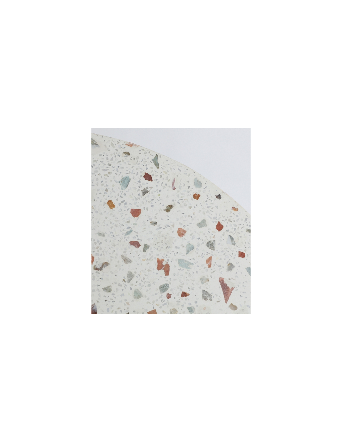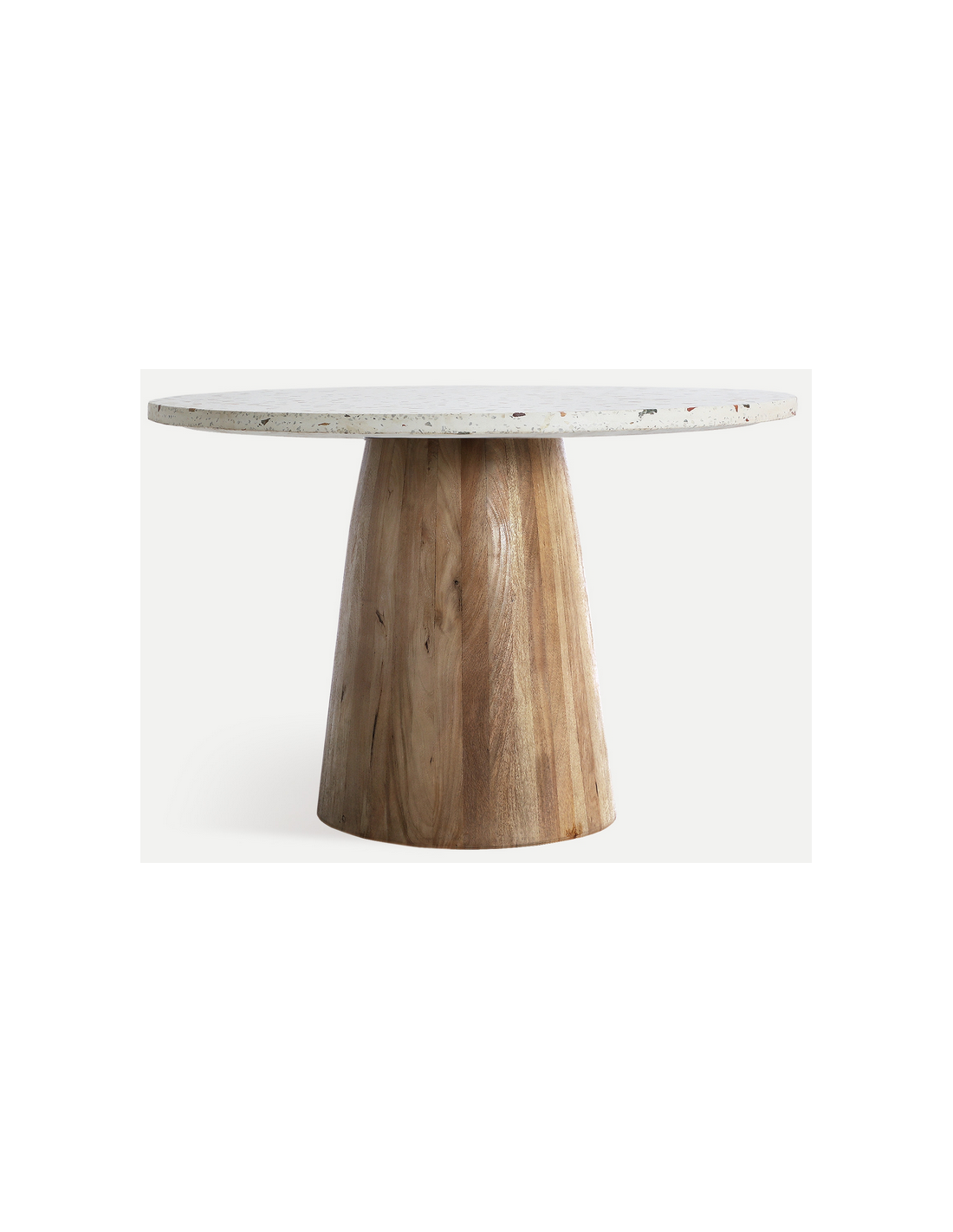 LAUTRE Rundt spisebord udført i et design fremstillet af rustikt naturbrun mangotræ og hvid terrazzo. Spisebordet måler 76 cm i højden og 120 cm i diameter.