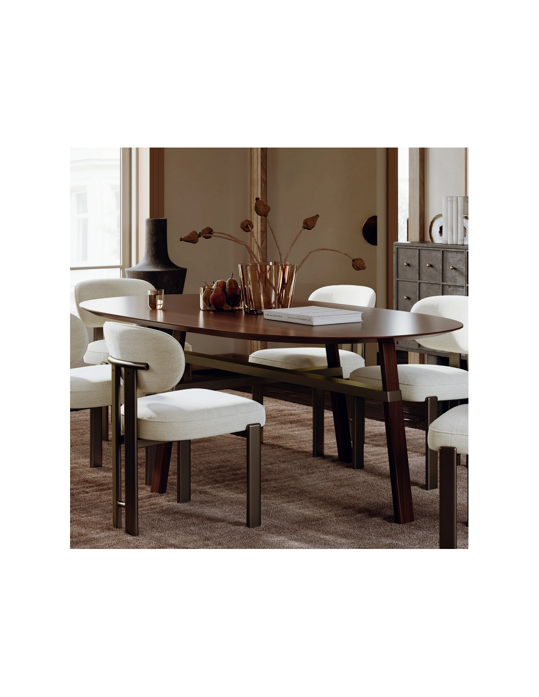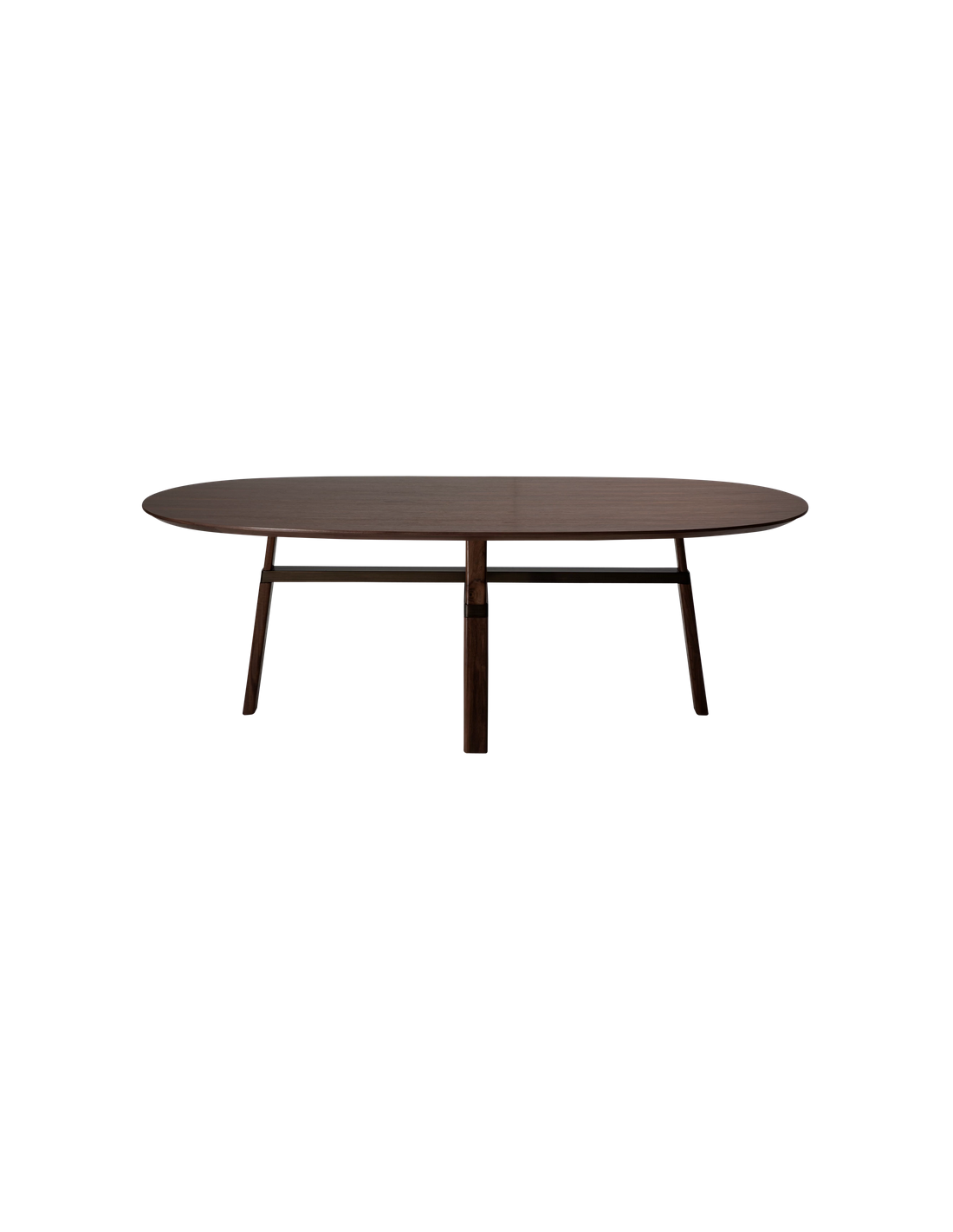 CROSS Ovalt spisebord fra danske Dan-Form, udført i et moderne design af antik børstet messinglakeret metal og valnøddefinér. Spisebordet måler 75 cm i højden og 220 x 111,5 cm i bredde og dybde.
