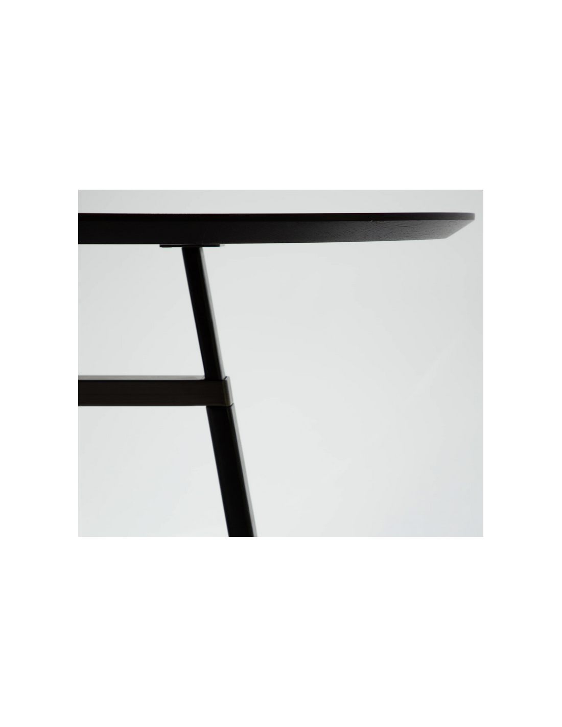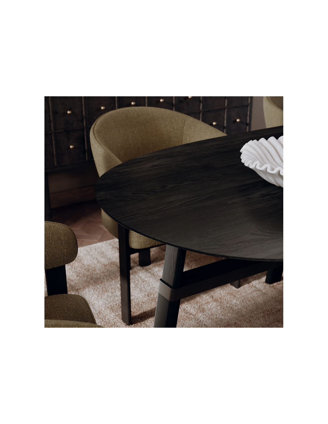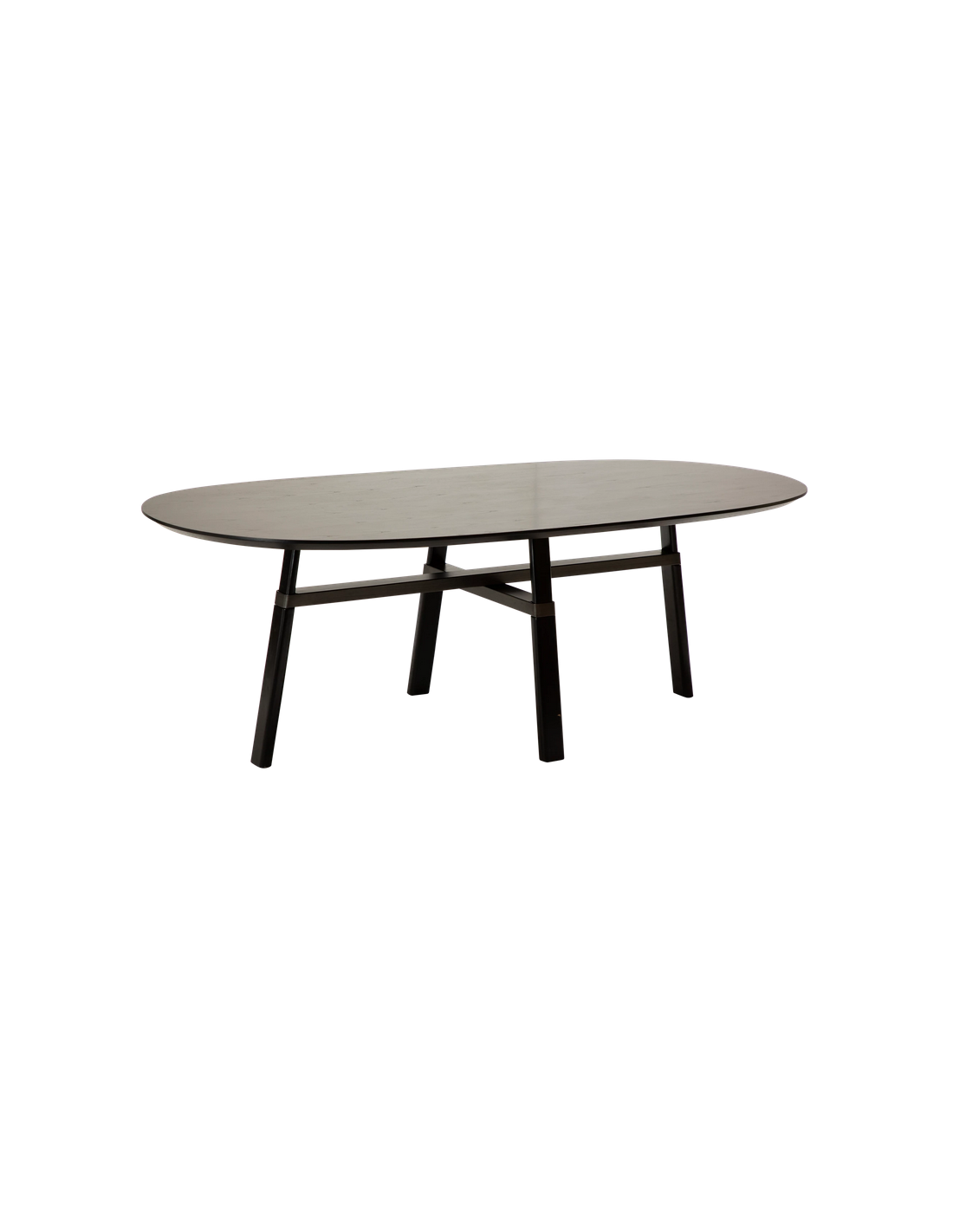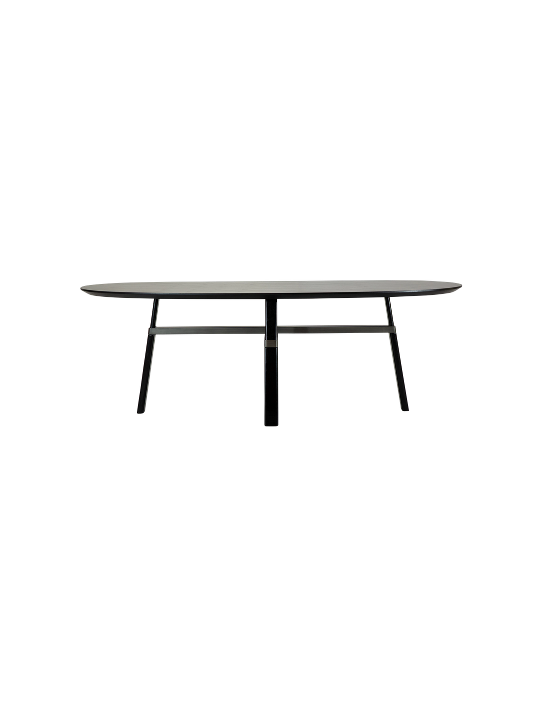 CROSS Ovalt spisebord fra danske Dan-Form, udført i et moderne design af antik børstet tinfarvet metal og sortlakeret asktræfinér. Spisebordet måler 75 cm i højden og 220 x 111,5 cm i bredde og dybde.