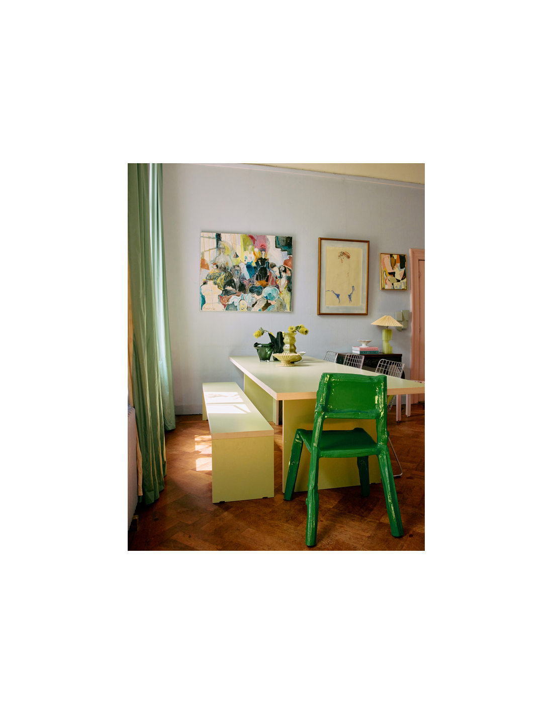 Spisebord udført i et design af pistacie farvet lakeret eurolight træ og mdf. Spisebordet måler 74 cm i højden og 220 x 90 cm i bredde og dybde.