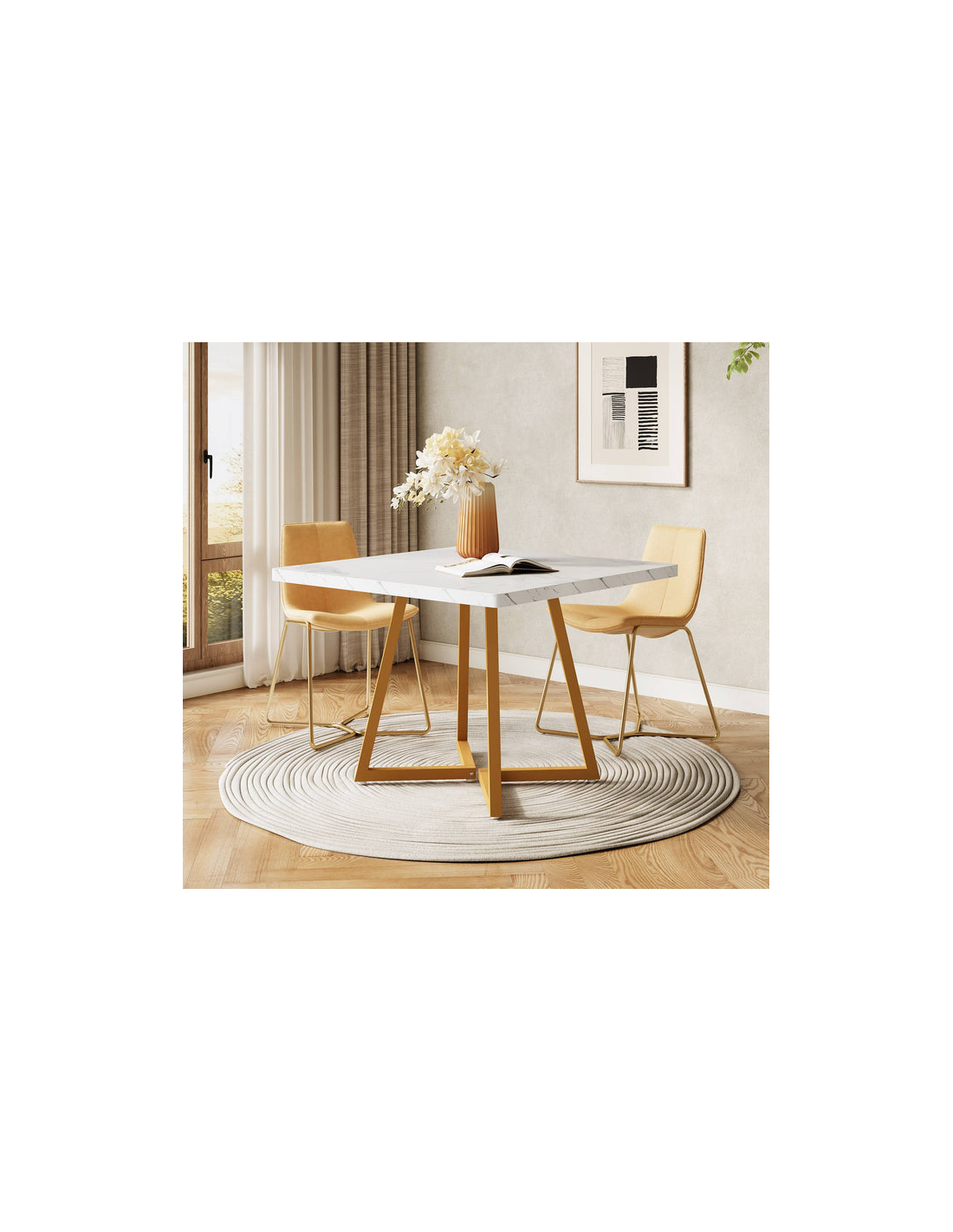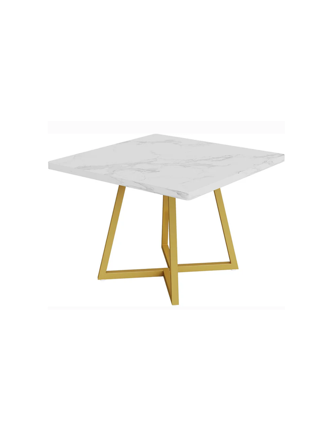 Firkantet spisebord udført i et design af guldfarvet metal og hvid marmoriseret møbelplade. Bordet måler 75 cm i højden og 80 x 80 cm i bredde og dybde.