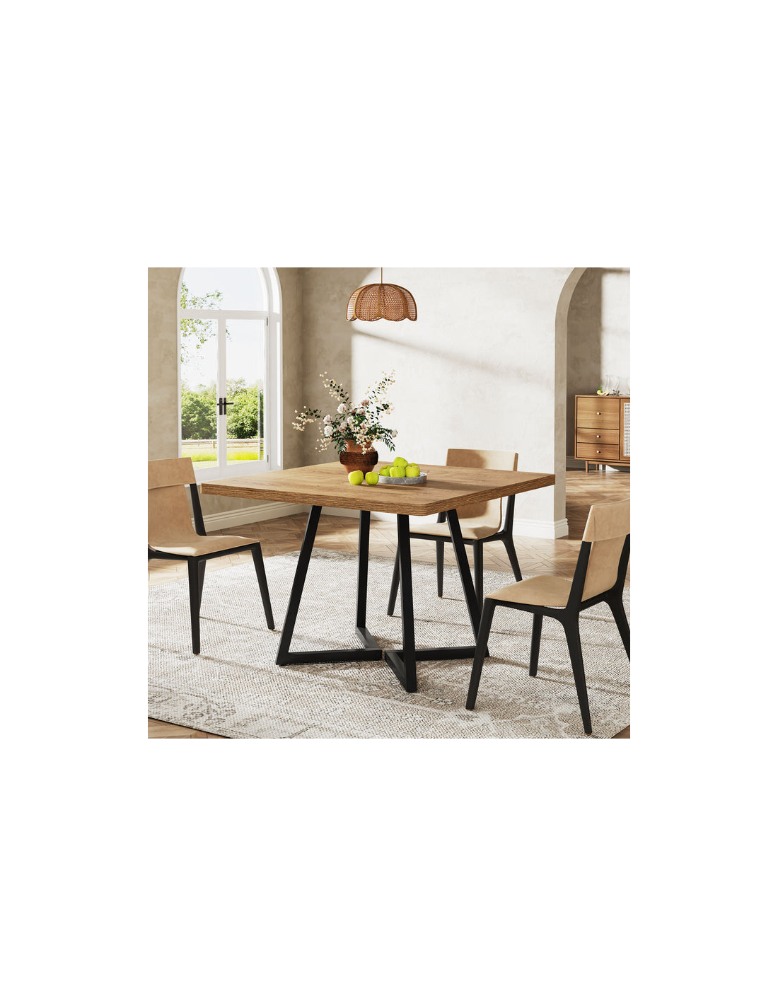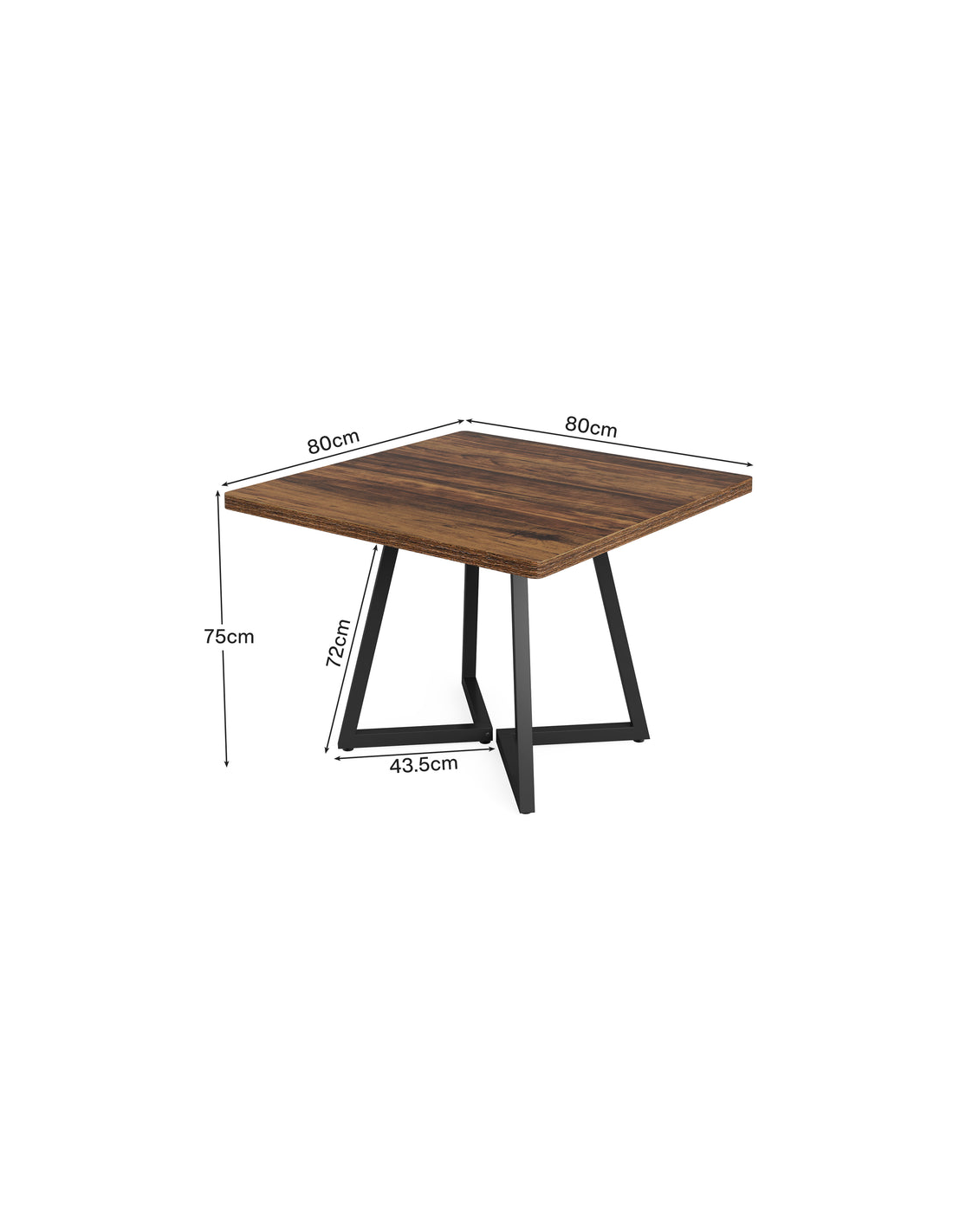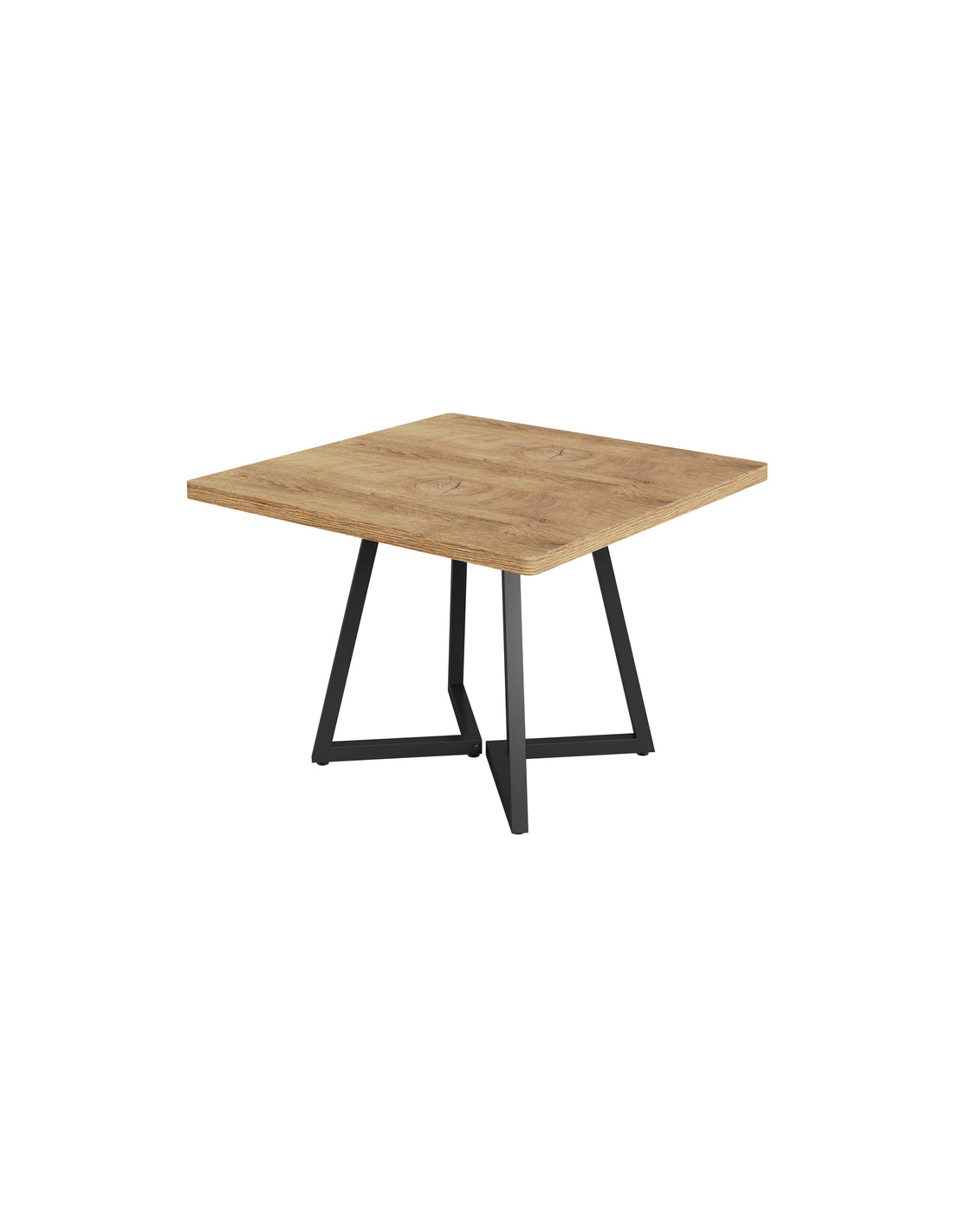 Firkantet spisebord udført i et design af sortlakeret metal og naturbrun møbelplade. Bordet måler 75 cm i højden og 80 x 80 cm i bredde og dybde.