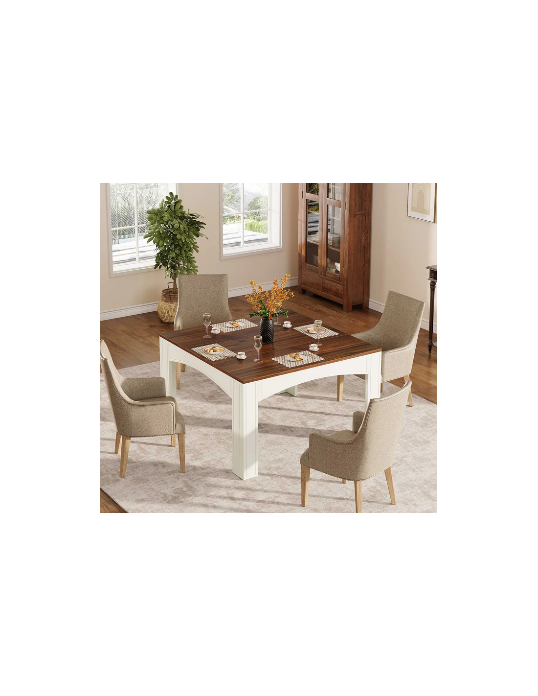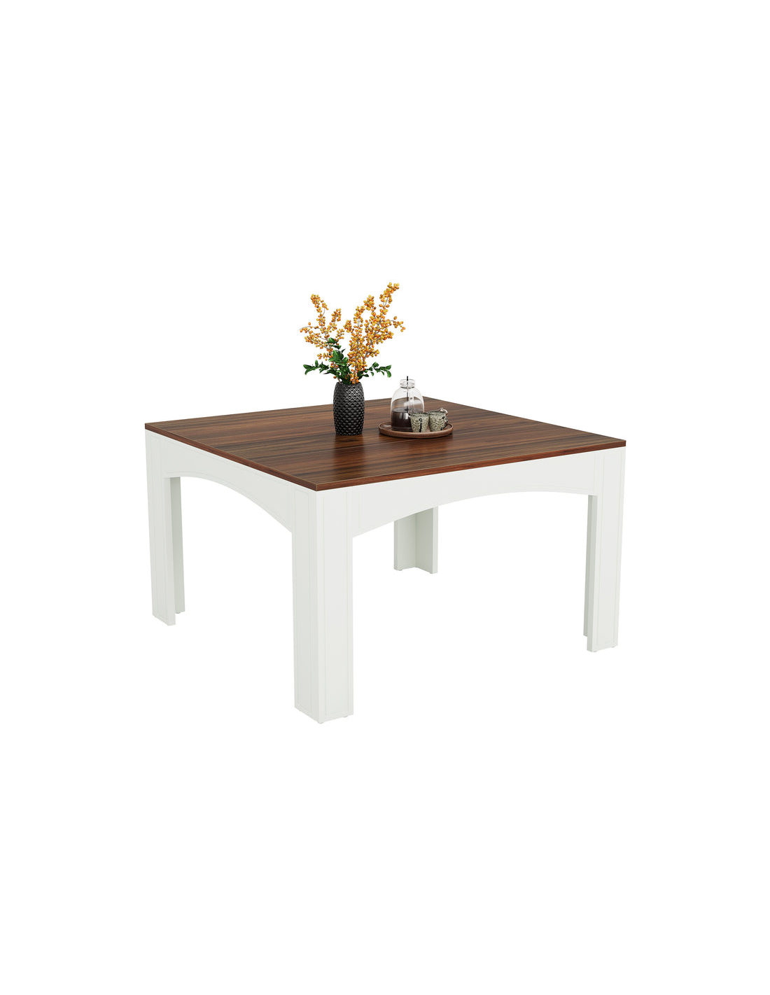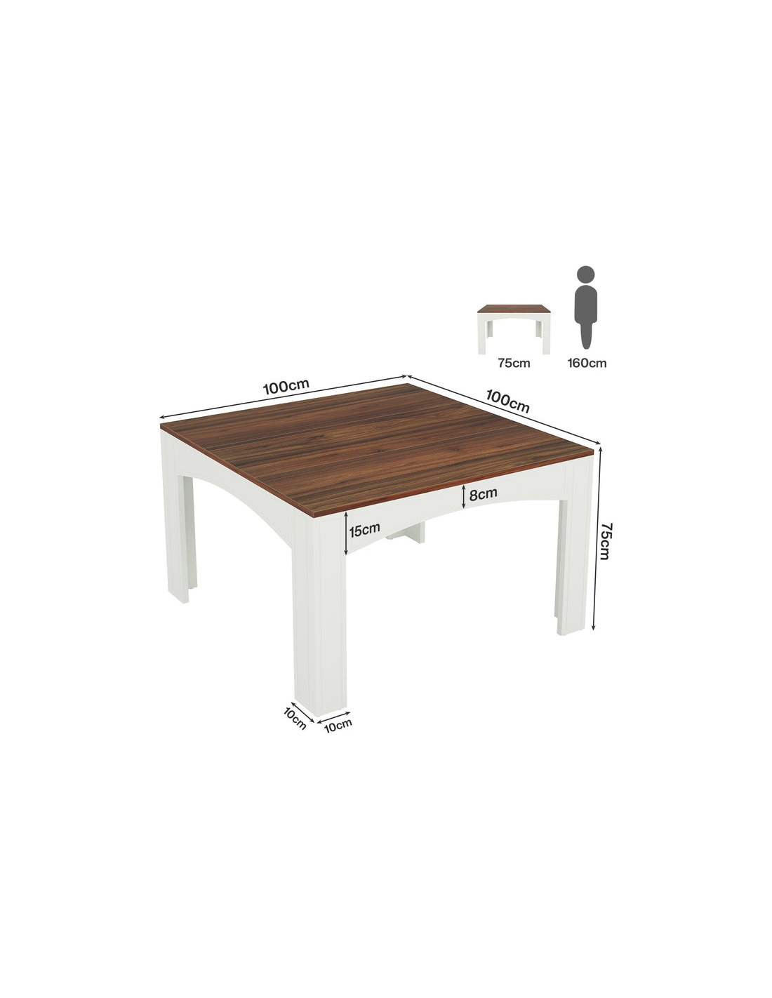Firkantet spisebord udført i et design af hvid og brun møbelplade. Bordet måler 75 cm i højden og 100 x 100 cm i bredde og dybde.