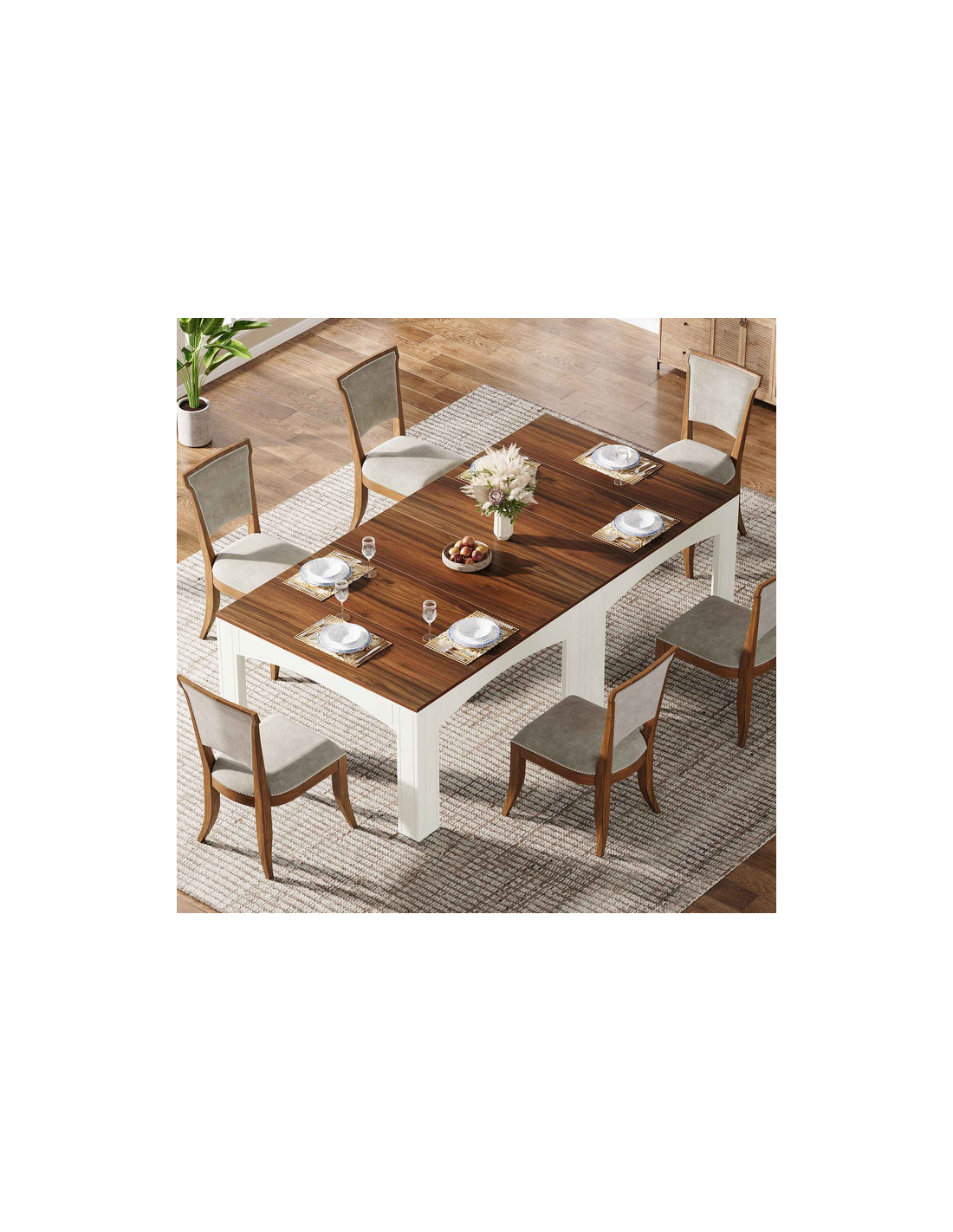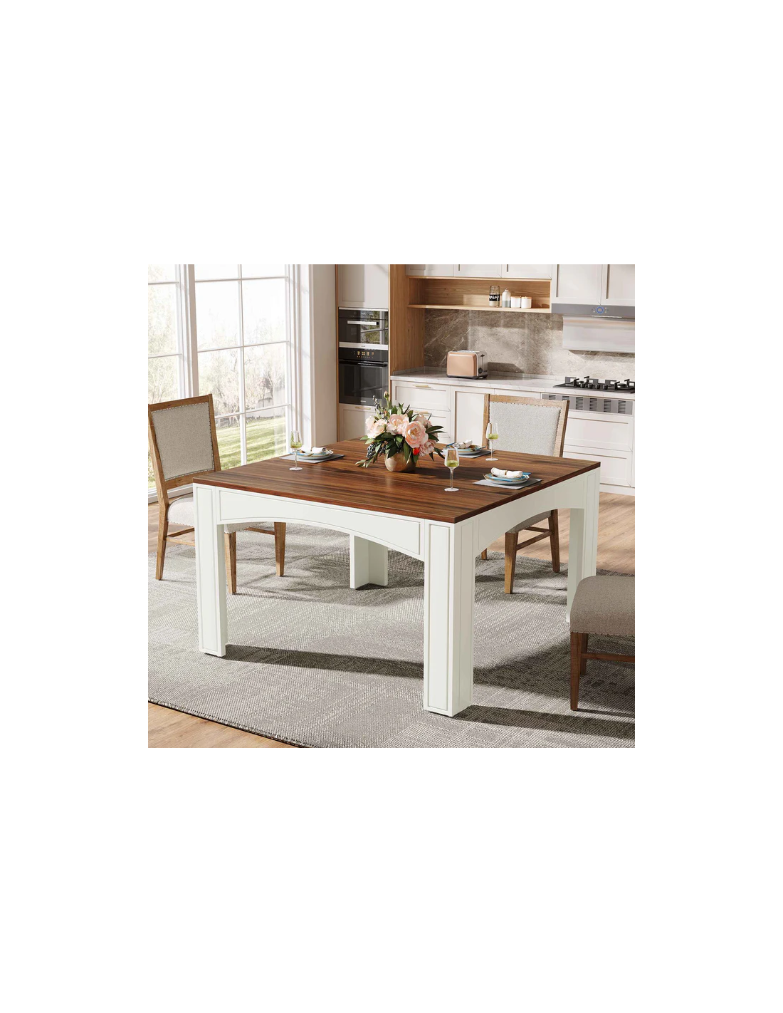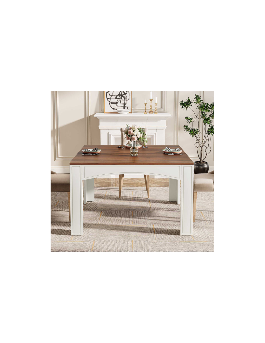 Firkantet spisebord udført i et design af hvid og brun møbelplade. Bordet måler 75 cm i højden og 100 x 100 cm i bredde og dybde.